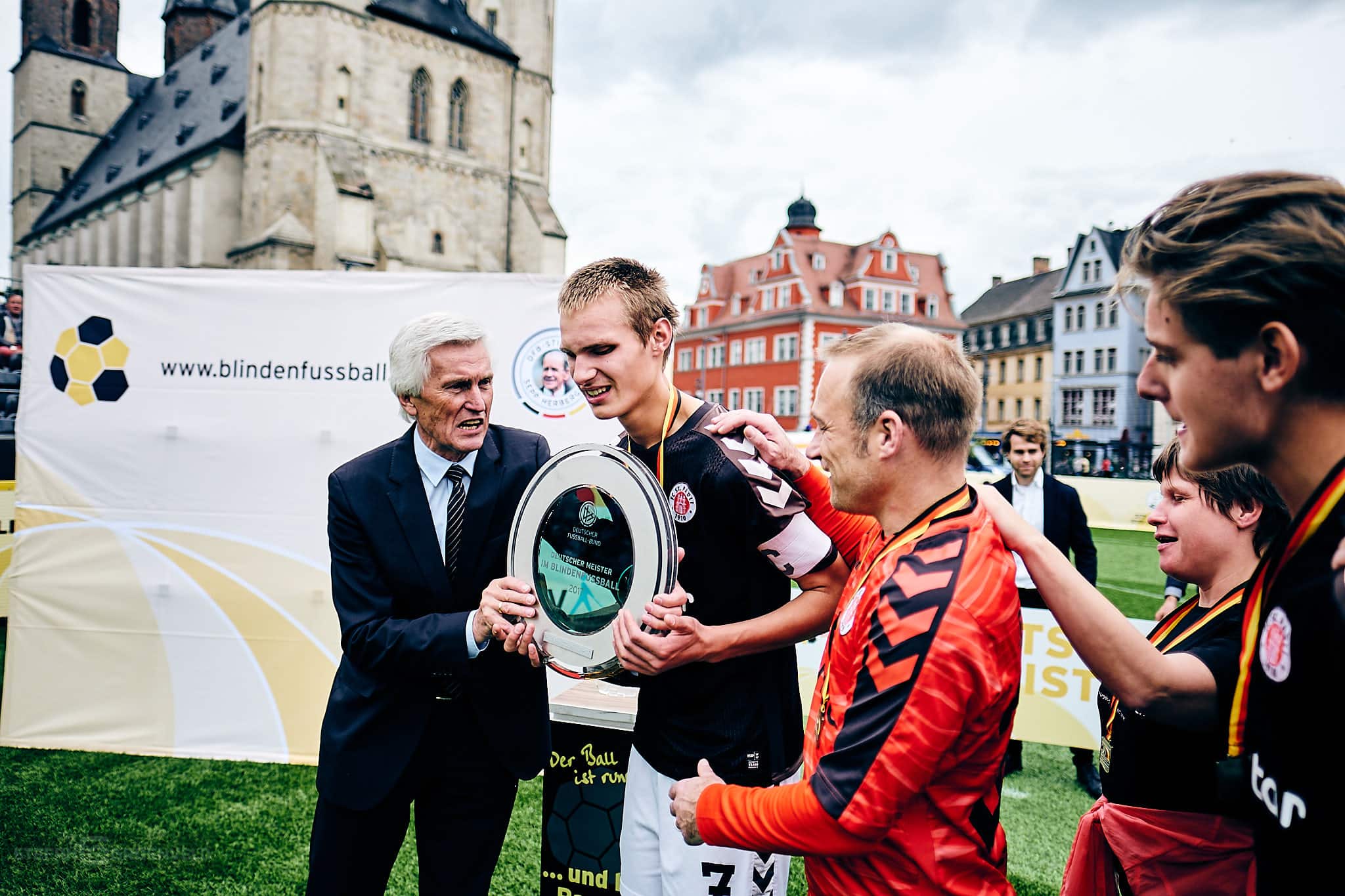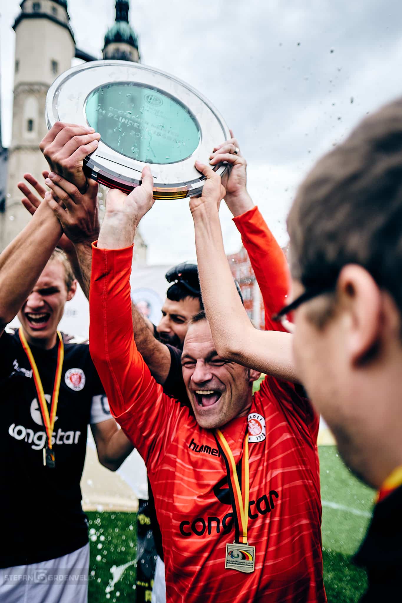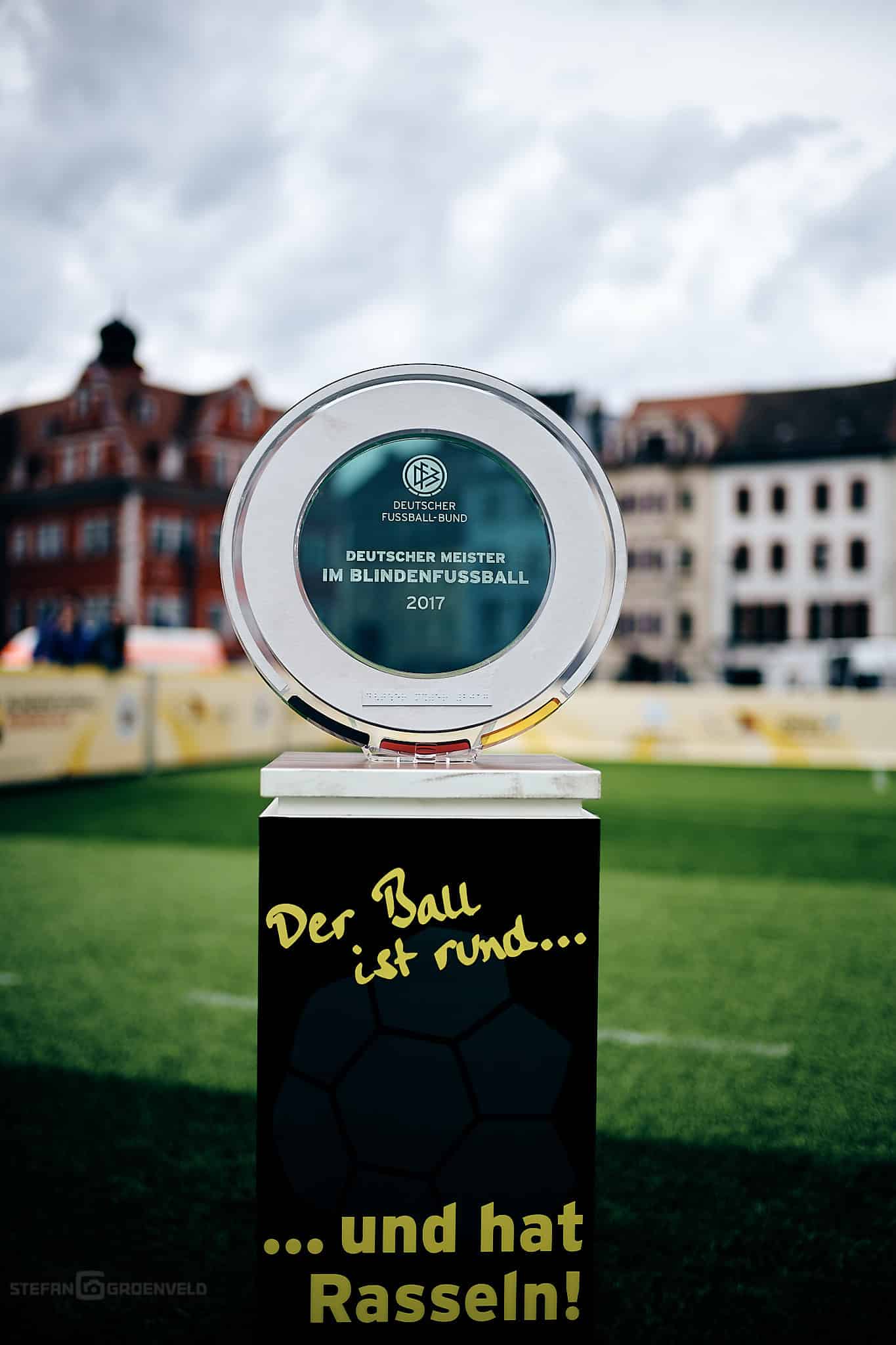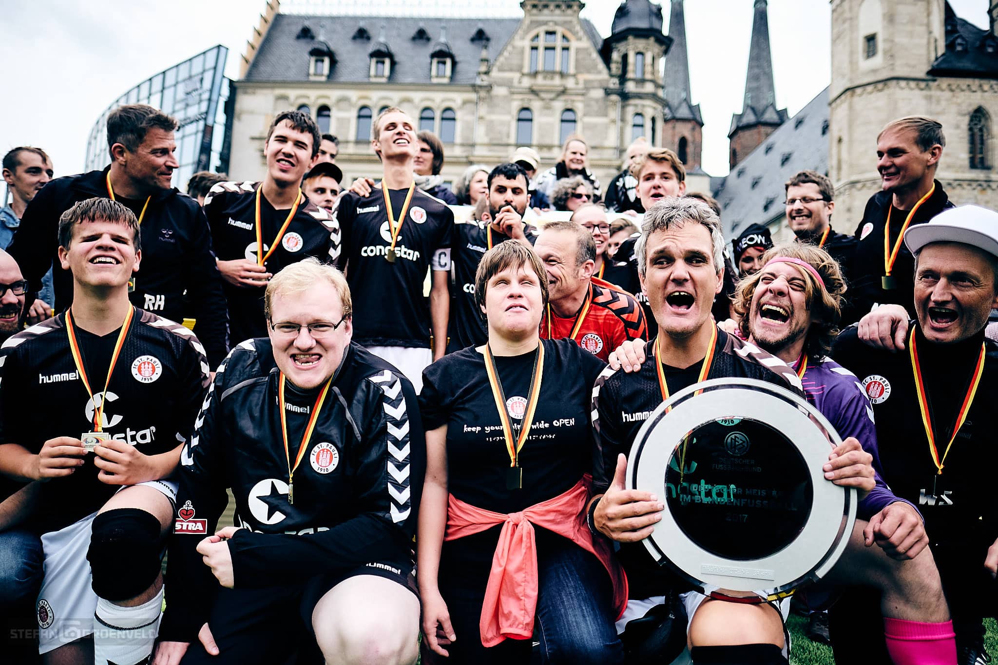 Wie es sich für eine gute deutsche Innenstadt gehört, chillten in der Nähe des Mitten in der Stadt platzierten Spielfelds ein paar Punks. Und natürlich trugen sie St. Pauli Devotionalien und hörten St. Pauli Musik. Ich hatte sie kurz vor dem Spiel entdeckt und freundlich rübergenickt. Da auch ich im Teamoutfit durch die Stadt lief, dämmerte den Jungs, was jetzt gleich nebenan passieren sollte. Spätestens als der Moderator durch die Lautsprecheranlage das Team vom FC St. Pauli begrüßte, hatten der Blindenfussball neue Fans gefunden. Sie verfolgten das Spiel von der Tribüne aus und feierten natürlich am Ende besonders intensiv. Ihr Bier wurde mit der Mannschaft geteilt, weil es sonst nur Sekt gab. Nach dem offiziellen Teil der Mannschaftsehrungen wurde daher die Feier schnell vor die Tribüne verlegt und ein Foto mit Familie und Punks gemacht. Die Jungs haben dann noch für die Zugwegzehrung aka mehr Bier gesorgt, während das Team für die Rückfahrt duschte. Und irgendwie kam das Team auch an das Schild mit der Aufschrift „Deutscher Meister“ von der Siegerehrung.