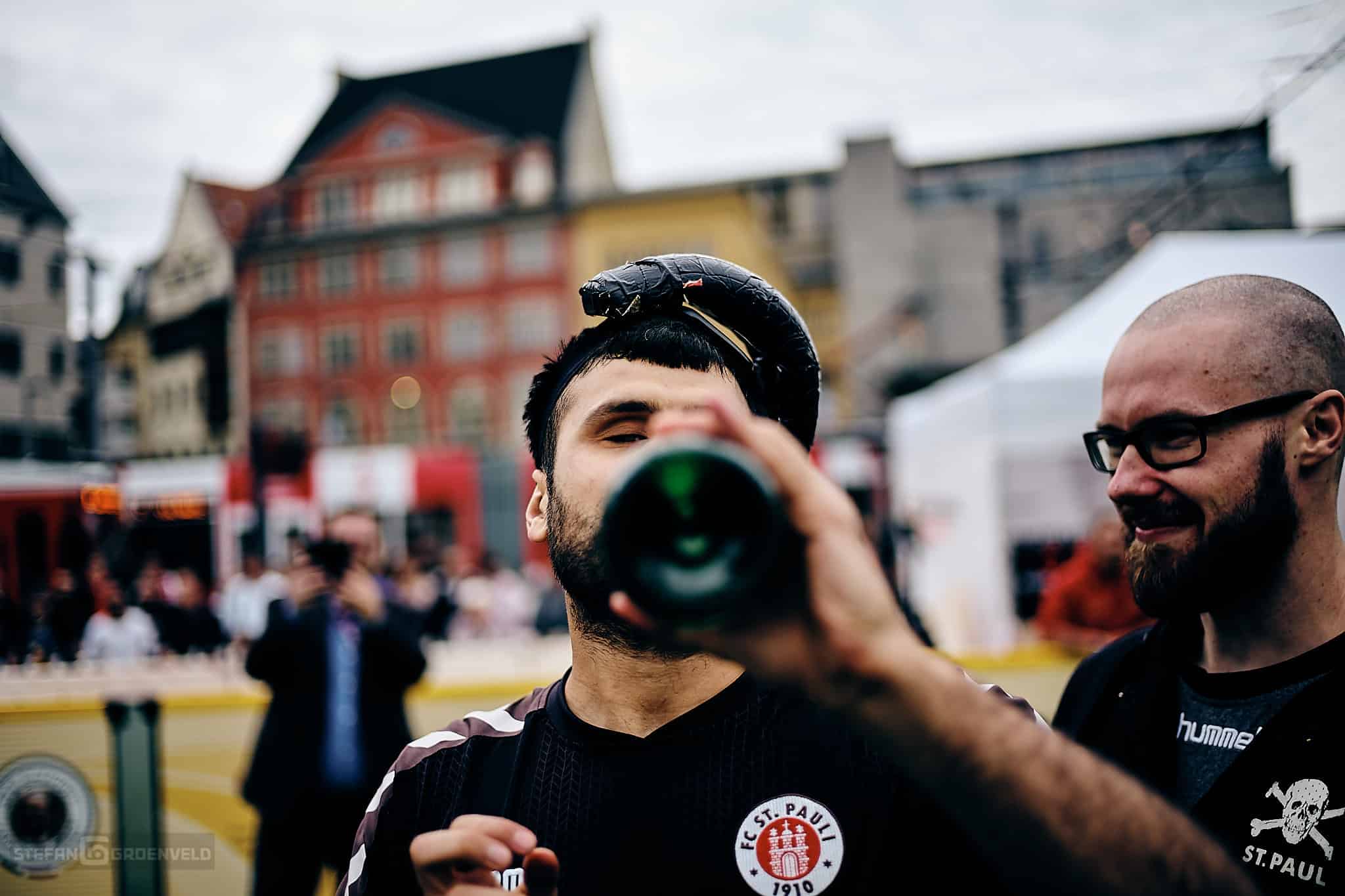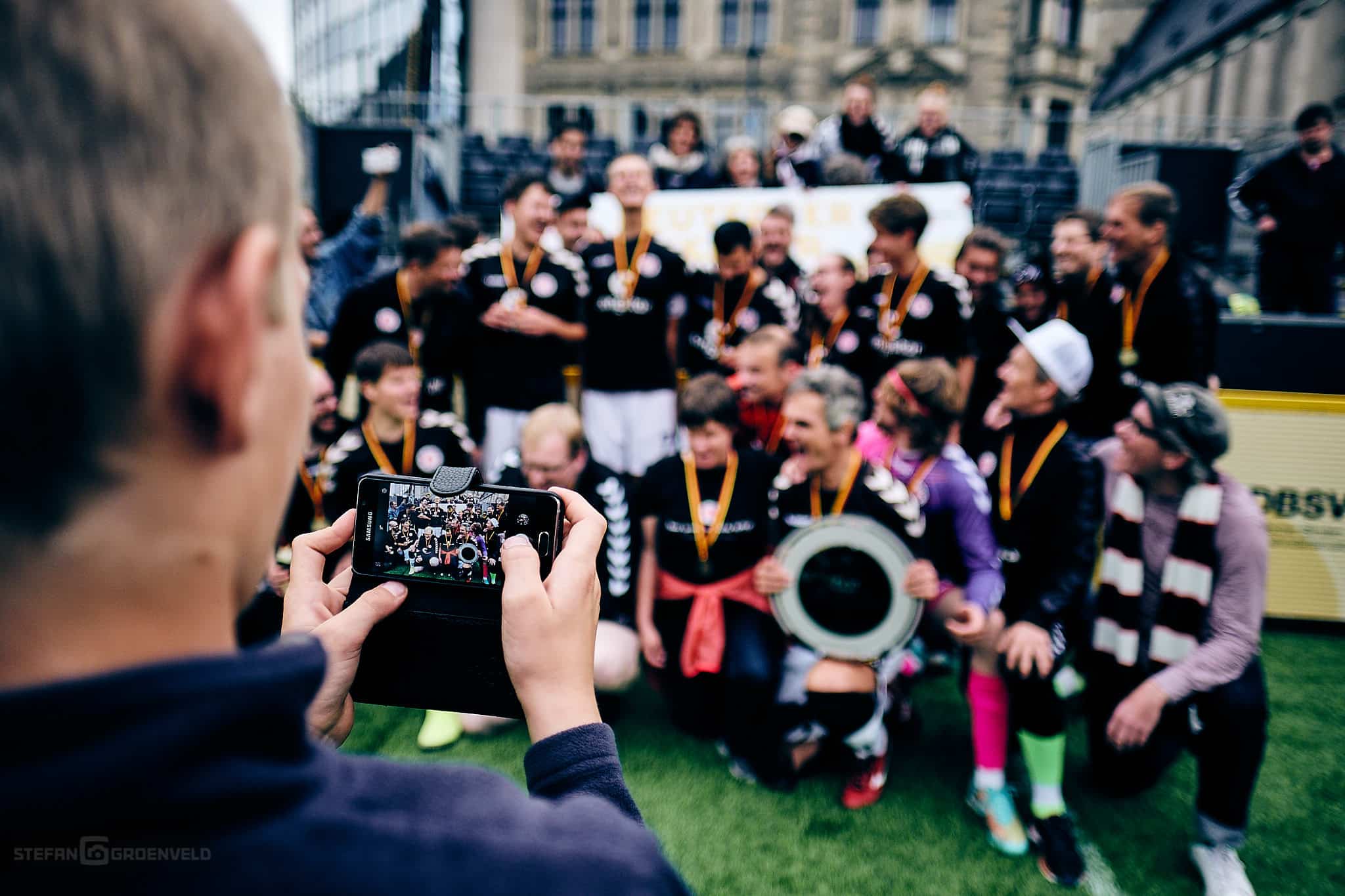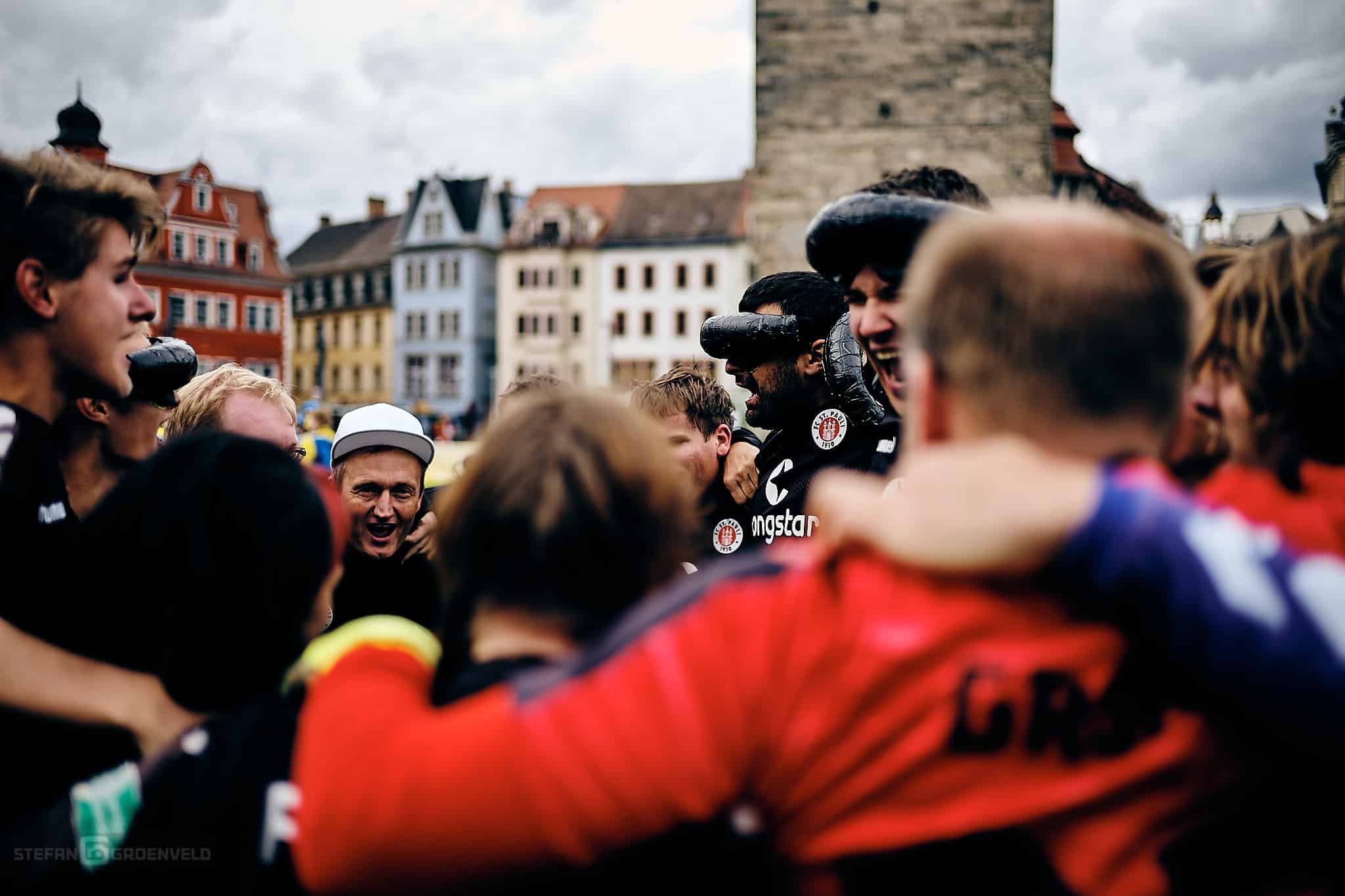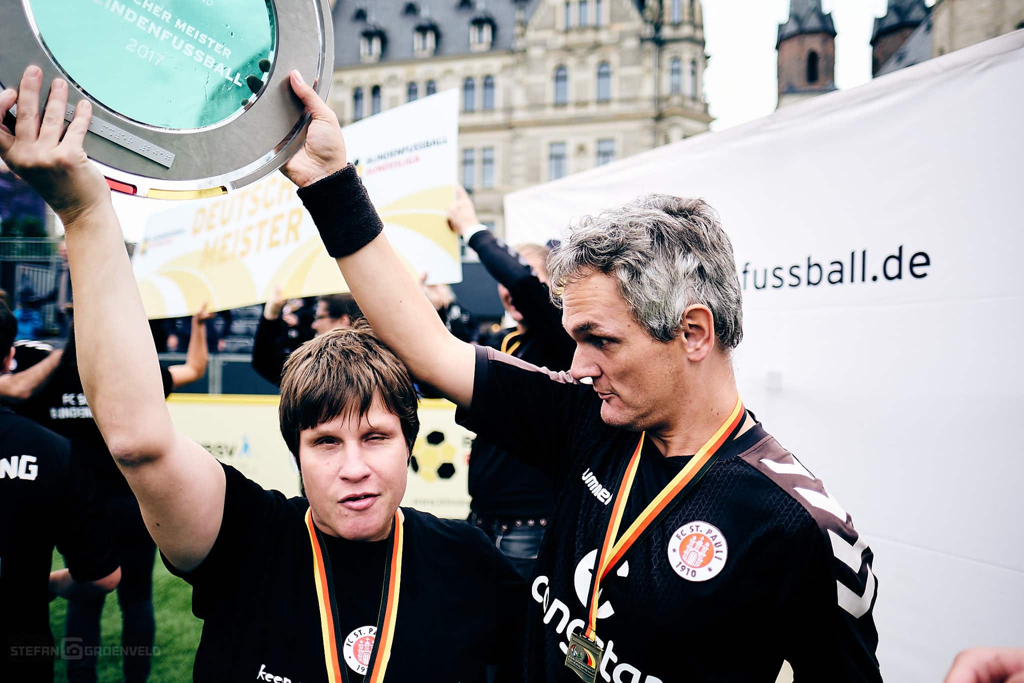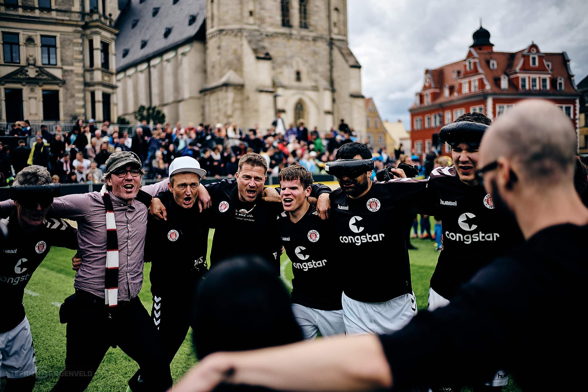 Wie es sich für eine gute deutsche Innenstadt gehört, chillten in der Nähe des Mitten in der Stadt platzierten Spielfelds ein paar Punks. Und natürlich trugen sie St. Pauli Devotionalien und hörten St. Pauli Musik. Ich hatte sie kurz vor dem Spiel entdeckt und freundlich rübergenickt. Da auch ich im Teamoutfit durch die Stadt lief, dämmerte den Jungs, was jetzt gleich nebenan passieren sollte. Spätestens als der Moderator durch die Lautsprecheranlage das Team vom FC St. Pauli begrüßte, hatten der Blindenfussball neue Fans gefunden. Sie verfolgten das Spiel von der Tribüne aus und feierten natürlich am Ende besonders intensiv. Ihr Bier wurde mit der Mannschaft geteilt, weil es sonst nur Sekt gab. Nach dem offiziellen Teil der Mannschaftsehrungen wurde daher die Feier schnell vor die Tribüne verlegt und ein Foto mit Familie und Punks gemacht. Die Jungs haben dann noch für die Zugwegzehrung aka mehr Bier gesorgt, während das Team für die Rückfahrt duschte. Und irgendwie kam das Team auch an das Schild mit der Aufschrift „Deutscher Meister“ von der Siegerehrung.