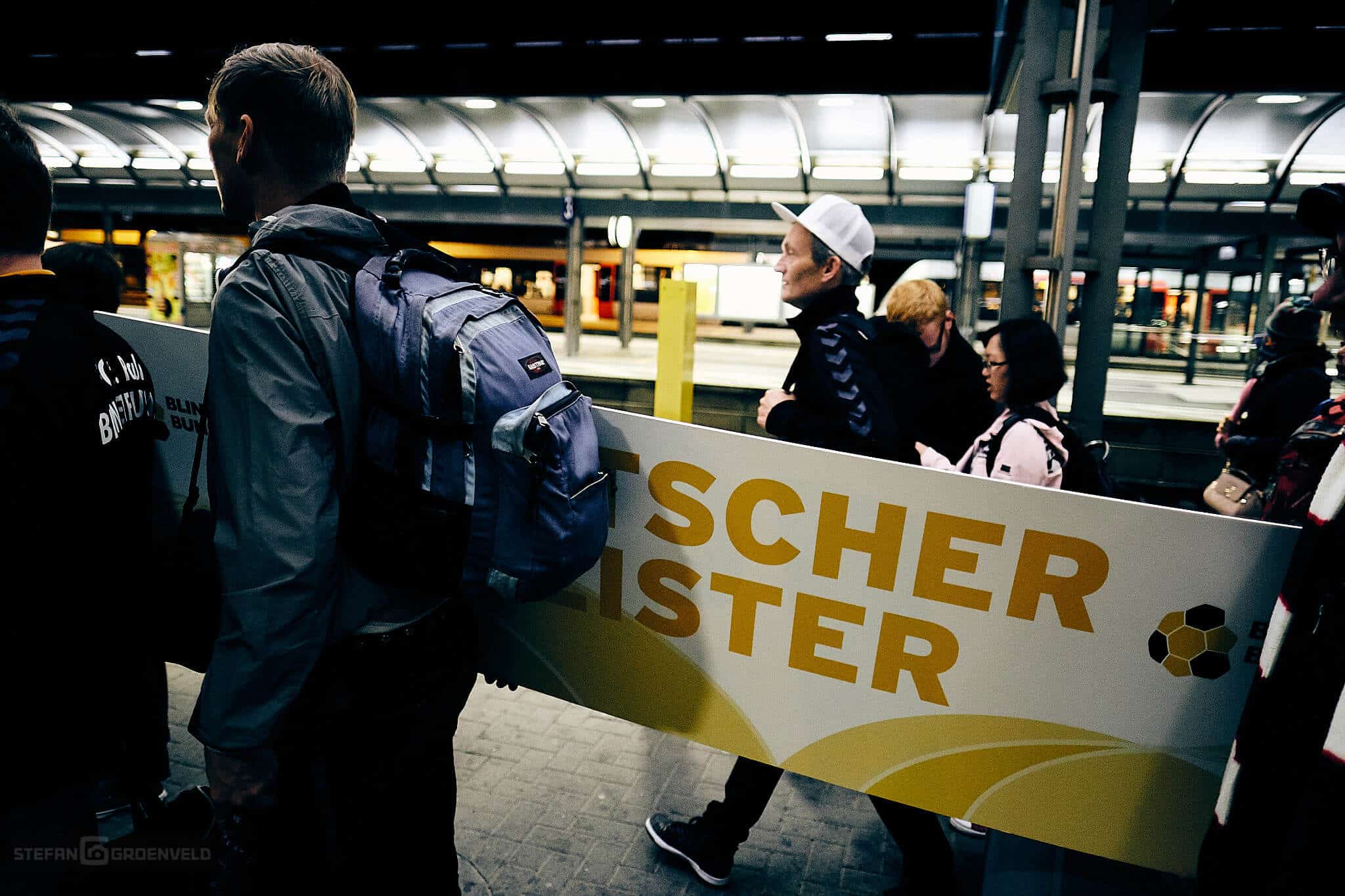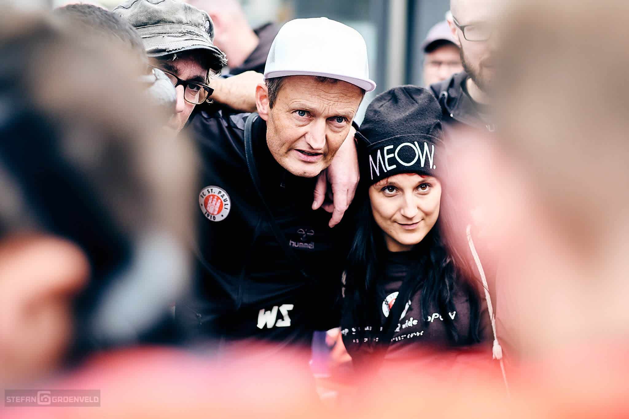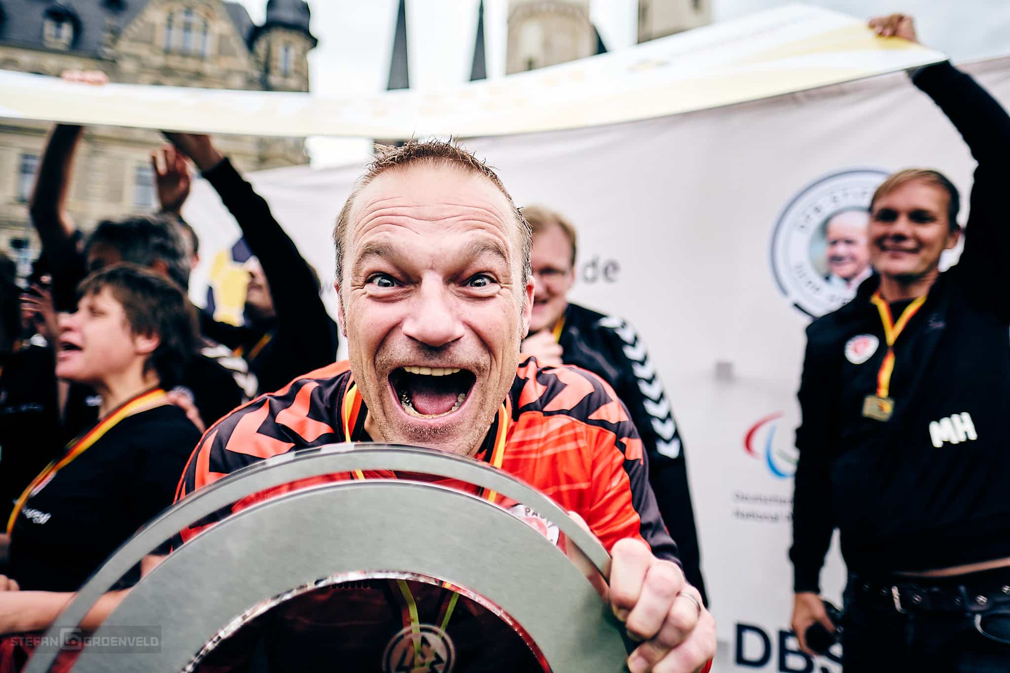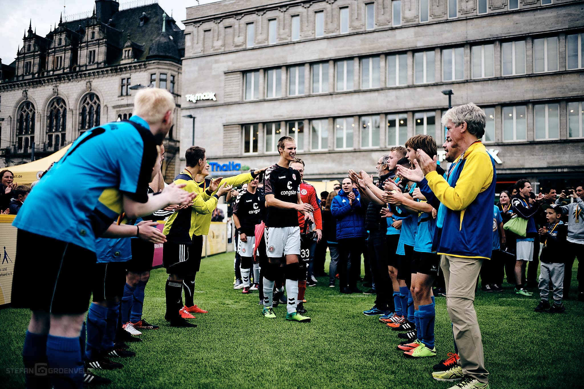 Wie es sich für eine gute deutsche Innenstadt gehört, chillten in der Nähe des Mitten in der Stadt platzierten Spielfelds ein paar Punks. Und natürlich trugen sie St. Pauli Devotionalien und hörten St. Pauli Musik. Ich hatte sie kurz vor dem Spiel entdeckt und freundlich rübergenickt. Da auch ich im Teamoutfit durch die Stadt lief, dämmerte den Jungs, was jetzt gleich nebenan passieren sollte. Spätestens als der Moderator durch die Lautsprecheranlage das Team vom FC St. Pauli begrüßte, hatten der Blindenfussball neue Fans gefunden. Sie verfolgten das Spiel von der Tribüne aus und feierten natürlich am Ende besonders intensiv. Ihr Bier wurde mit der Mannschaft geteilt, weil es sonst nur Sekt gab. Nach dem offiziellen Teil der Mannschaftsehrungen wurde daher die Feier schnell vor die Tribüne verlegt und ein Foto mit Familie und Punks gemacht. Die Jungs haben dann noch für die Zugwegzehrung aka mehr Bier gesorgt, während das Team für die Rückfahrt duschte. Und irgendwie kam das Team auch an das Schild mit der Aufschrift „Deutscher Meister“ von der Siegerehrung.