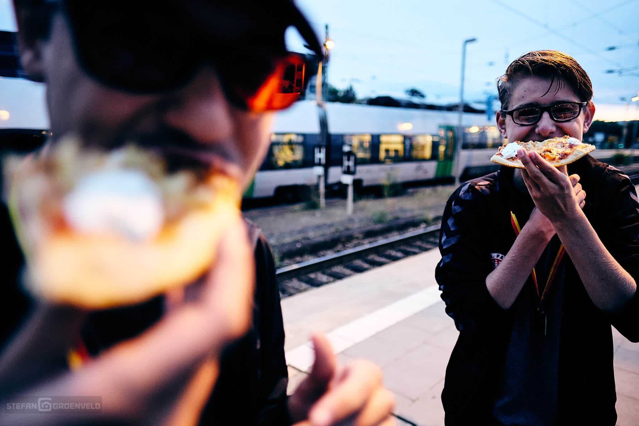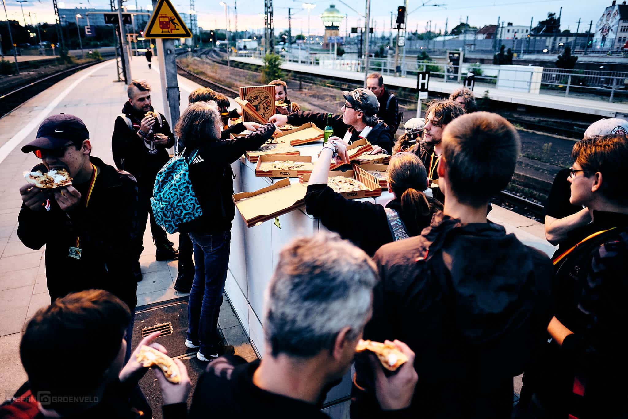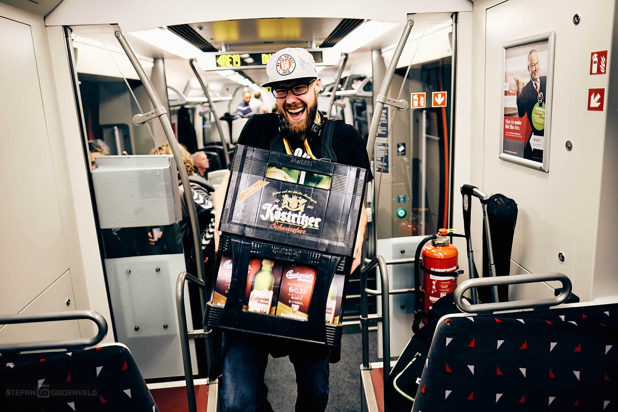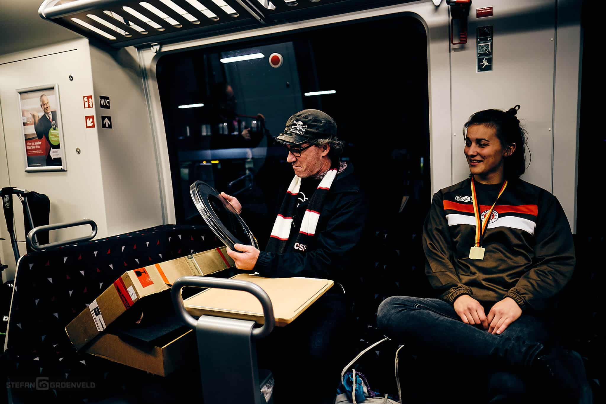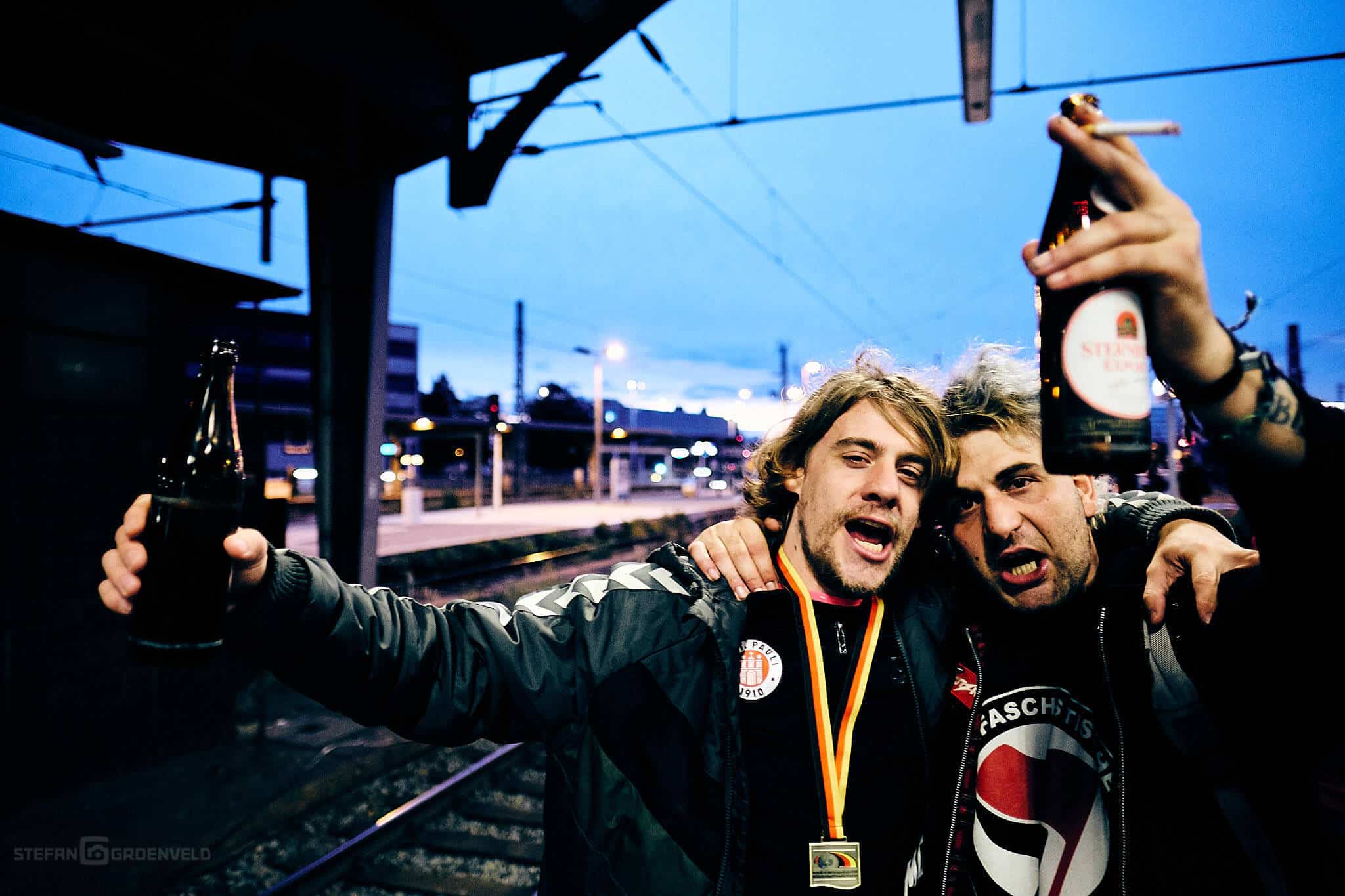 Wie es sich für eine gute deutsche Innenstadt gehört, chillten in der Nähe des Mitten in der Stadt platzierten Spielfelds ein paar Punks. Und natürlich trugen sie St. Pauli Devotionalien und hörten St. Pauli Musik. Ich hatte sie kurz vor dem Spiel entdeckt und freundlich rübergenickt. Da auch ich im Teamoutfit durch die Stadt lief, dämmerte den Jungs, was jetzt gleich nebenan passieren sollte. Spätestens als der Moderator durch die Lautsprecheranlage das Team vom FC St. Pauli begrüßte, hatten der Blindenfussball neue Fans gefunden. Sie verfolgten das Spiel von der Tribüne aus und feierten natürlich am Ende besonders intensiv. Ihr Bier wurde mit der Mannschaft geteilt, weil es sonst nur Sekt gab. Nach dem offiziellen Teil der Mannschaftsehrungen wurde daher die Feier schnell vor die Tribüne verlegt und ein Foto mit Familie und Punks gemacht. Die Jungs haben dann noch für die Zugwegzehrung aka mehr Bier gesorgt, während das Team für die Rückfahrt duschte. Und irgendwie kam das Team auch an das Schild mit der Aufschrift „Deutscher Meister“ von der Siegerehrung.