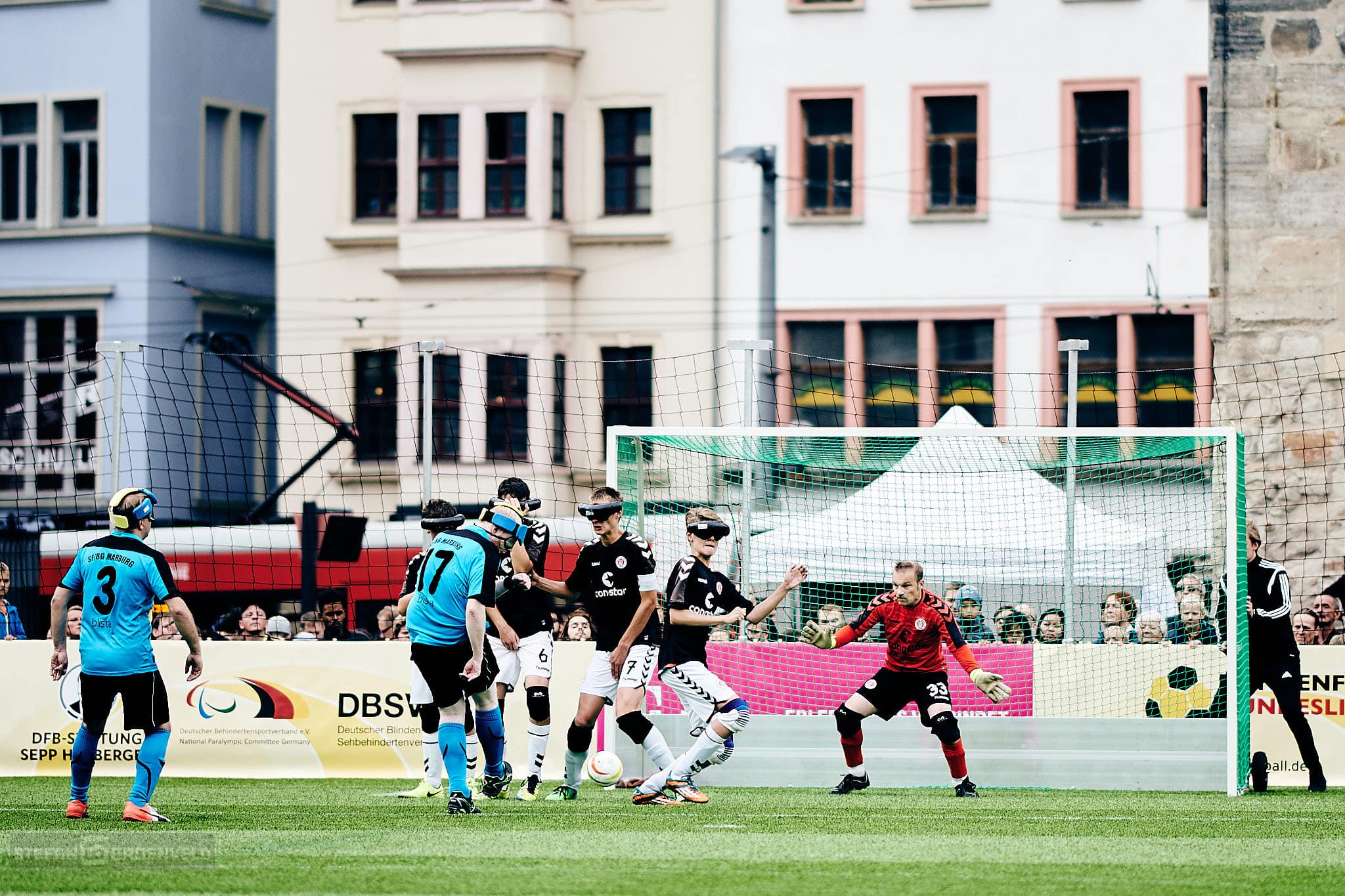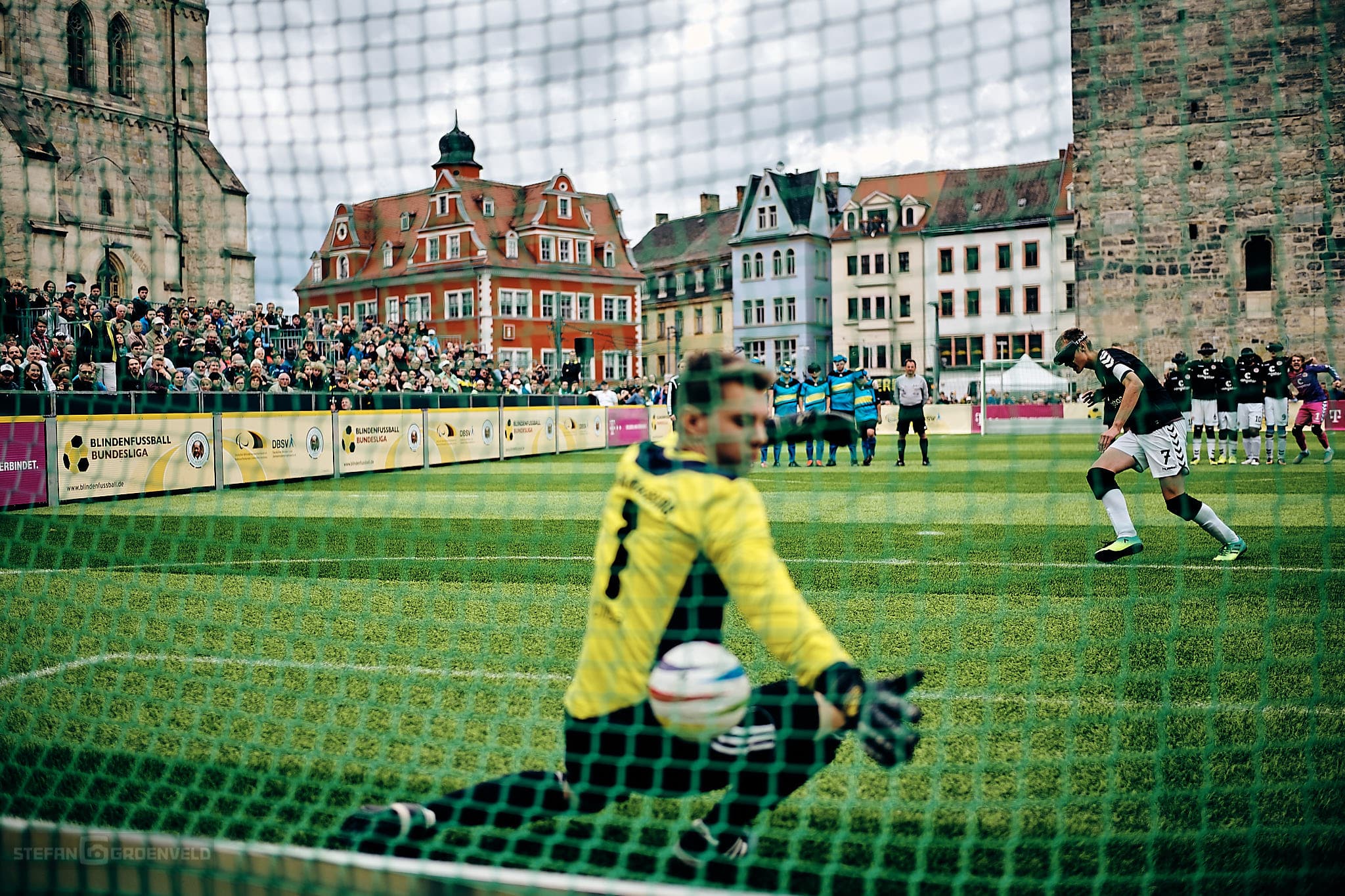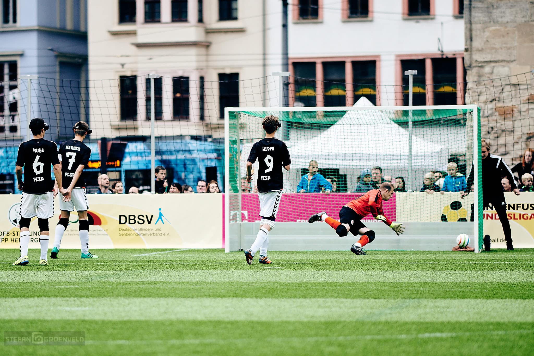 Erstmals wurde die deutsche Meisterschaft im Blindenfussball in einem Finale zwischen den ersten beiden Mannschaften der abgelaufenen Bundesliga-Saison entschieden. So trafen sich in Halle an der Saale die beiden Teams aus Marburg (16 Punkte und amtierender Meister) und FC St. Pauli (15 Punkte und noch nie gegen Marburg gewonnen). Ich hatte nach dem letzten Spieltag und der Gewissheit auf dieses Finalspiel sofort meine Zugfahrkarte gebucht. Ich begleite das Team ja nun schon etwas länger und bei dieser einmaligen Chance auf den deutschen Meistertitel wollte ich unbedingt dabei sein. Aber auch schon der zweite Platz hätte die beste Platzierung in der Bundesliga für den FC St. Pauli bedeutet. Immerhin darf man nicht vergessen, dass der FC St. Pauli in seinen Bundesliga Jahren 2008 bis 2013 ein Abo auf den letzten oder vorletzten Tabellenplatz hatte. In diesen 6 Jahren hatte das Team insgesamt weniger Tore geschossen als alleine in dieser Saison!