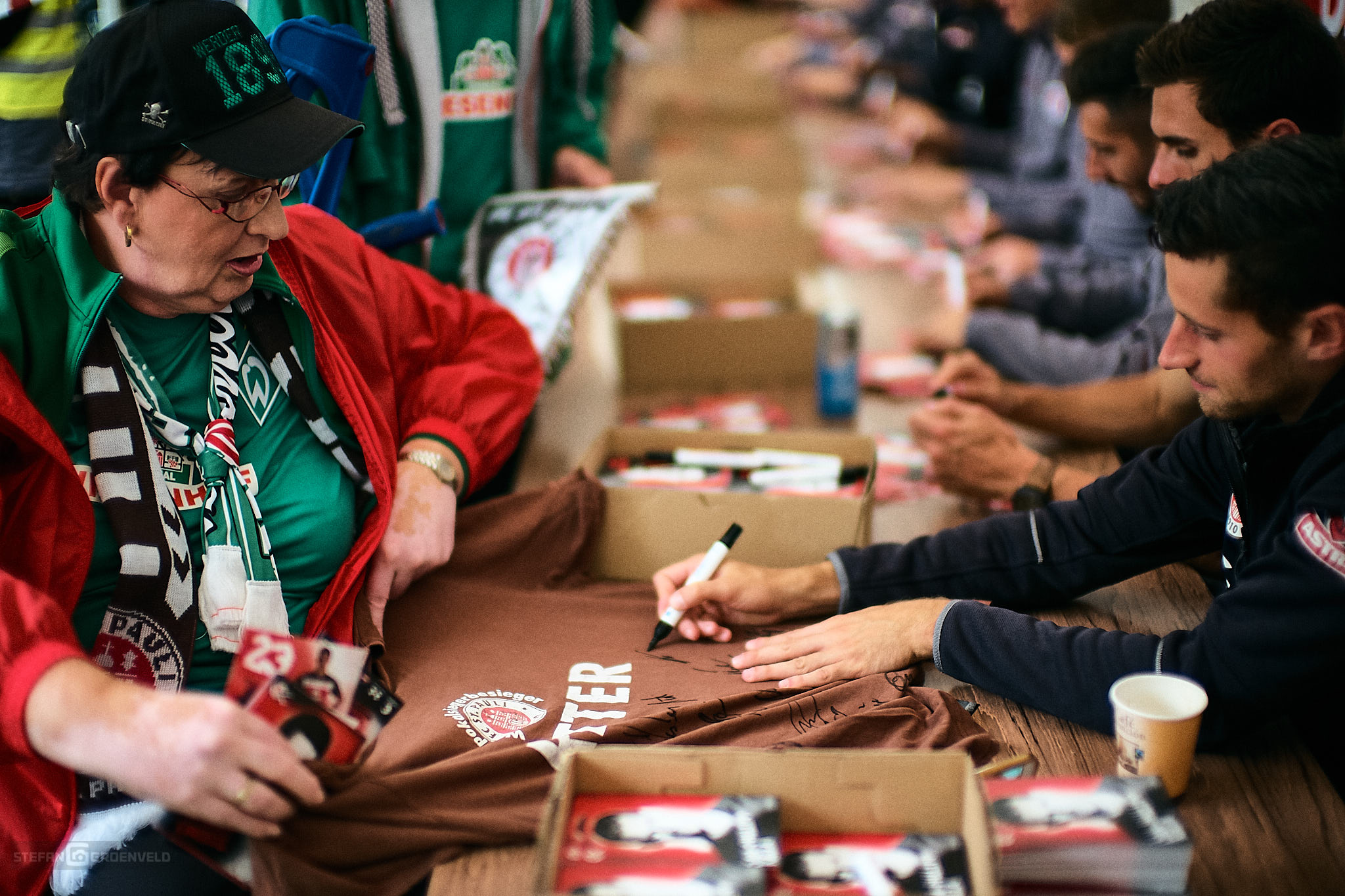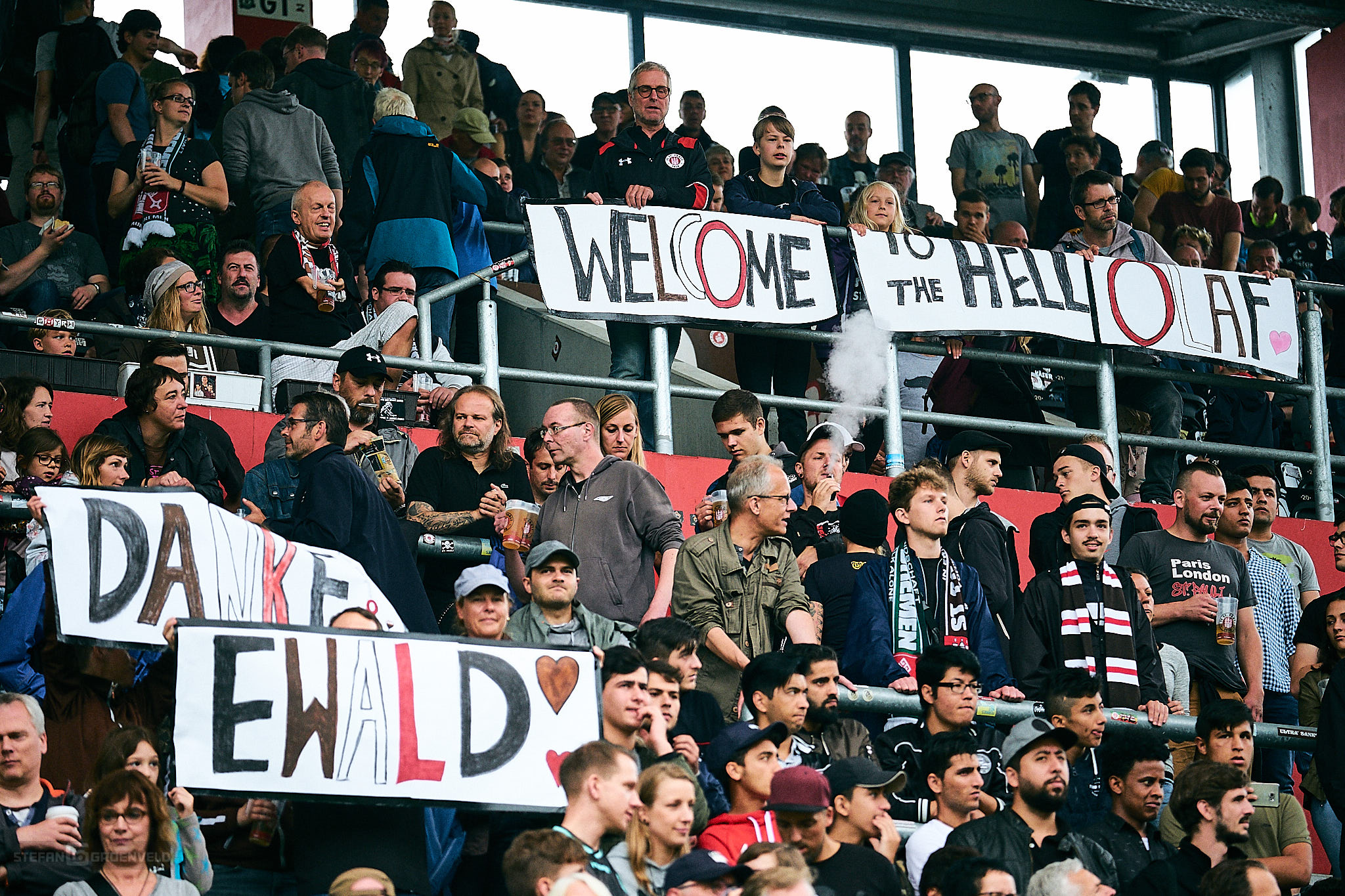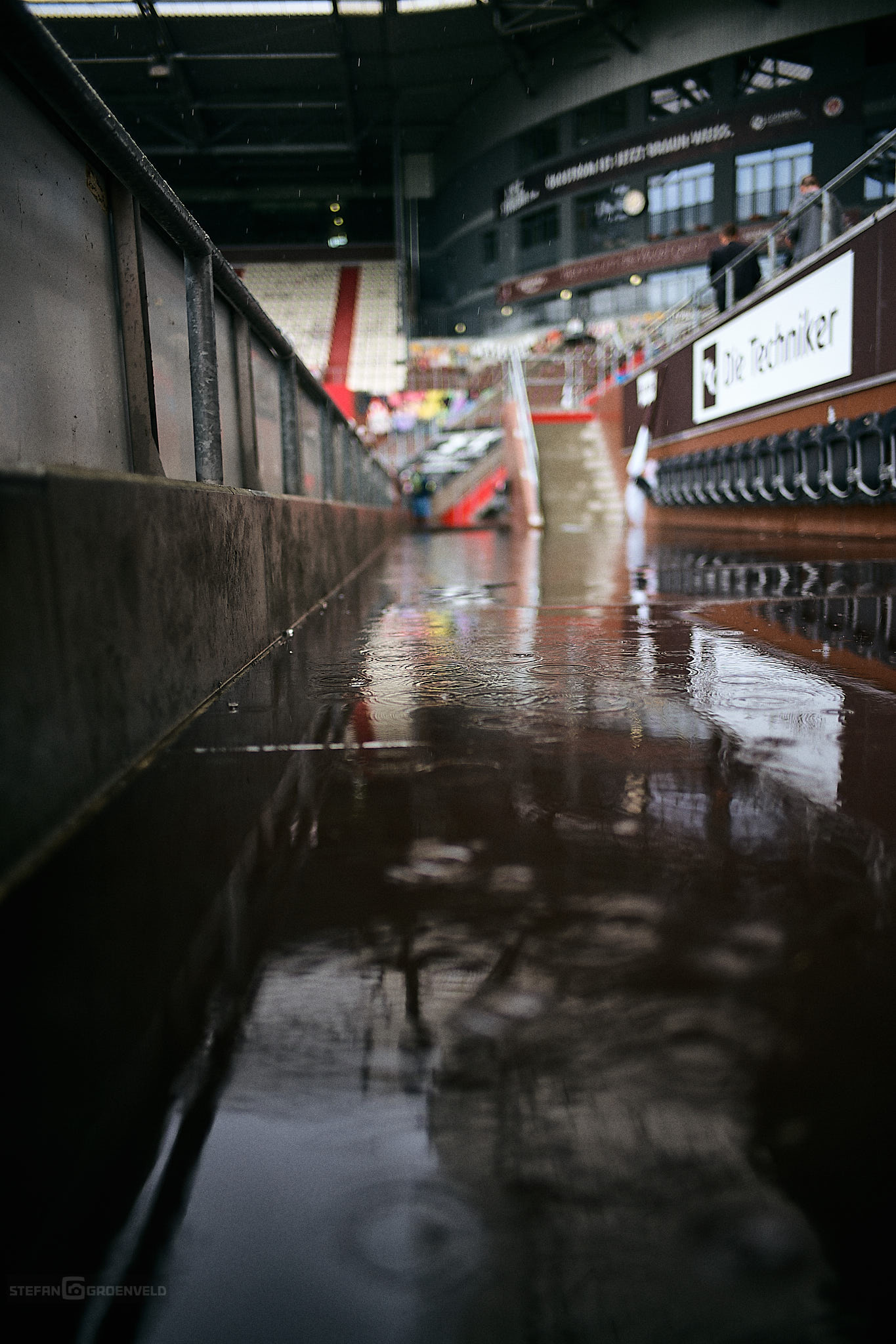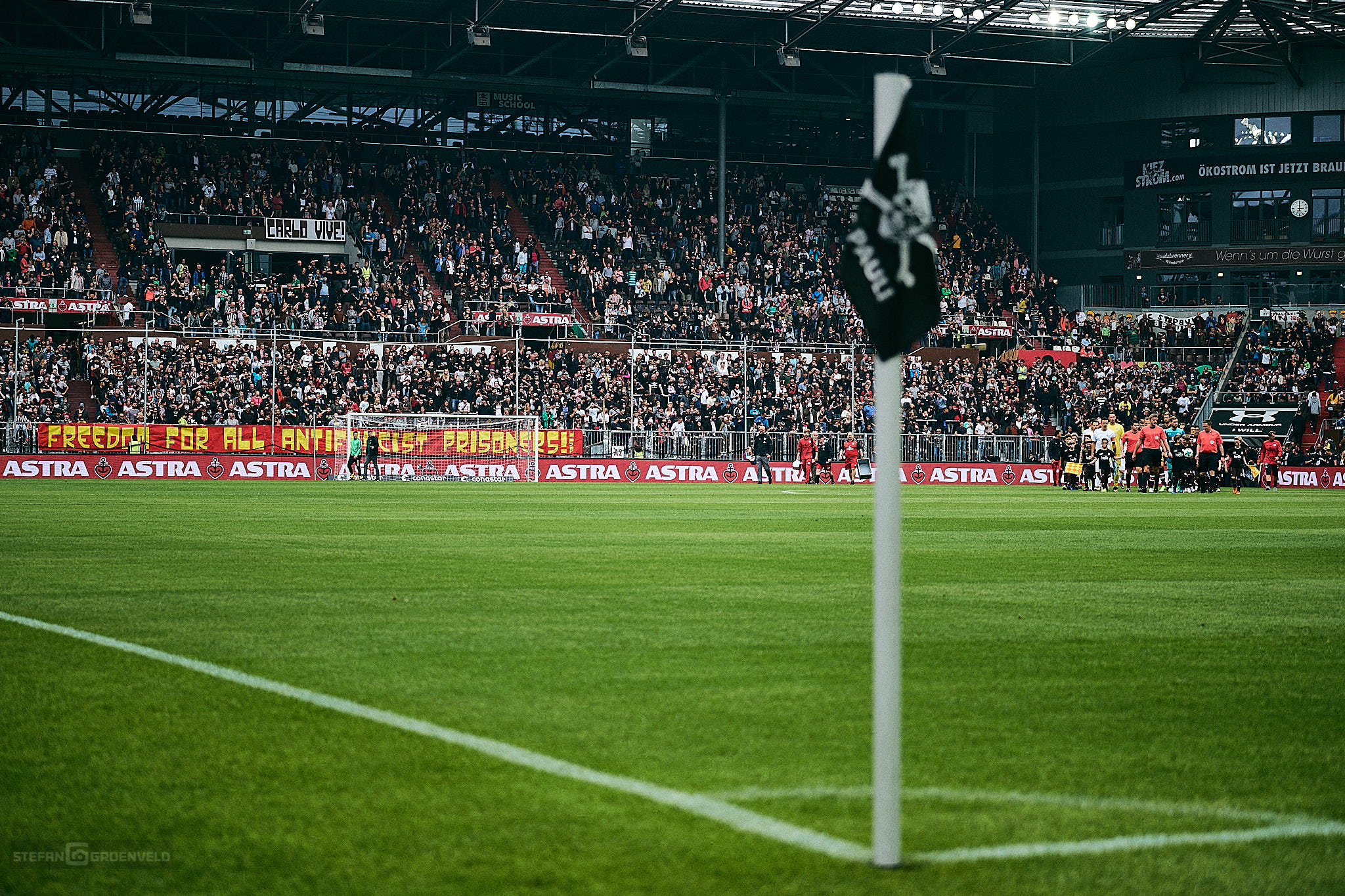 Was ist sonst noch neu am Millerntor in der Saison 2017/18? Trainer Olaf Janßen ist an der Aussenlinie nicht so entspannt wie Ewald Lienen – das freut die Fotografen. Diese haben hinter den neuen Banden nun auch mehr Platz. Leider fehlt die Möglichkeit sein Equipment unter den alten schrägen Planen einigermaßen regengeschützt abzustellen, dafür könnte man theoretisch einen Kaffee auf halber Höhe abstellen. Nicht geändert hat sich das schlechte Licht vor der Süd, das bleibt die dunkelste Ecke im Stadion und macht das Fotografieren jubelnder Spieler nicht schön. Aber hey, wen interessieren schon schöne Fotos vor der Süd – Hauptsache, es gibt da genug Grund zum Jubeln. Kein Grund zum Jubeln sind die frisch renovierten Plätze der Rollifahrer, die nun einem Schwimmbad gleichen. Würde mich aber nicht wundern, wenn da noch Abhilfe geschaffen wird. Bis zum ersten Ligaspiel sind ja noch über 2 Wochen Zeit…