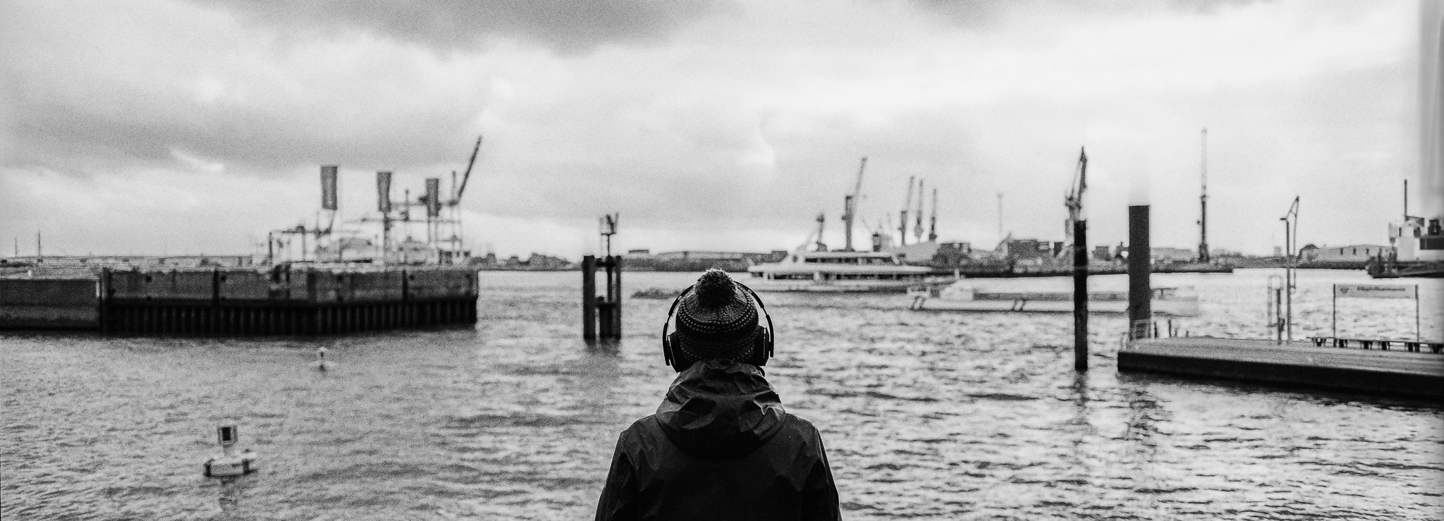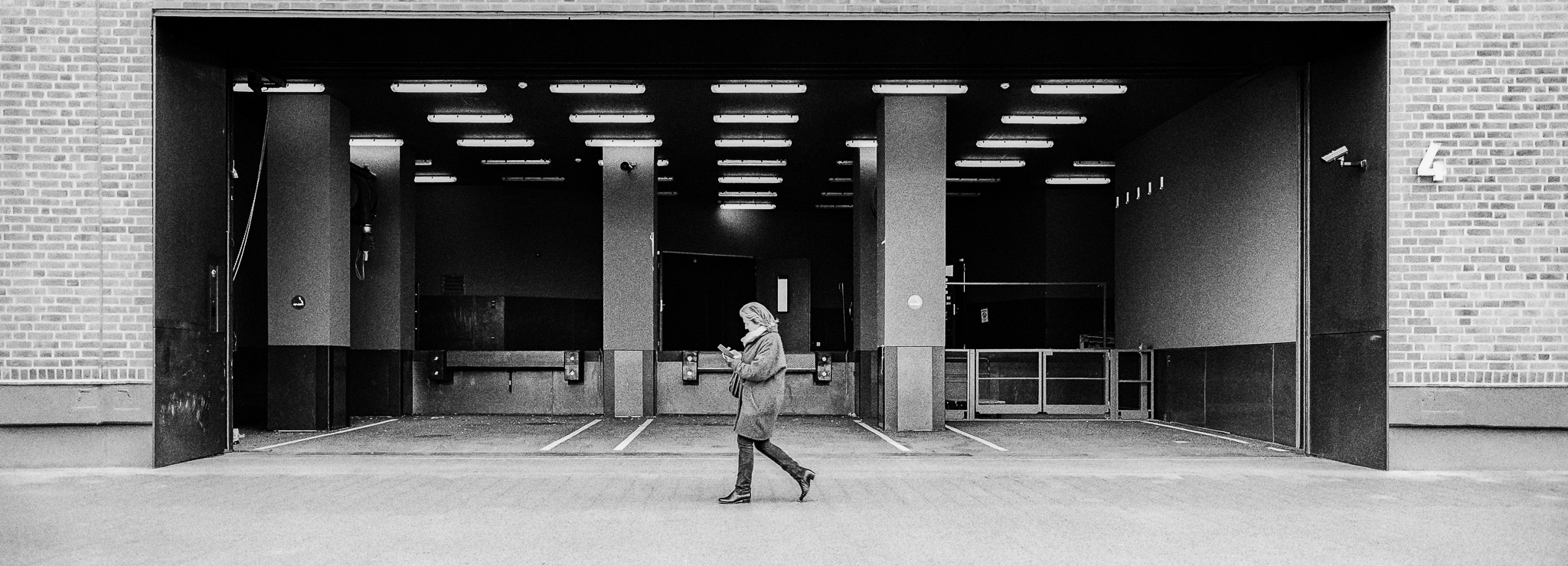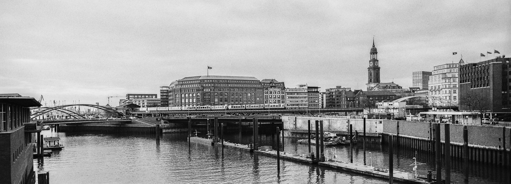 Ich selbst war mal wieder hoffnungslos damit überfordert, das sehr weite Format der Xpan mit Leben zu füllen. Egal, wir hatten sehr viel Spaß bei unserem Foto-Spaziergang in der Tourihochburg Hafencity. Besonders lustig war die Situation, als wir beide eine schicke Fotolocation am Fuss der Elphi fanden und nun gemeinsam auf eine Aktion warteten, die dem Ort etwas Leben gibt. Und da kam sie auch schon: eine Frau in rotem Mantel an ihrem in rotem Cover umschlagenden Smartphone hantierend. Wir grinsten uns beide an, warteten auf den richtigen Augenblick und drückten ab. Fröhlich zogen wir weiter. Unsere ausgelassene Stimmung unterbrach ich dann mit den Worten: „Geil, alles freut sich über die Frau in Rot und niemand bemerkt, dass wir nur schwarz-weiß Film in unseren Kameras haben.“ Tja – man kann nicht immer gewinnen.