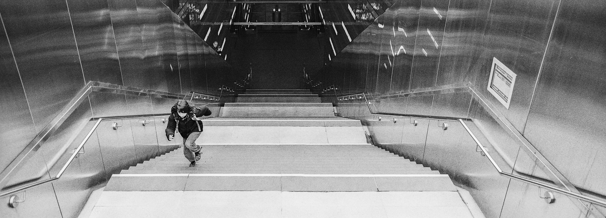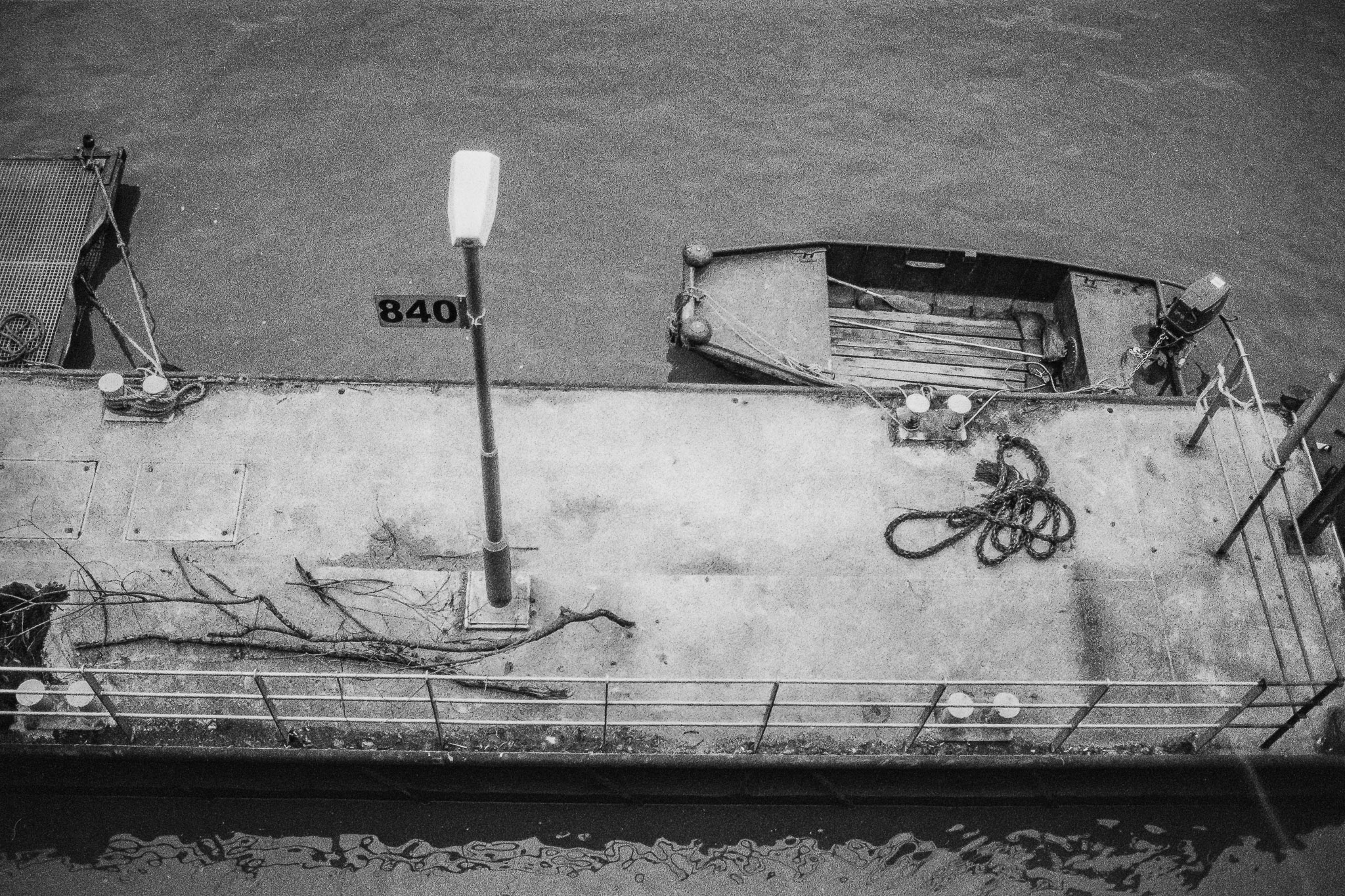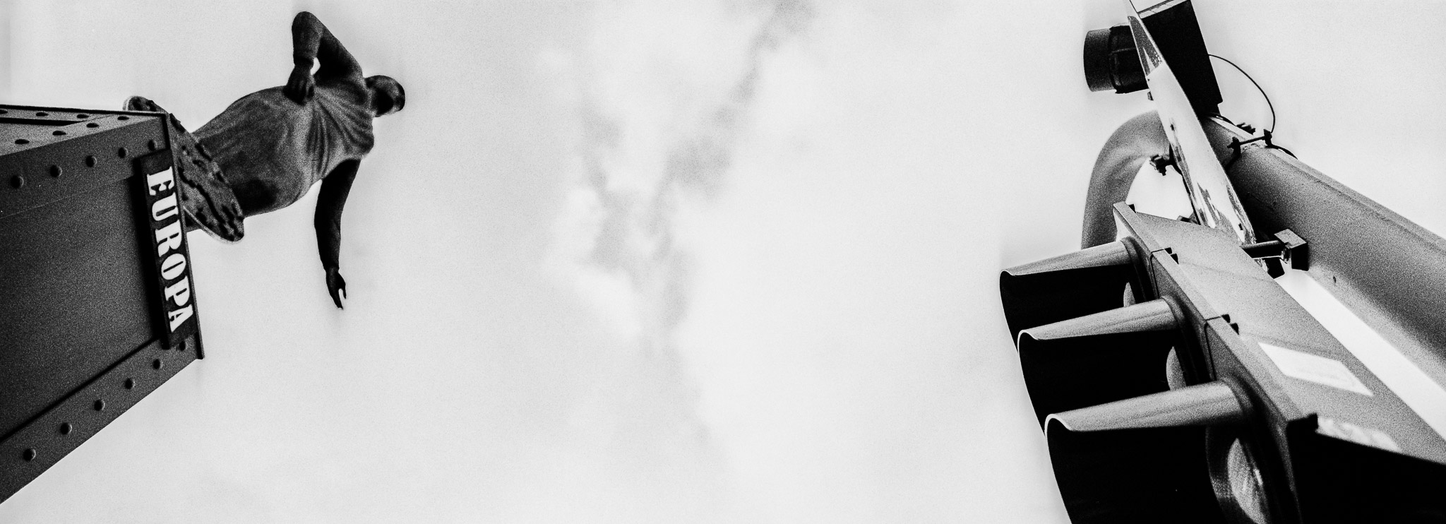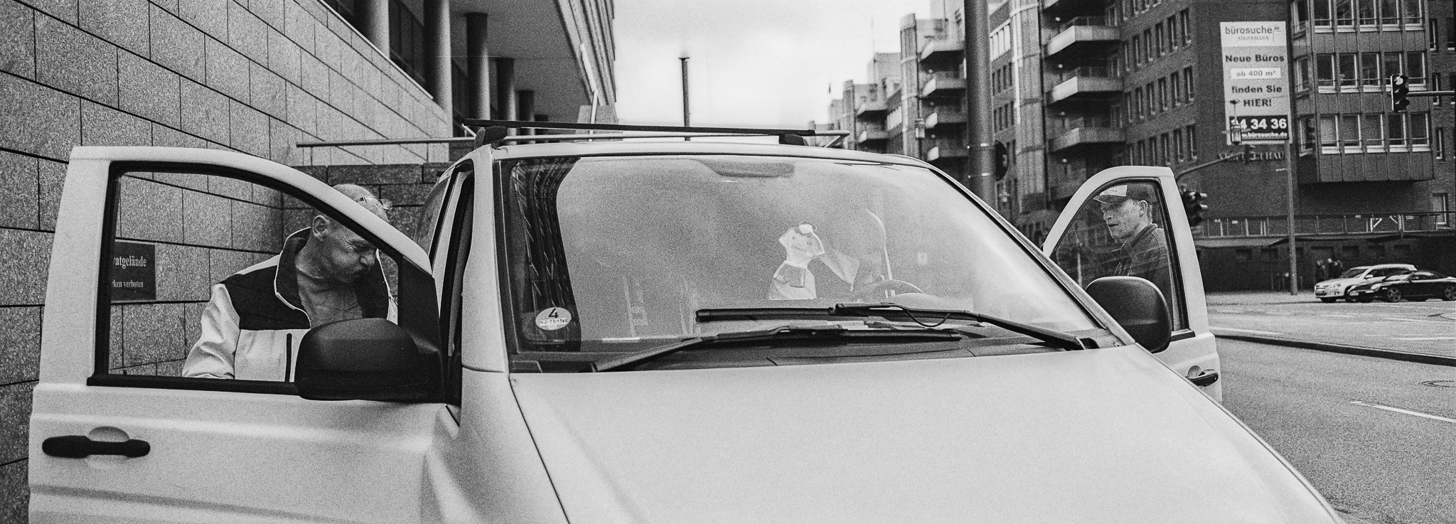 Ich selbst war mal wieder hoffnungslos damit überfordert, das sehr weite Format der Xpan mit Leben zu füllen. Egal, wir hatten sehr viel Spaß bei unserem Foto-Spaziergang in der Tourihochburg Hafencity. Besonders lustig war die Situation, als wir beide eine schicke Fotolocation am Fuss der Elphi fanden und nun gemeinsam auf eine Aktion warteten, die dem Ort etwas Leben gibt. Und da kam sie auch schon: eine Frau in rotem Mantel an ihrem in rotem Cover umschlagenden Smartphone hantierend. Wir grinsten uns beide an, warteten auf den richtigen Augenblick und drückten ab. Fröhlich zogen wir weiter. Unsere ausgelassene Stimmung unterbrach ich dann mit den Worten: „Geil, alles freut sich über die Frau in Rot und niemand bemerkt, dass wir nur schwarz-weiß Film in unseren Kameras haben.“ Tja – man kann nicht immer gewinnen.