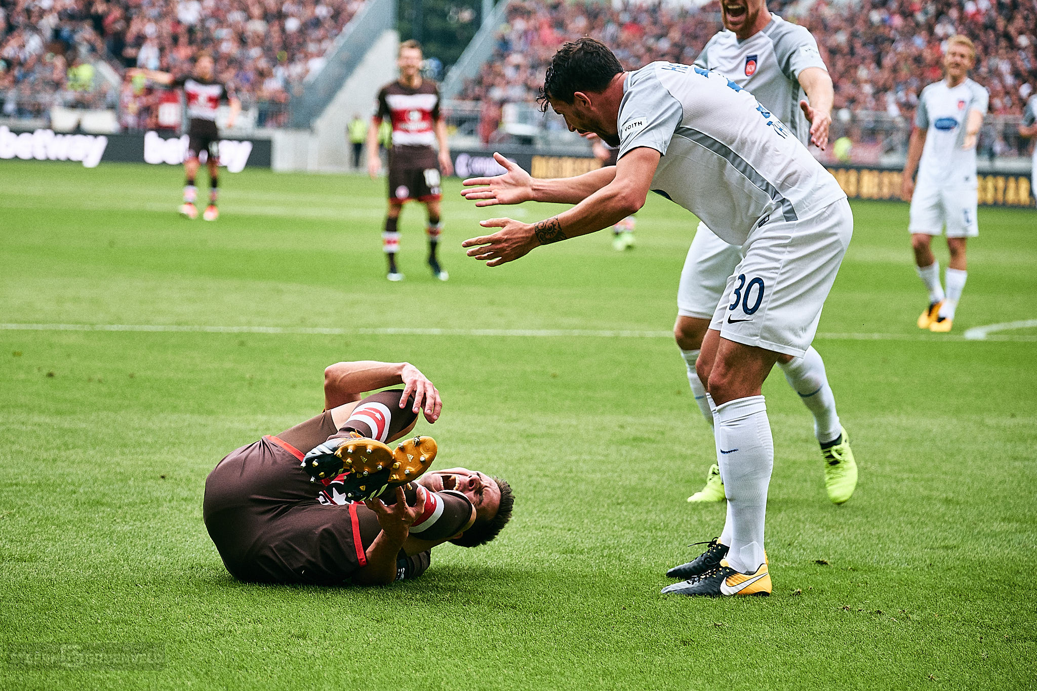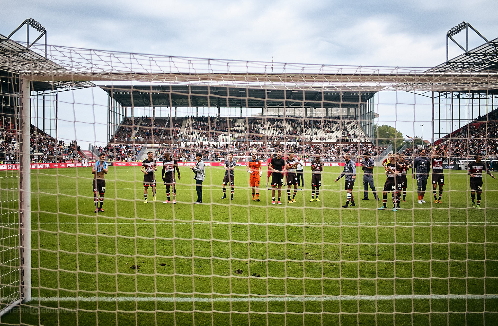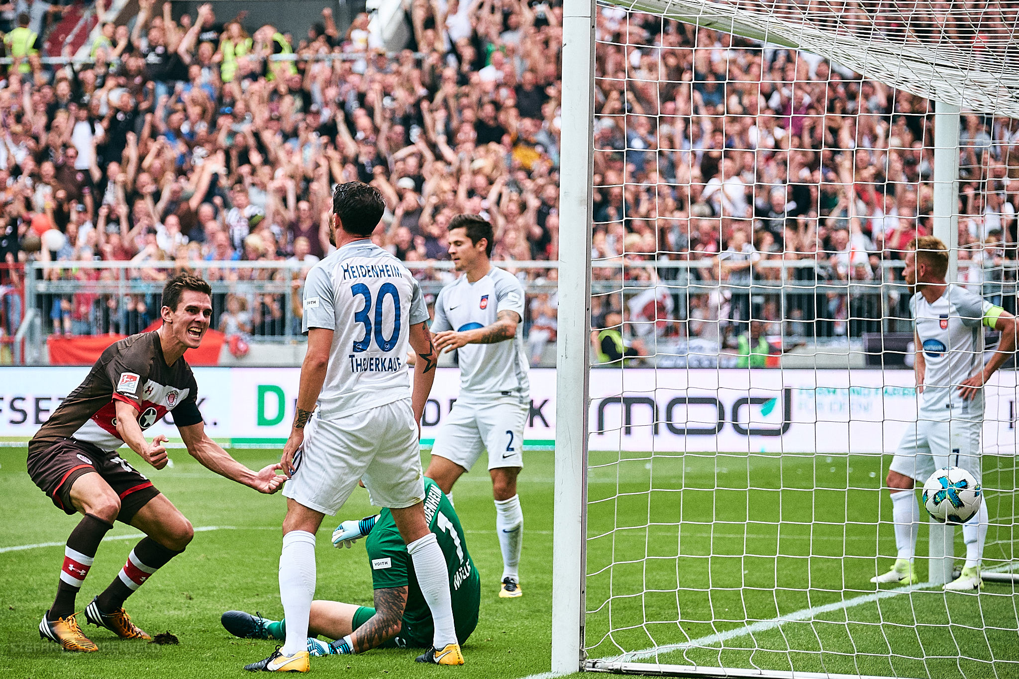 Jedenfalls stocherte Flum mit dem Schlusspfiff in der 92. Minute den unglücklich vor seine Füße prallende Ball als bebenden Schlussakkord eines eher langweiligen Spiels zum erlösenden 1:0 ins Netz. Was bleibt ist also Jubel. Über den Rest des Spiels können wir getrost den Mantel des Schweigens hüllen. In der ersten Halbzeit witzelte ich mit einem Fotokollegen, dass wir von Allagui Langzeitbelichtungen machen könnten. Zumindest in der 2. Halbzeit bemühten sich St. Paulianer, fanden aber kein Rezept gegen wie immer vielbeinig abwehrende Heidenheimer. Das erste Mal, dass der gegnerische Torwart einen Ball abwehren musste, war in der 75. Minute. Dann noch mal in der 77. Das war es auch schon. Den in der 92. konnte er nicht halten. Bitter, aber geil!