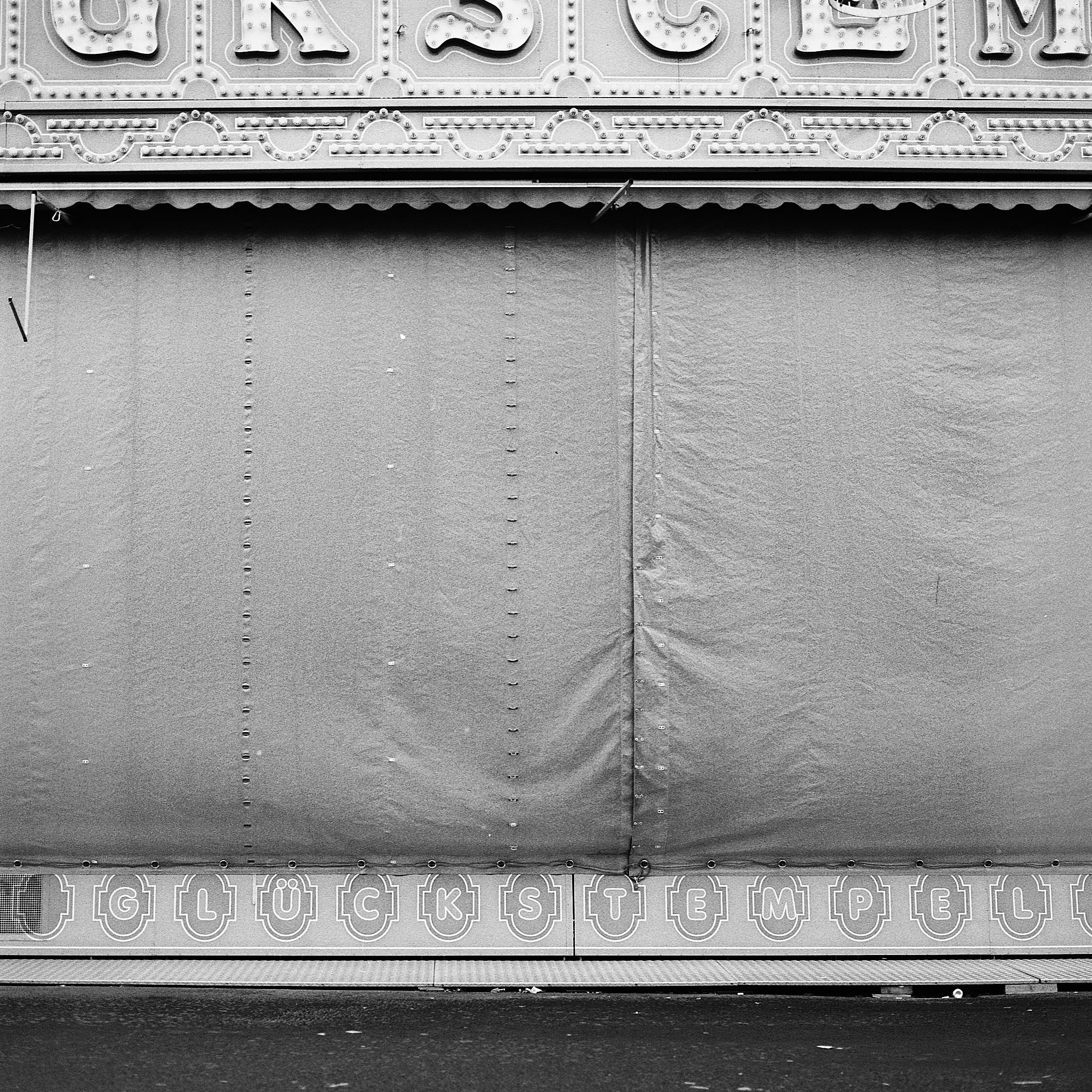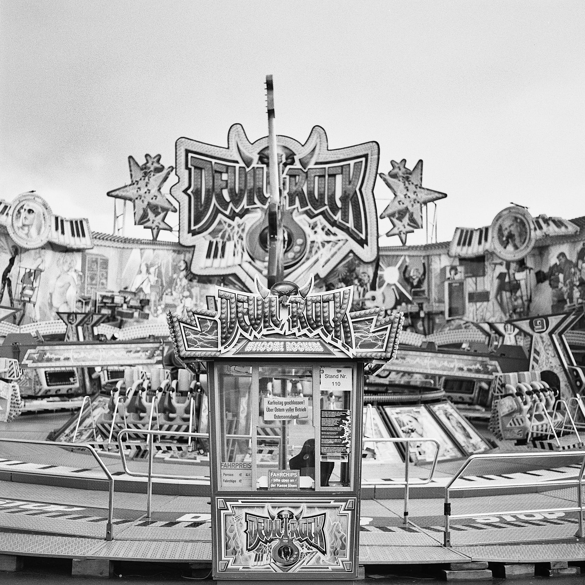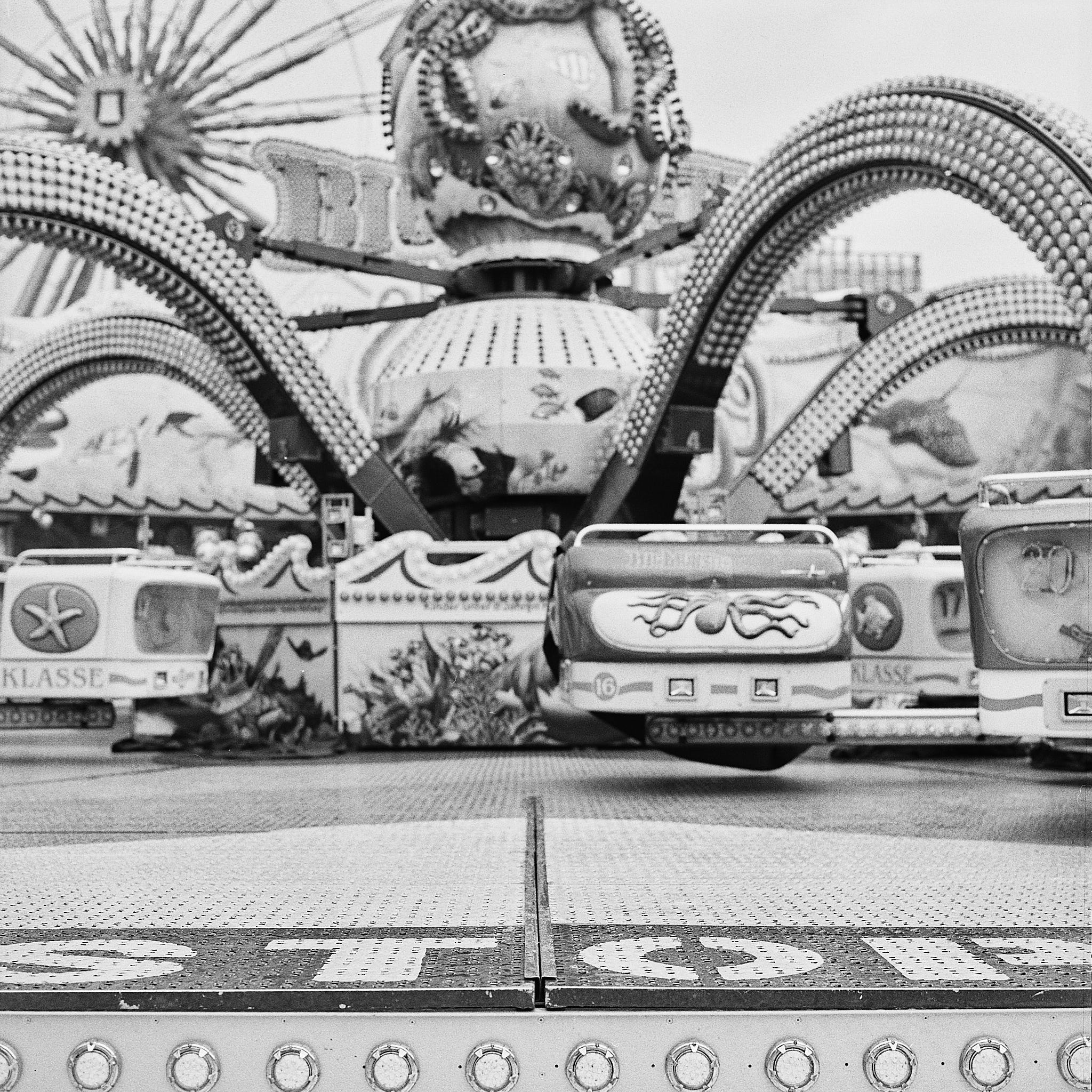 Mich zog es jedenfalls an Karfreitag mit zwei Freunden auf den Hamburger Dom. Ursprünglich wollte ich bei strahlendem Sonnenschein die kräftigen Farben des Rummels fotografieren. Da es dann aber doch Hamburger Wetter hatte, spannte ich meine letzten beiden Ilford HP5+ in die Magazine meiner Hasselblad und fotografierte tristes schwarz-weiß. Passt auch…