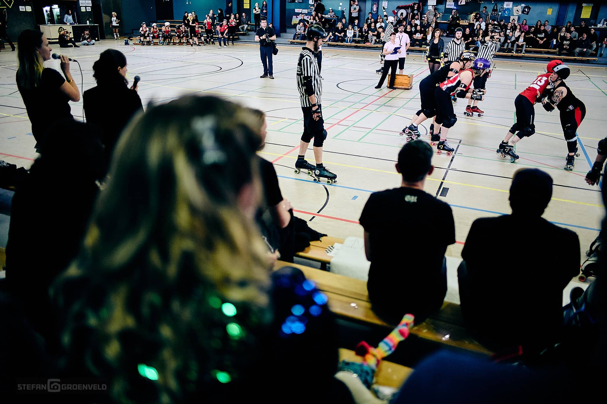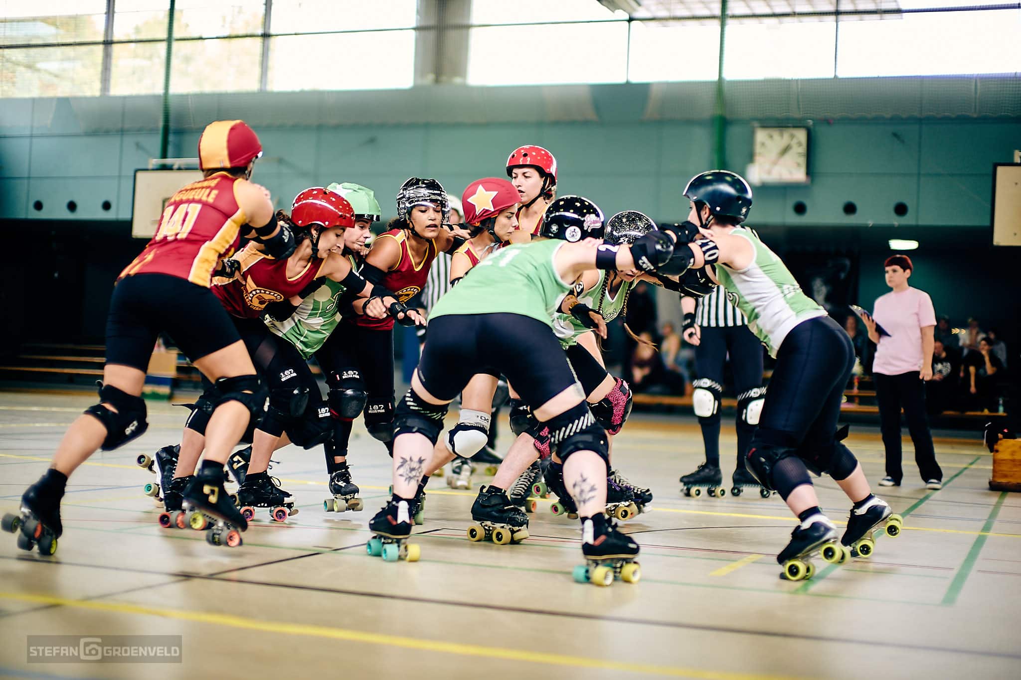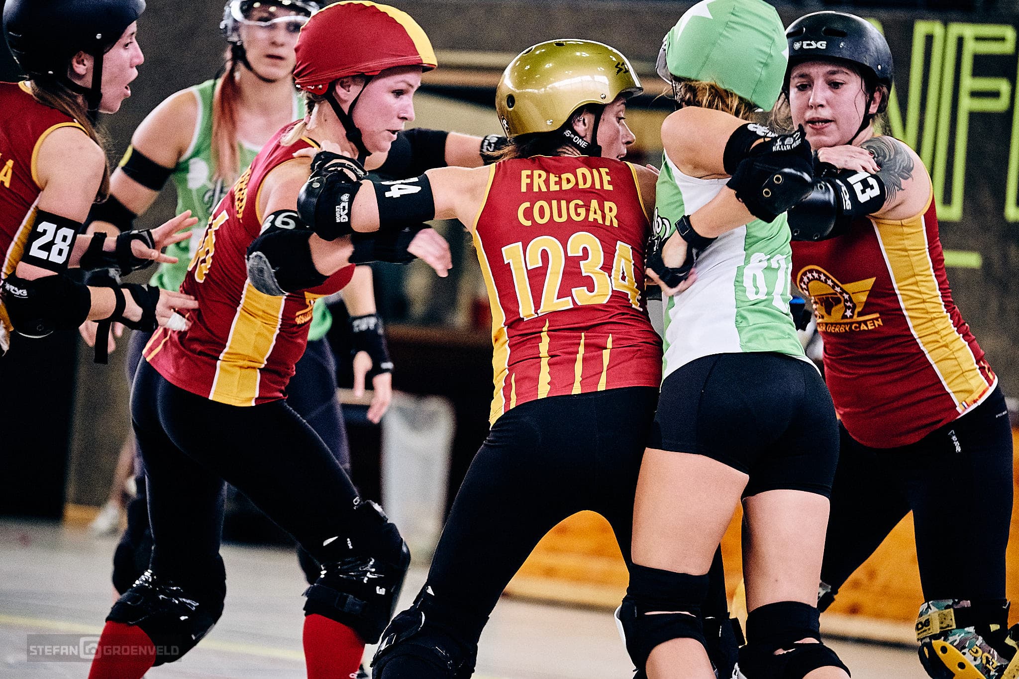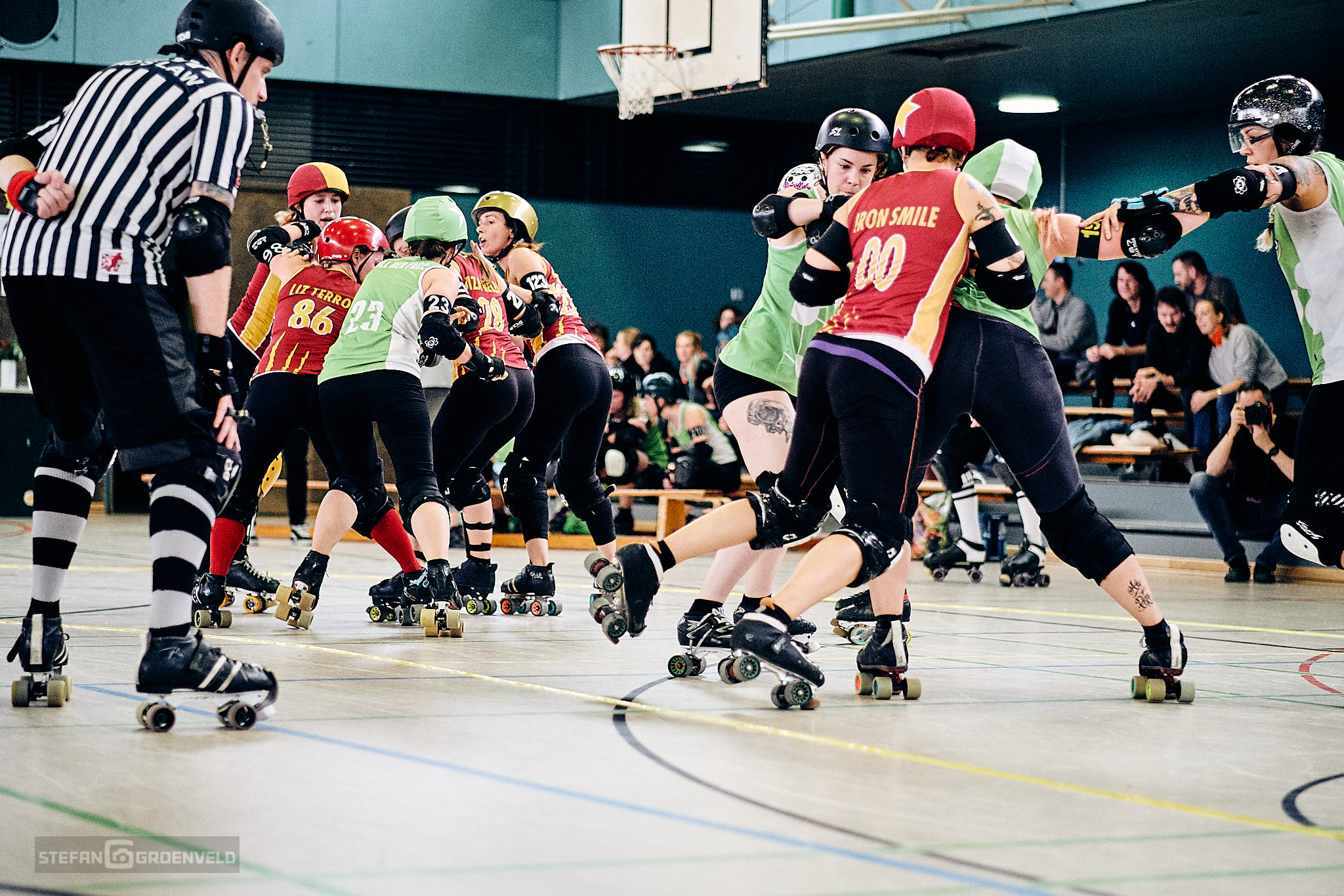 Im zweiten Bout des Tages kam es zu einem belgisch-französischen Duell. Brüssel Derby Pixies jammten gegen Roller Derby Caen und diese Partie war noch spannender und umkämpfter als das deutsche Duell. Die Zuschauer kamen auf ihre Kosten. In einem taktisch sehr fein anzusehenden Bout war die Führung immer nur knapp und wechselte auch zwischendurch. Die Art des Roller Derbys war auch deutlich anders: die wendigen Spielerinnen überzeugten durch ein sehr kraftraubendes Spiel, bei dem sich beide Teams nichts schenkten. Es gab mehrere Jams bei denen wegen des effektiven Blockens überhaupt keine Punkte vergeben wurden. Und dann gab es das eine Jam, bei dem Caen wahnsinnige 30 Punkte einfuhr. Das war jedenfalls Roller Derby zum Zungeschnalzen. Am Schluß musste sich Caen allerdings geschlagen geben – Brussels Derby Pixies gewann gegen Roller Derby Caen mit 173:131.