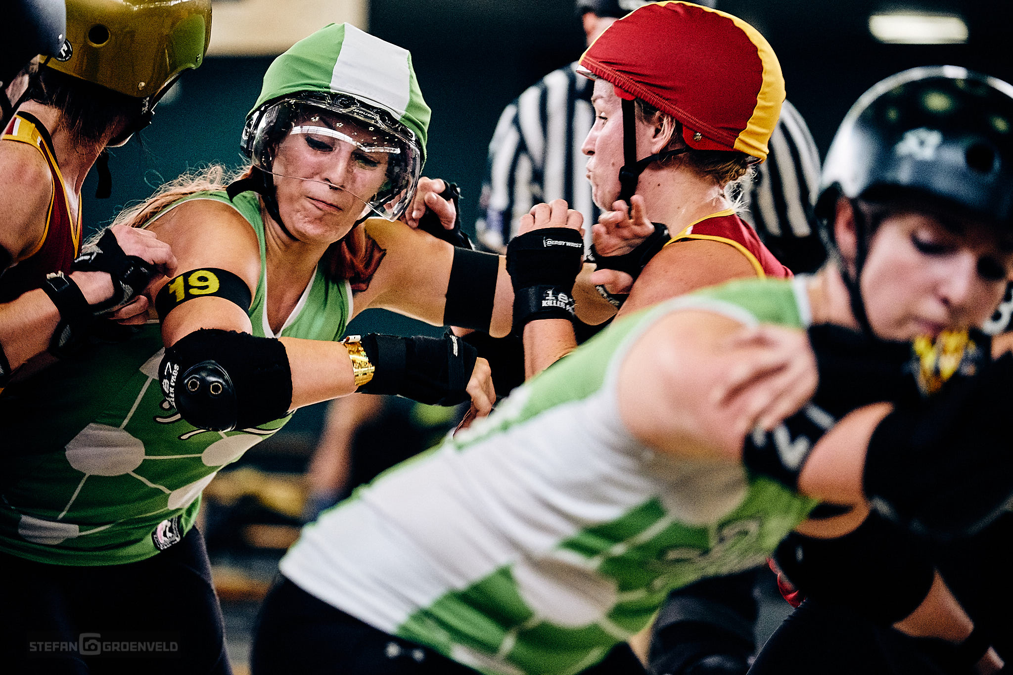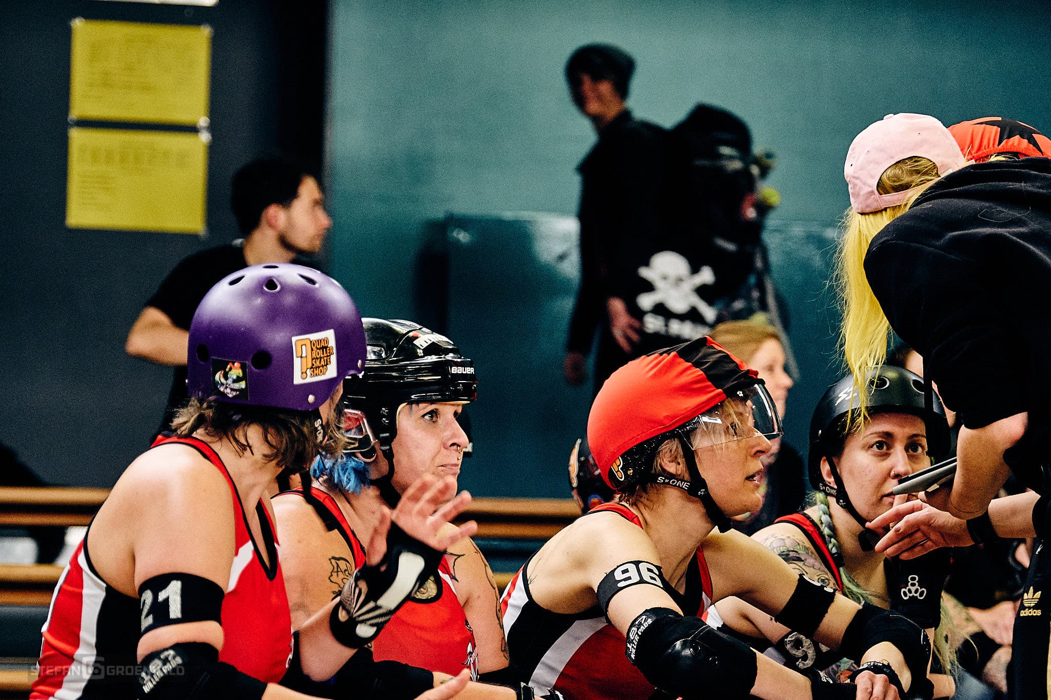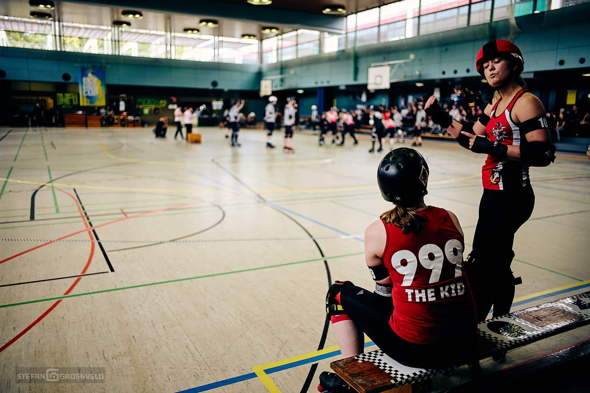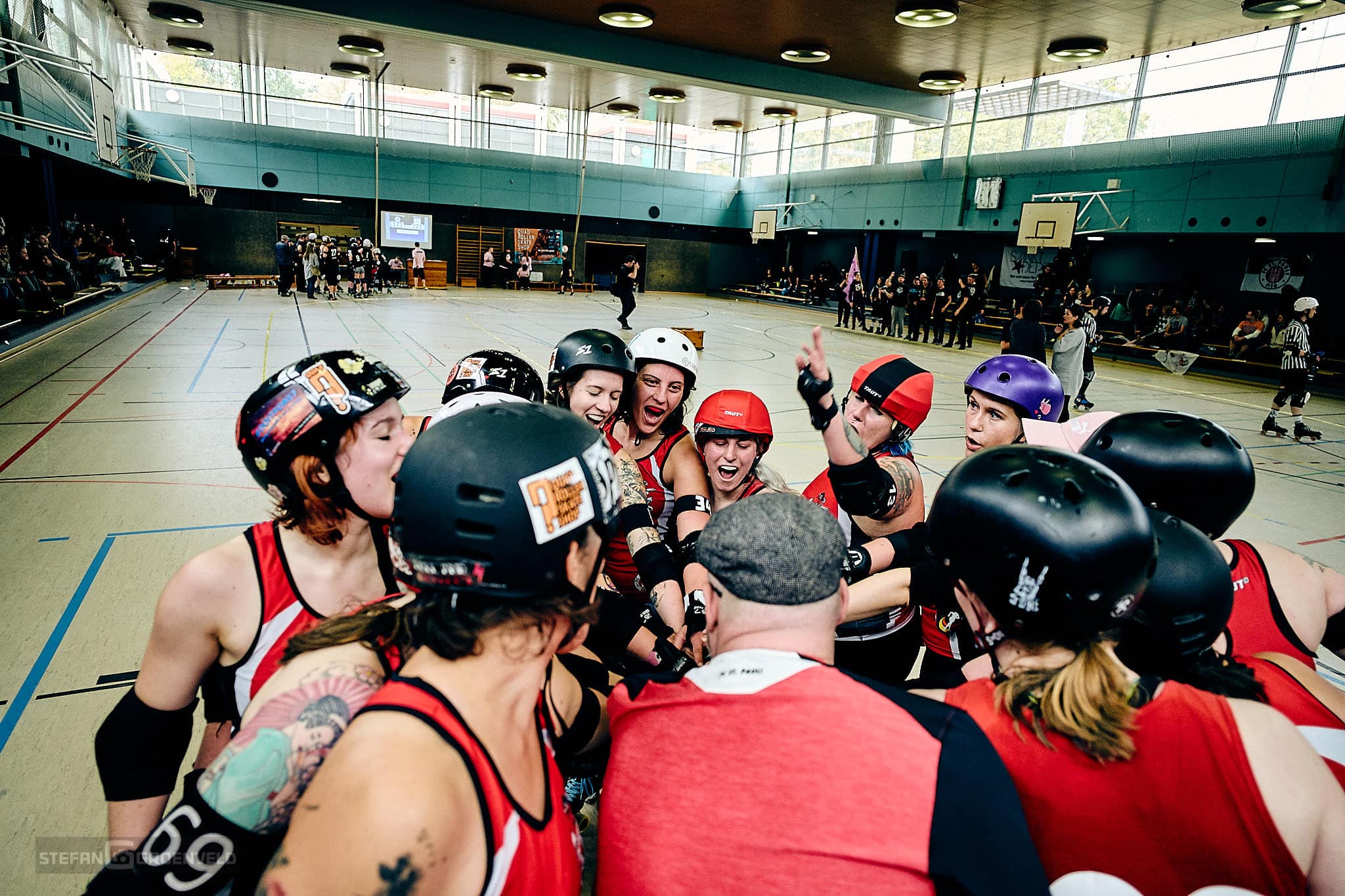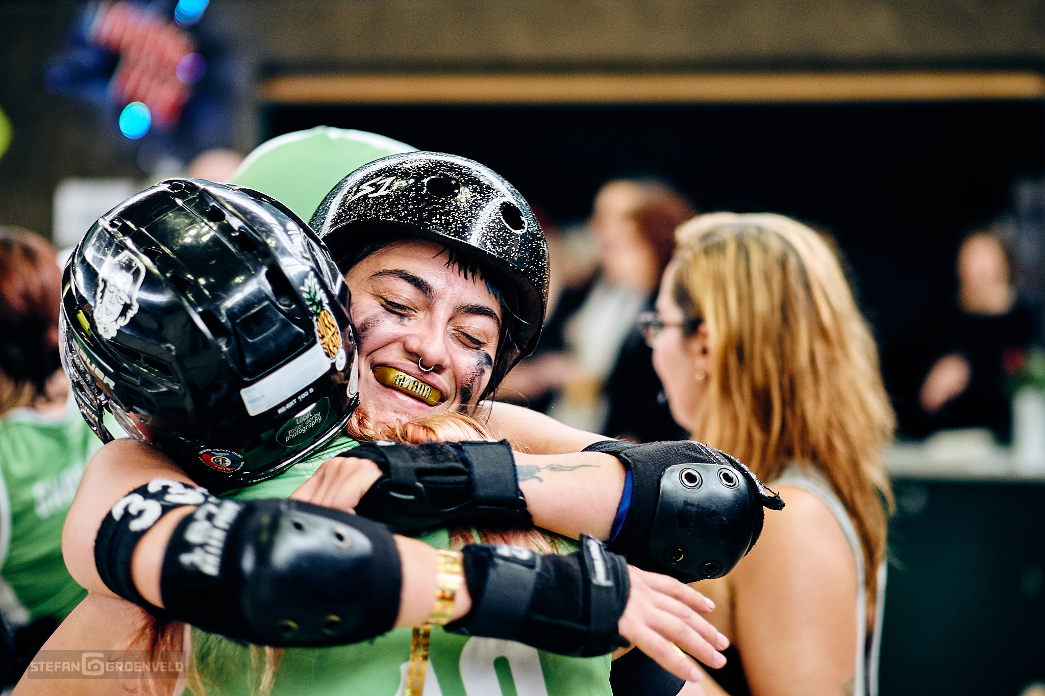 Im zweiten Bout des Tages kam es zu einem belgisch-französischen Duell. Brüssel Derby Pixies jammten gegen Roller Derby Caen und diese Partie war noch spannender und umkämpfter als das deutsche Duell. Die Zuschauer kamen auf ihre Kosten. In einem taktisch sehr fein anzusehenden Bout war die Führung immer nur knapp und wechselte auch zwischendurch. Die Art des Roller Derbys war auch deutlich anders: die wendigen Spielerinnen überzeugten durch ein sehr kraftraubendes Spiel, bei dem sich beide Teams nichts schenkten. Es gab mehrere Jams bei denen wegen des effektiven Blockens überhaupt keine Punkte vergeben wurden. Und dann gab es das eine Jam, bei dem Caen wahnsinnige 30 Punkte einfuhr. Das war jedenfalls Roller Derby zum Zungeschnalzen. Am Schluß musste sich Caen allerdings geschlagen geben – Brussels Derby Pixies gewann gegen Roller Derby Caen mit 173:131.