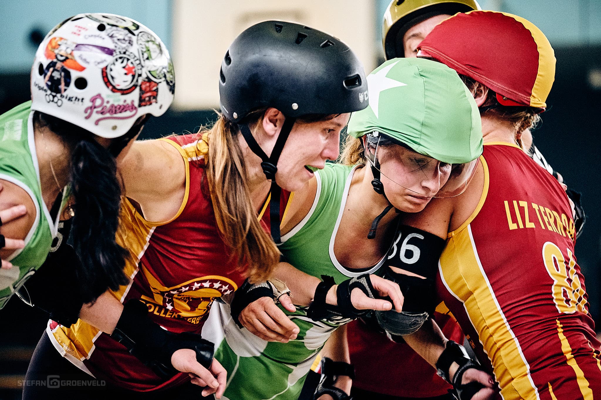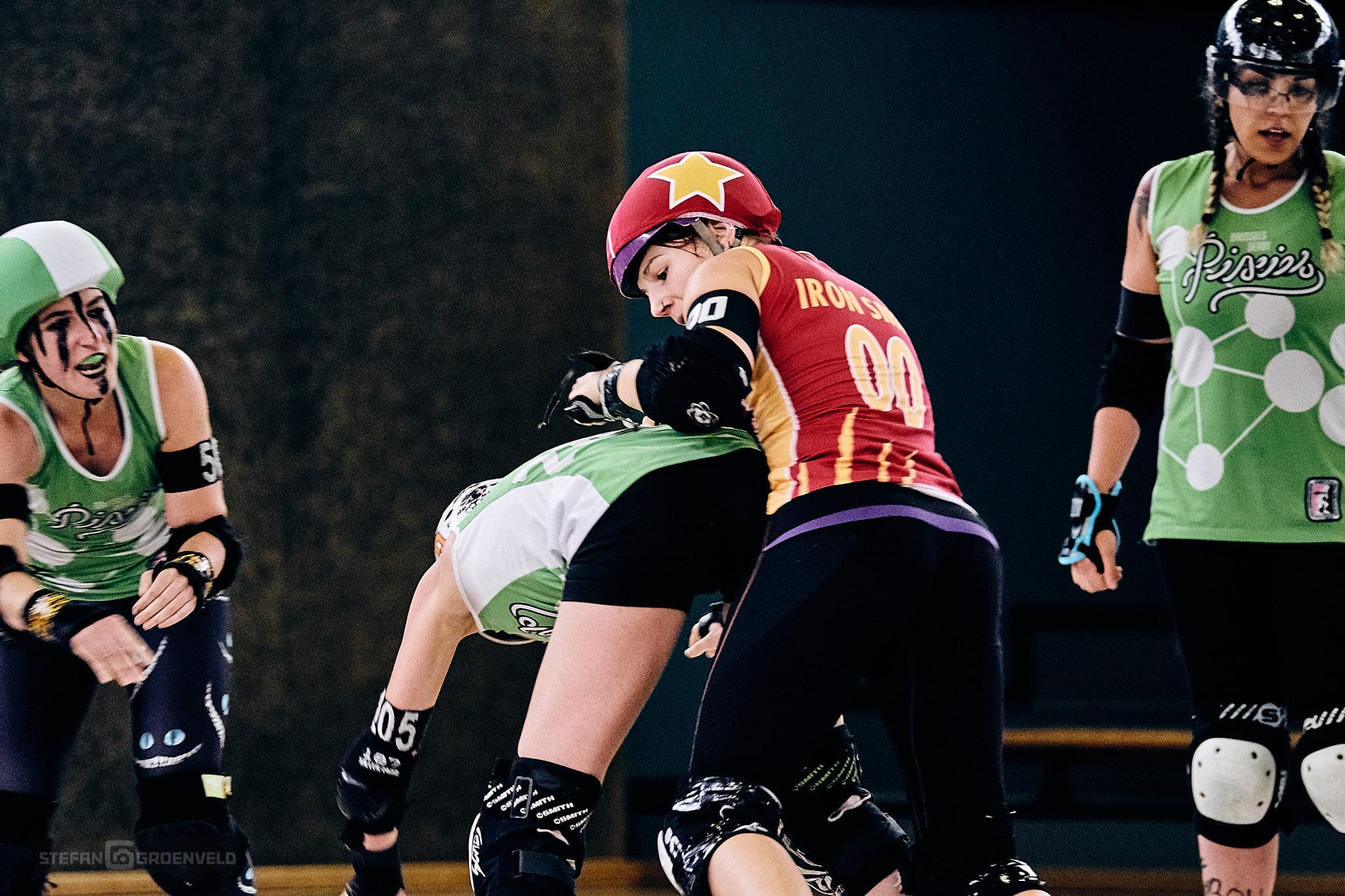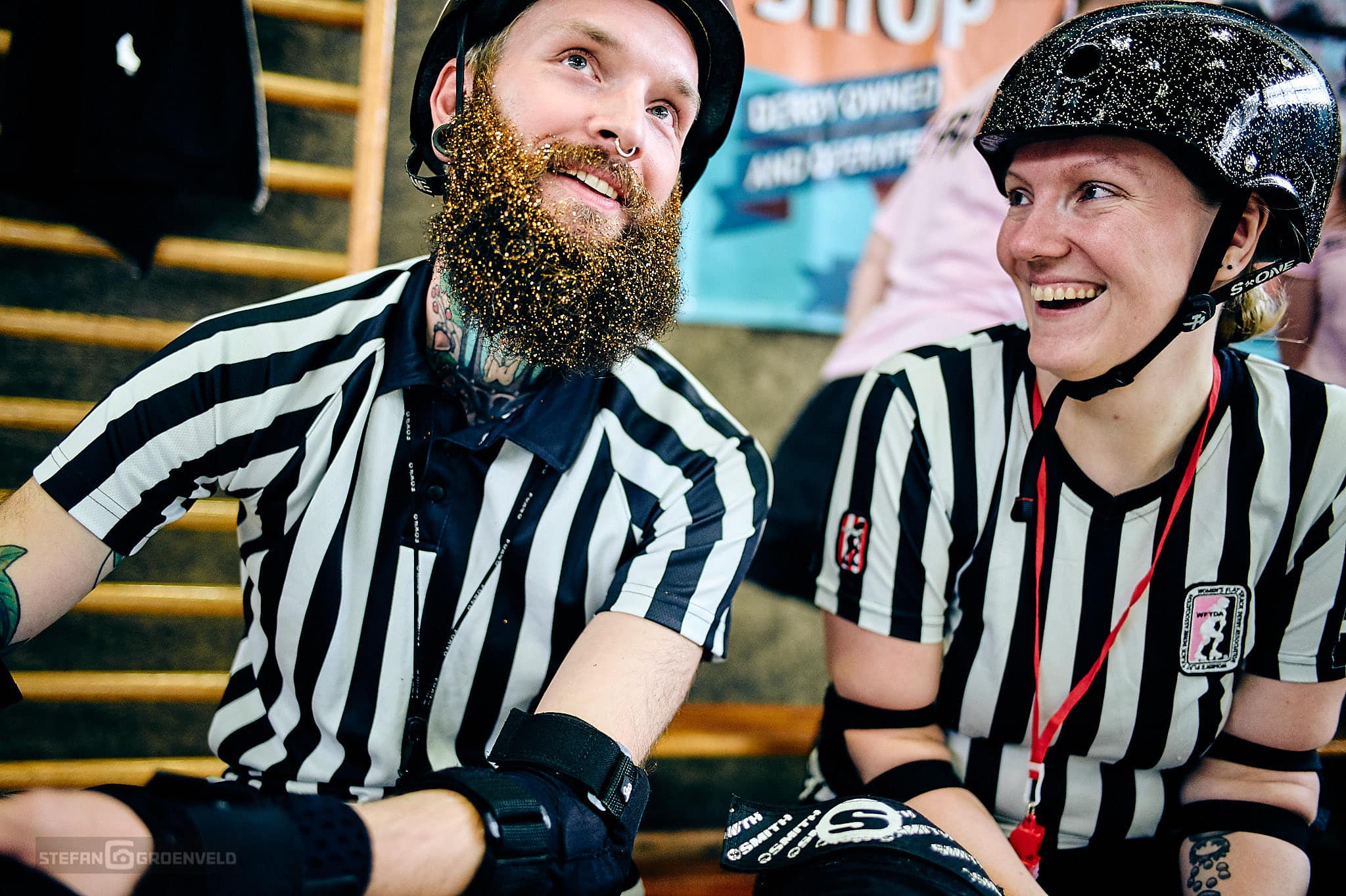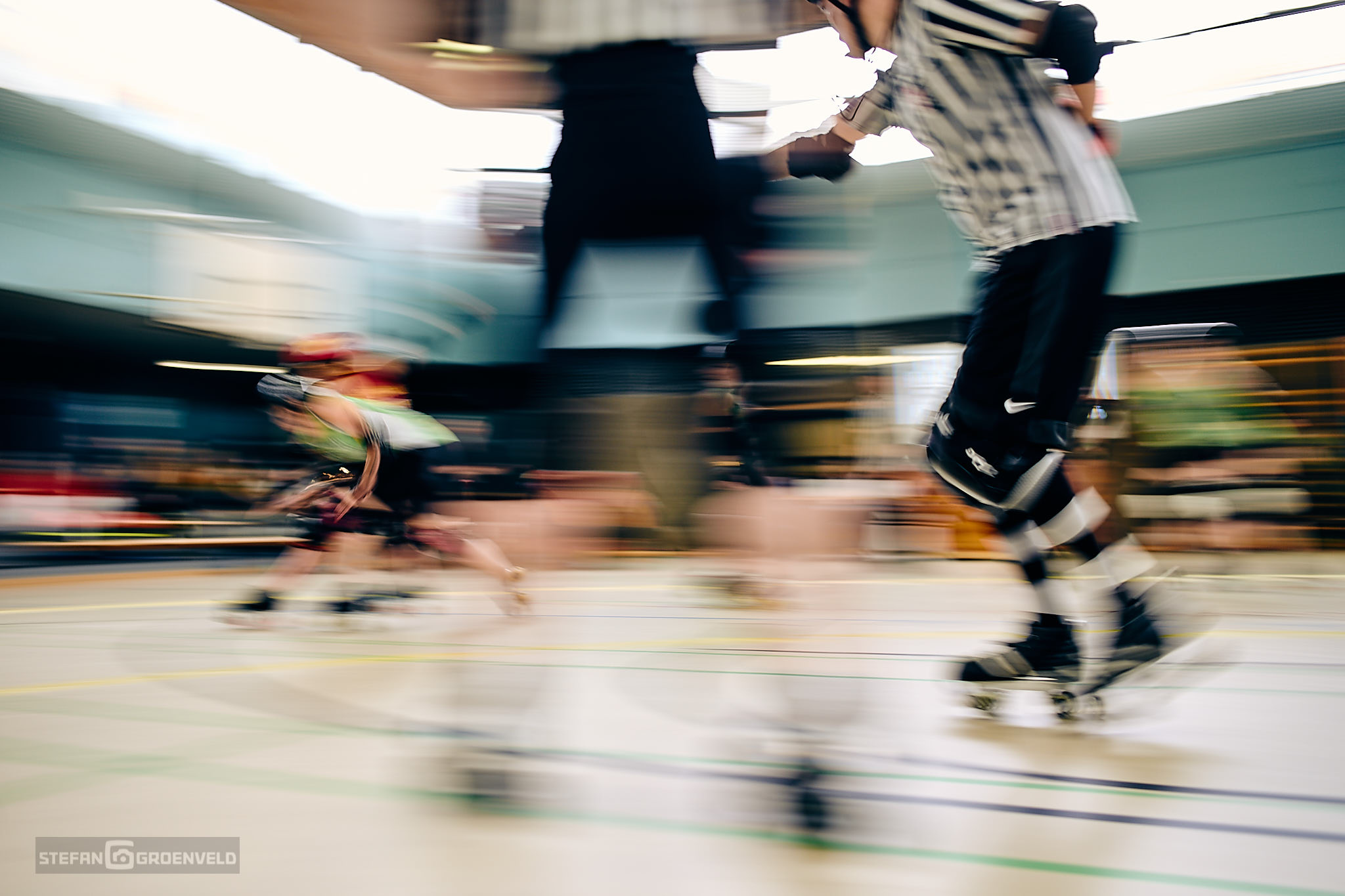 Im zweiten Bout des Tages kam es zu einem belgisch-französischen Duell. Brüssel Derby Pixies jammten gegen Roller Derby Caen und diese Partie war noch spannender und umkämpfter als das deutsche Duell. Die Zuschauer kamen auf ihre Kosten. In einem taktisch sehr fein anzusehenden Bout war die Führung immer nur knapp und wechselte auch zwischendurch. Die Art des Roller Derbys war auch deutlich anders: die wendigen Spielerinnen überzeugten durch ein sehr kraftraubendes Spiel, bei dem sich beide Teams nichts schenkten. Es gab mehrere Jams bei denen wegen des effektiven Blockens überhaupt keine Punkte vergeben wurden. Und dann gab es das eine Jam, bei dem Caen wahnsinnige 30 Punkte einfuhr. Das war jedenfalls Roller Derby zum Zungeschnalzen. Am Schluß musste sich Caen allerdings geschlagen geben – Brussels Derby Pixies gewann gegen Roller Derby Caen mit 173:131.