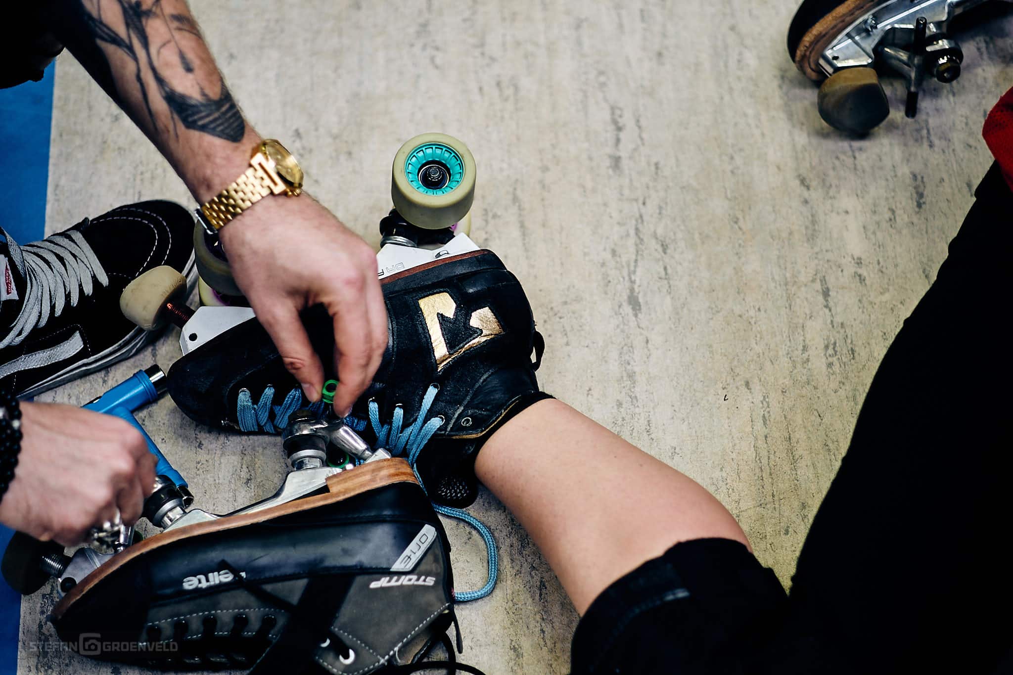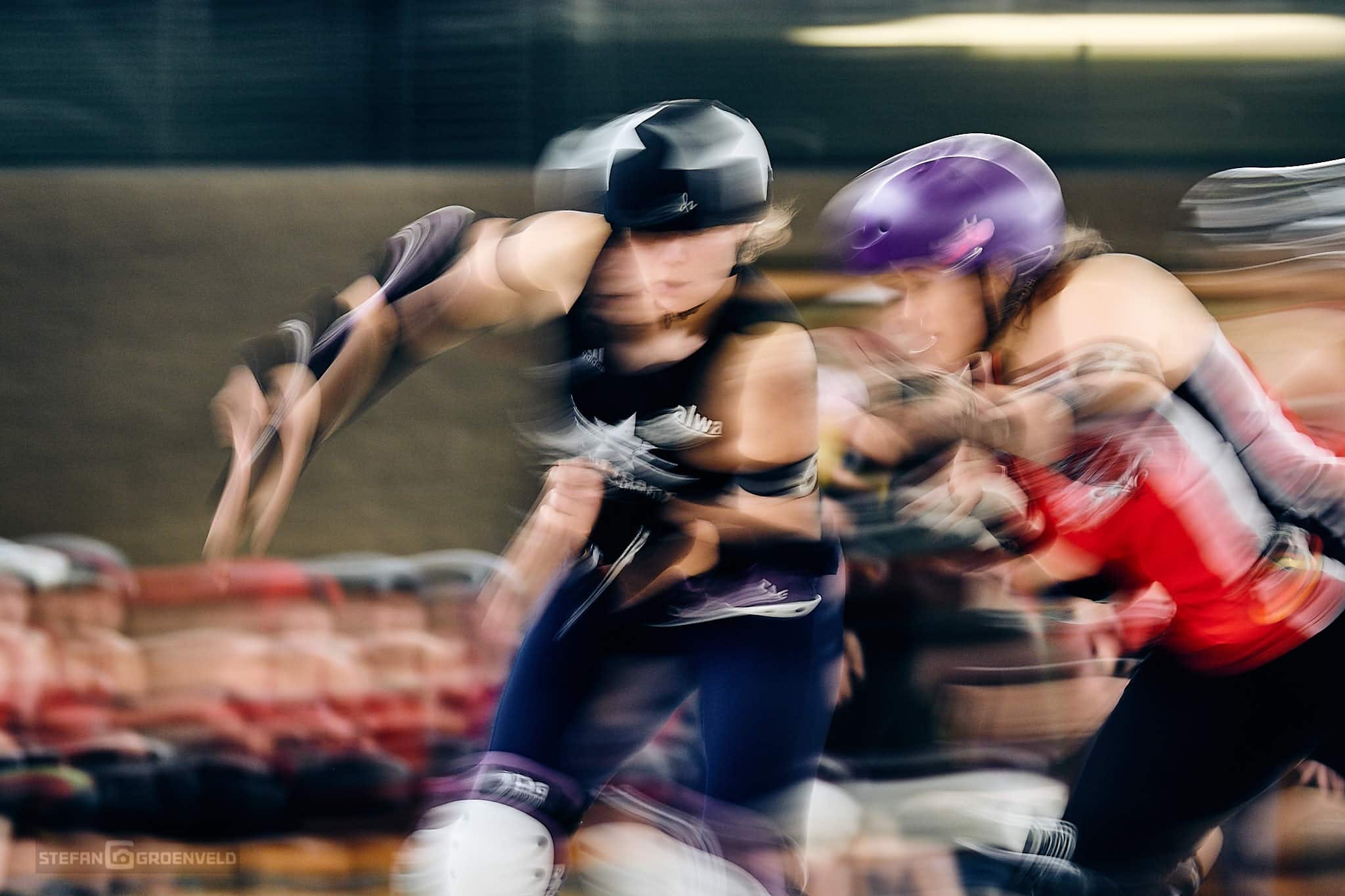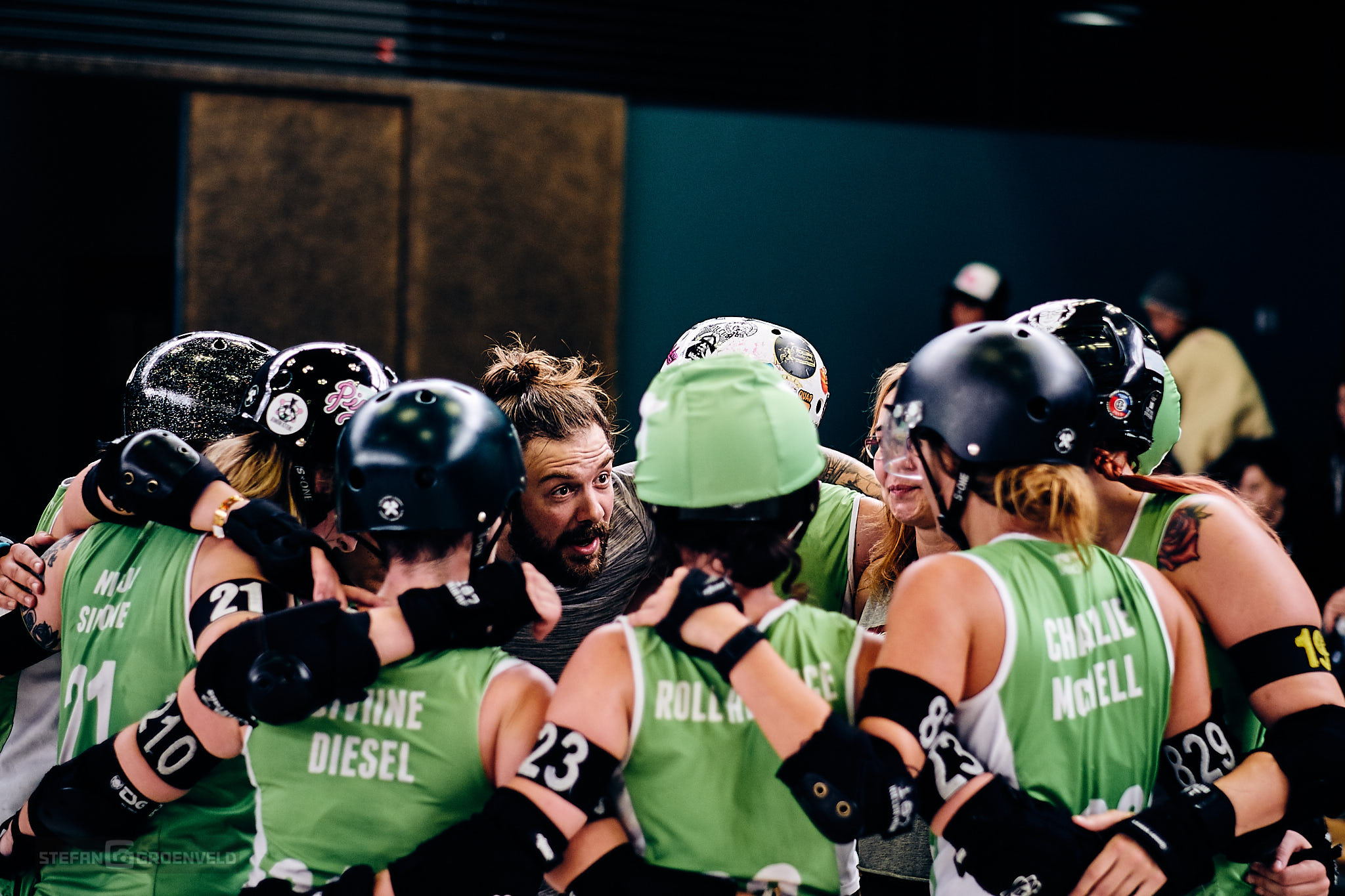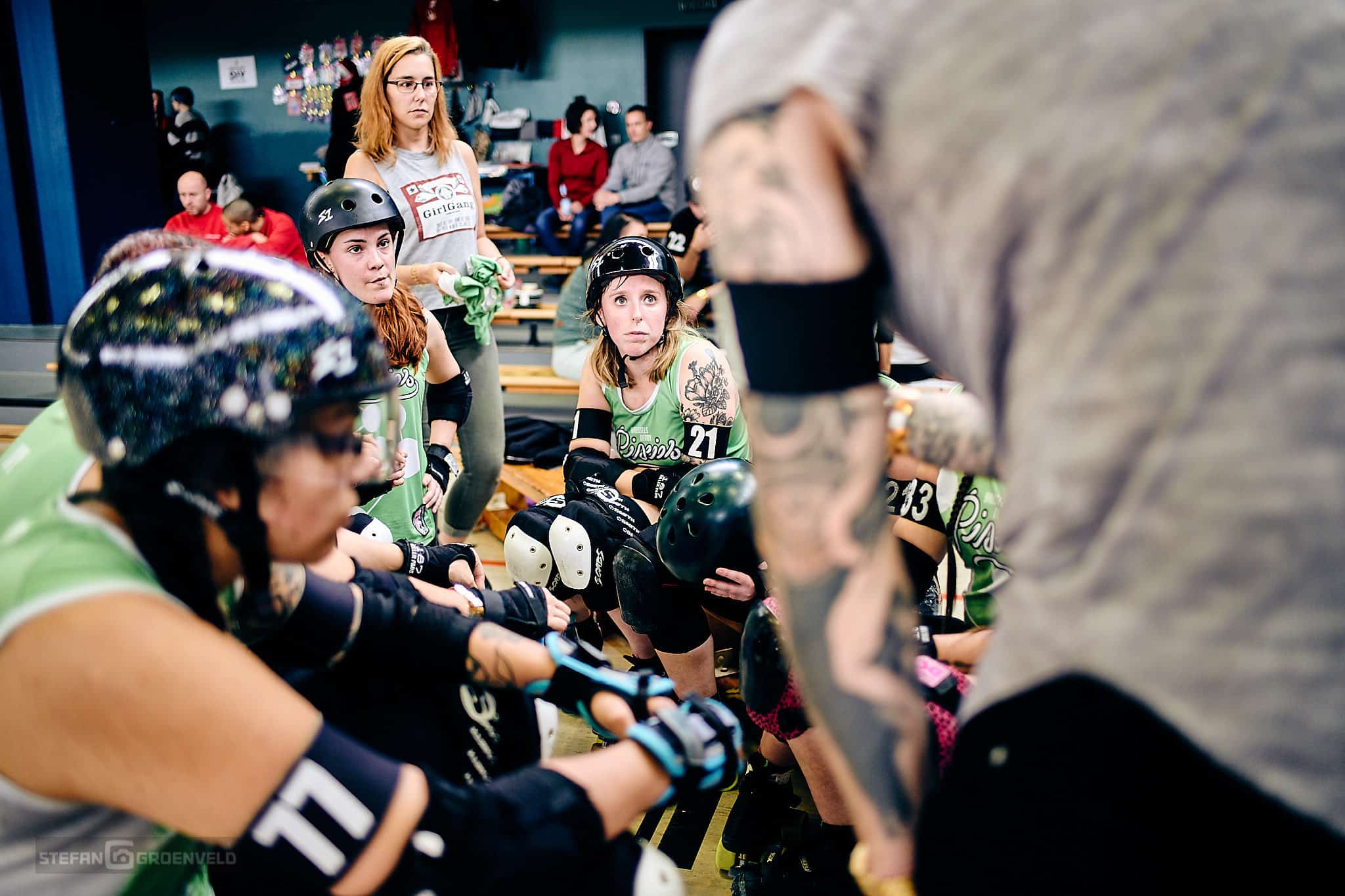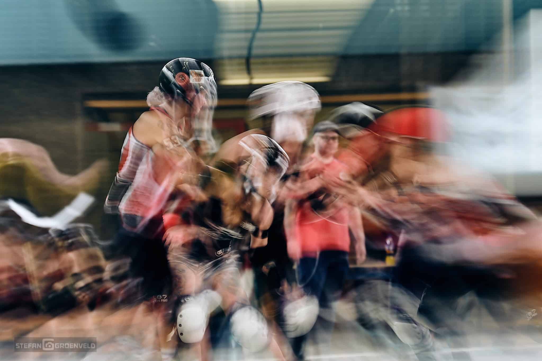 Im zweiten Bout des Tages kam es zu einem belgisch-französischen Duell. Brüssel Derby Pixies jammten gegen Roller Derby Caen und diese Partie war noch spannender und umkämpfter als das deutsche Duell. Die Zuschauer kamen auf ihre Kosten. In einem taktisch sehr fein anzusehenden Bout war die Führung immer nur knapp und wechselte auch zwischendurch. Die Art des Roller Derbys war auch deutlich anders: die wendigen Spielerinnen überzeugten durch ein sehr kraftraubendes Spiel, bei dem sich beide Teams nichts schenkten. Es gab mehrere Jams bei denen wegen des effektiven Blockens überhaupt keine Punkte vergeben wurden. Und dann gab es das eine Jam, bei dem Caen wahnsinnige 30 Punkte einfuhr. Das war jedenfalls Roller Derby zum Zungeschnalzen. Am Schluß musste sich Caen allerdings geschlagen geben – Brussels Derby Pixies gewann gegen Roller Derby Caen mit 173:131.