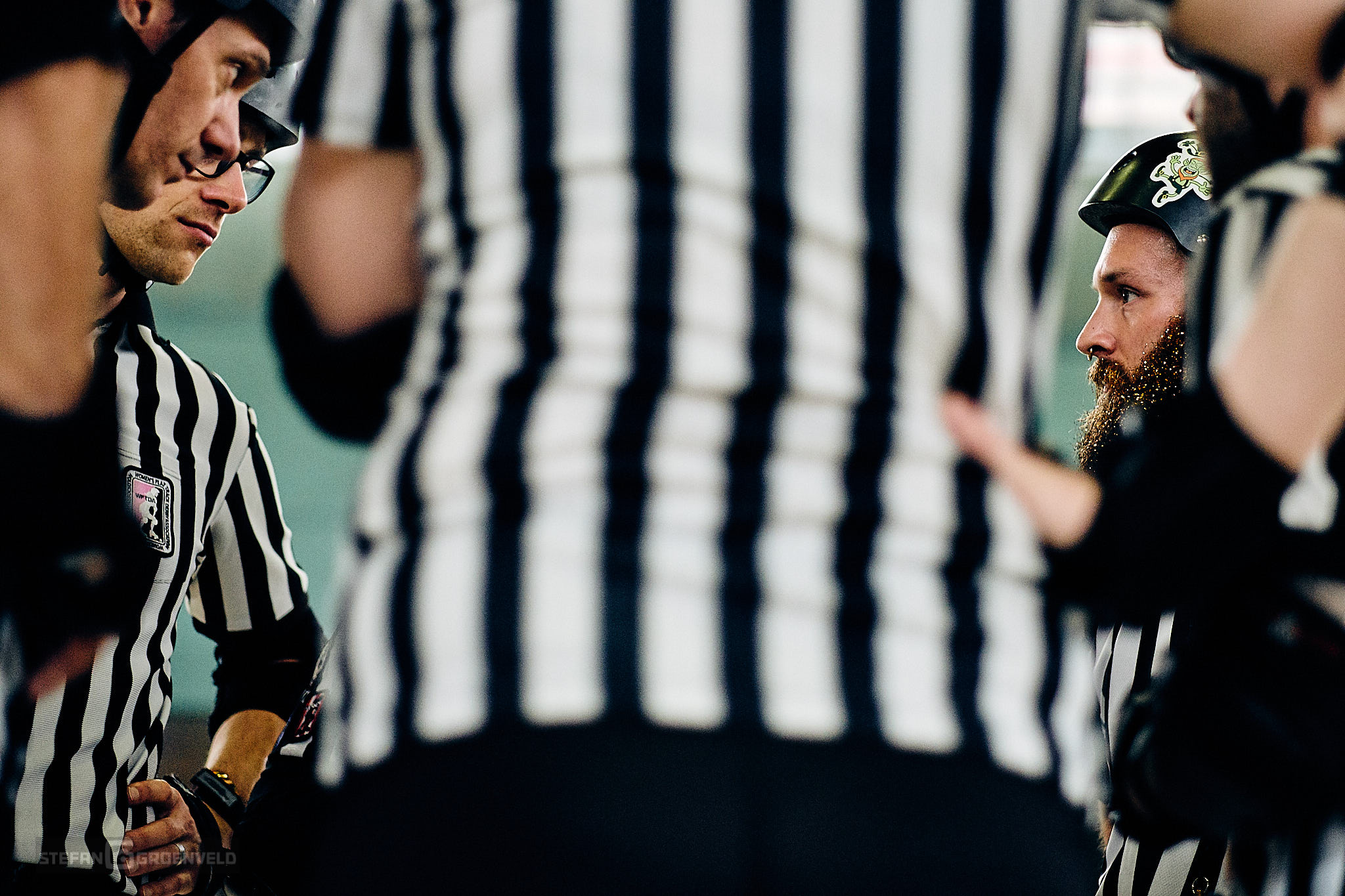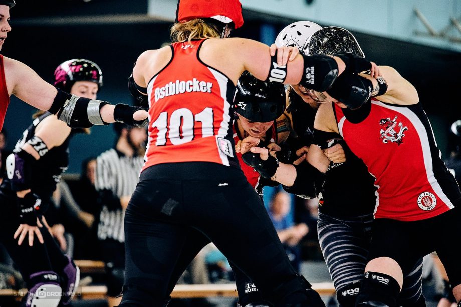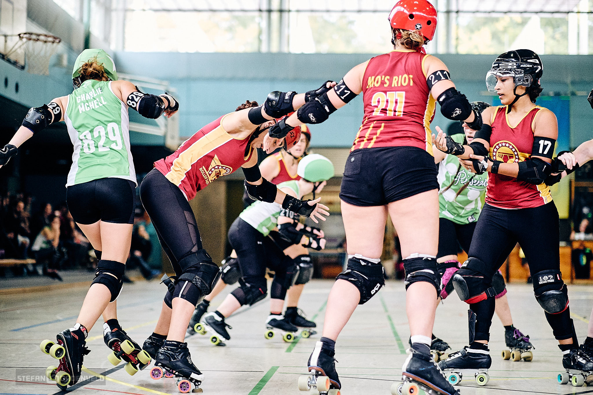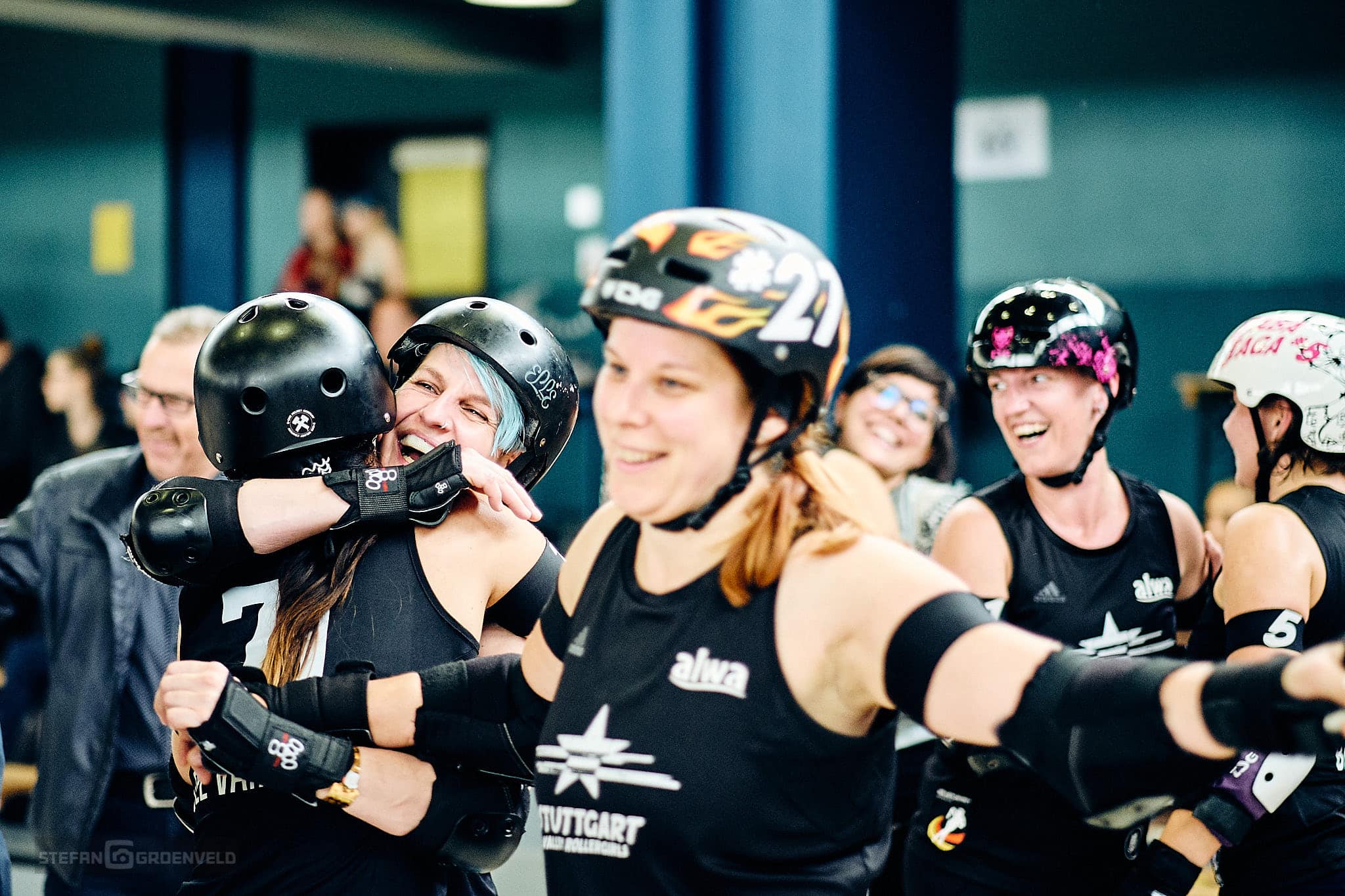 Los ging es am Samstag um 11 Uhr mit dem Bout zwischen Hamburg und Stuttgart um Bundesliga Punkte und einer Vorentscheidung um die deutsche Meisterschaft. Die Harbor Girls haben leider gleich zwei ihrer guten Jammerinnen verloren und gegen Stuttgart schon beim letztes Mal nur knapp gewonnen. Es wurde zum erwarteten schwierigen und umkämpften Bout, bei dem die Stuttgarterinnen dann letztlich doch die Nase vorne behalten haben. 171:221 lautete das Endergebnis, das vielleicht ein paar Punkte zu hoch ausfiel, aber absolut verdient war.