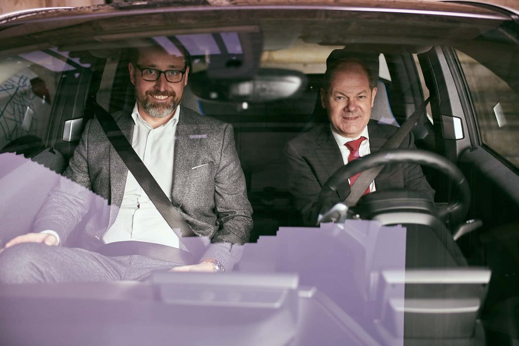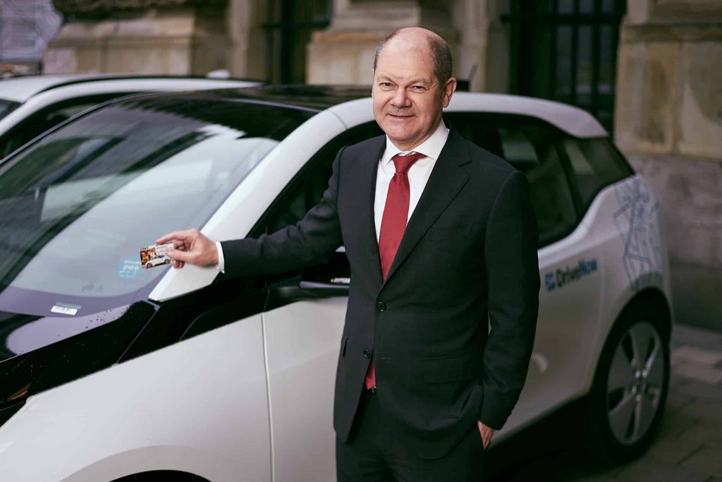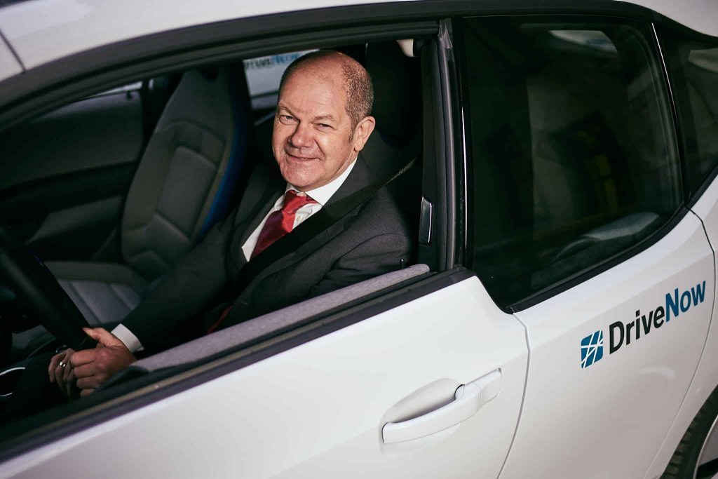 „Das können wir machen“, sagt der Mann. Mir fällt ein kleiner Stein vom Herzen, denn ich wurde von DriveNow gebucht, um den ersten Bürgermeister der Stadt Hamburg Olaf Scholz in einer Viertelstunde mit deren neuen Elektro-Autos zu fotografieren. Durch die Verspätung sind die ersten Minuten schon vorbei, bevor ich angefangen habe. Da ist für ein Brainstorming zur Umsetzung der Bildideen keine Zeit. Ich stelle ihn vor das Auto, gebe freundliche Anweisungen, lasse ihn sich ins Auto setzen und bitte Olaf Scholz sein Jacket zu richten. Im Hintergrund sagt eine Frau mit Terminkalender, dass wir bald zum Ende kommen müssen.