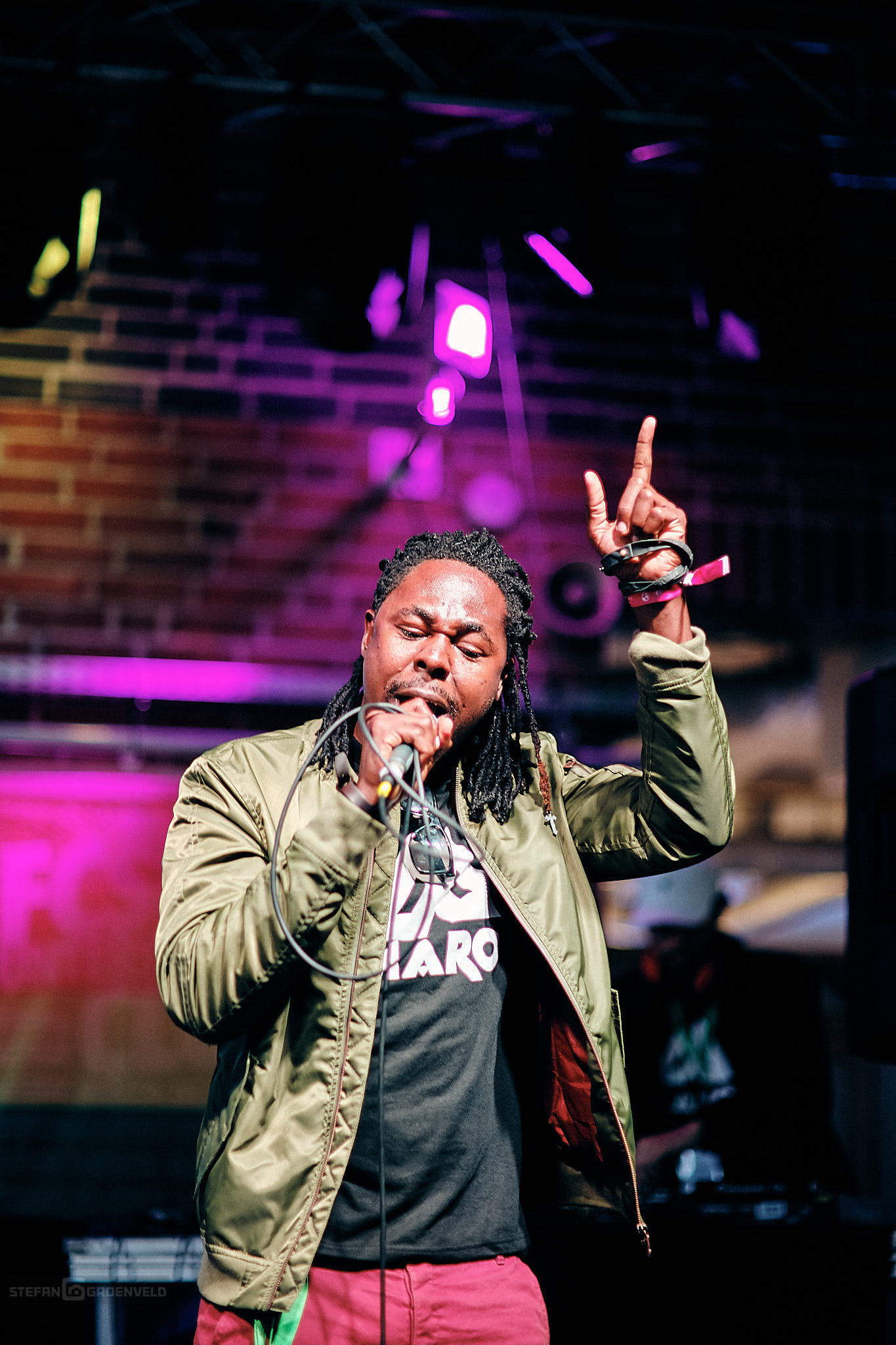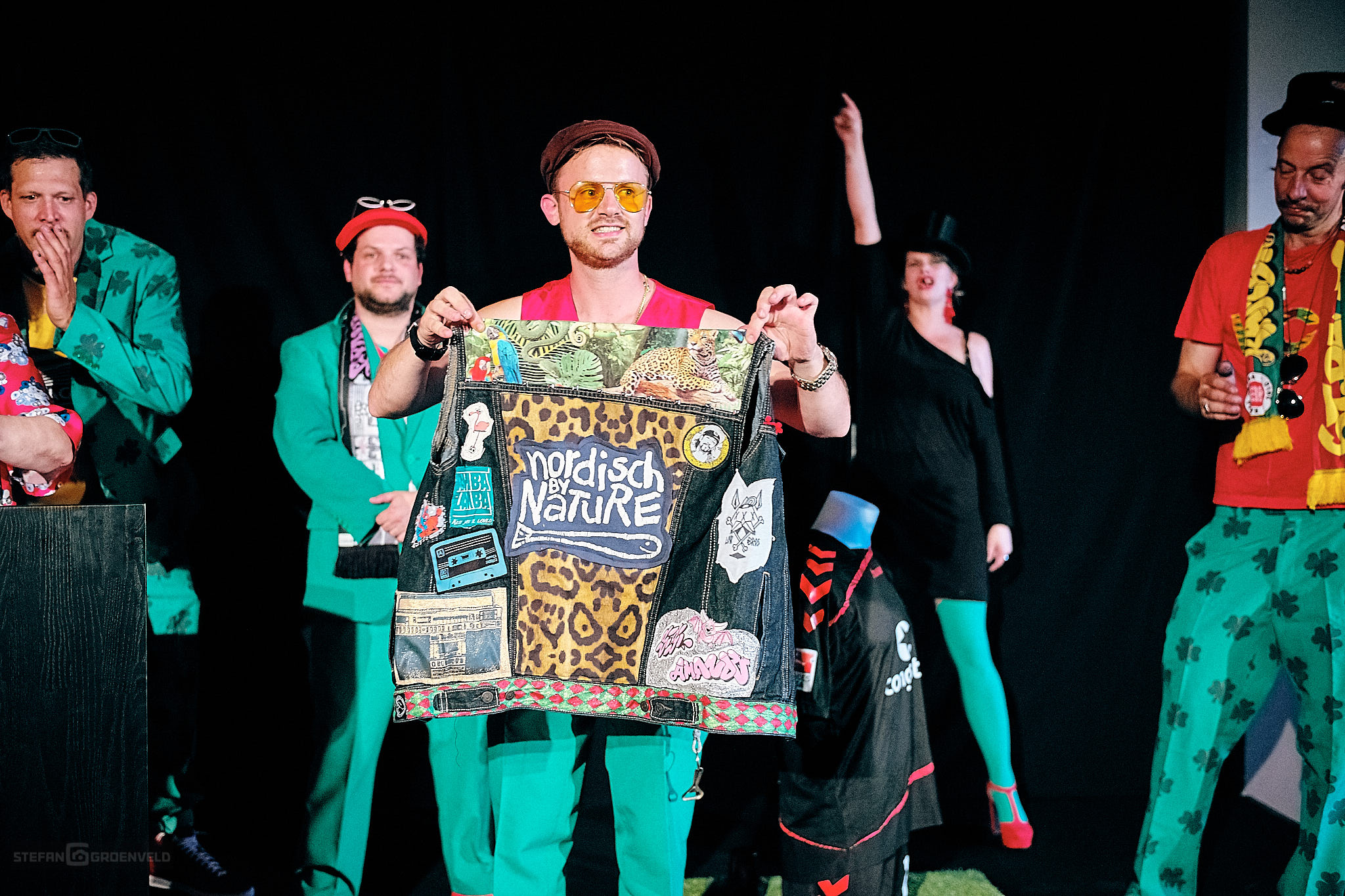 Ich hatte ja nun erstmals das Vergnügen nicht nur als Zaungast mit meiner Kamera dabei zu sein, sondern als Gestalter einer Wand mittendrin zu sein. Die letzten Tage und vor allem Nächte waren entbehrungsreich und ohne die Unterstützung meiner Liebsten, sowie Eberhard und Björn hätte ich das Projekt sicherlich nicht rechtzeitig an die Wand gebracht. Als ich dann völlig übernächtigt die letzten Feinheiten anbringen wollte, stand plötzlich der rasende Kameramann Noah vor mir und drückte mir das Millerntor Gallery Mikrophon in die Hand. Das Ergebnis siehst du oben. Wenigstens musste ich nicht singen…