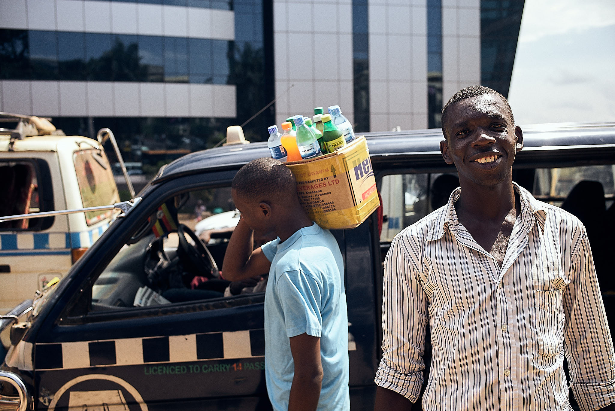 Es gibt aber in Kampala auch ein Bussystem. Matatu heißt die Busse – meistens der Marke Toyota, die in Uganda für 14 Personen zugelassen sind. (Ich glaube in Europa ist das ein Neunsitzer…) Damit sind oft nur „Reisende“ gemeint und dann sind neben Fahrer und „Koberer“ eben 16 Leute im Bus – plus die Einkäufe vom Wochenmarkt oder so. Ich hatte des öfteren jemanden auf meinem Schoss sitzen, denn im Zweifelsfall lässt man natürlich niemanden draußen stehen. Die Matatus fahren auf festgelegten Routen durch Kampala. Da auf den Bussen nicht drauf steht, wohin er fährt, sitzt ein „Koberer“ an der großen seitlichen Schiebetür, ruft die Fahrtrichtung aus dem Fenster und regelt das Ein- und Aussteigen an den Haltestellen. Er kassiert auch. Es ist folglich ratsam, immer ein paar Scheine in der Tasche zu haben. Die Fahrt kostet je nach Streckenabschnitt zwischen 500 und 1000 ugandische Schilling. Das entspricht 0,12 bis 0,24€. Eine wirklich günstige Möglichkeit sich in der Stadt fortzubewegen.