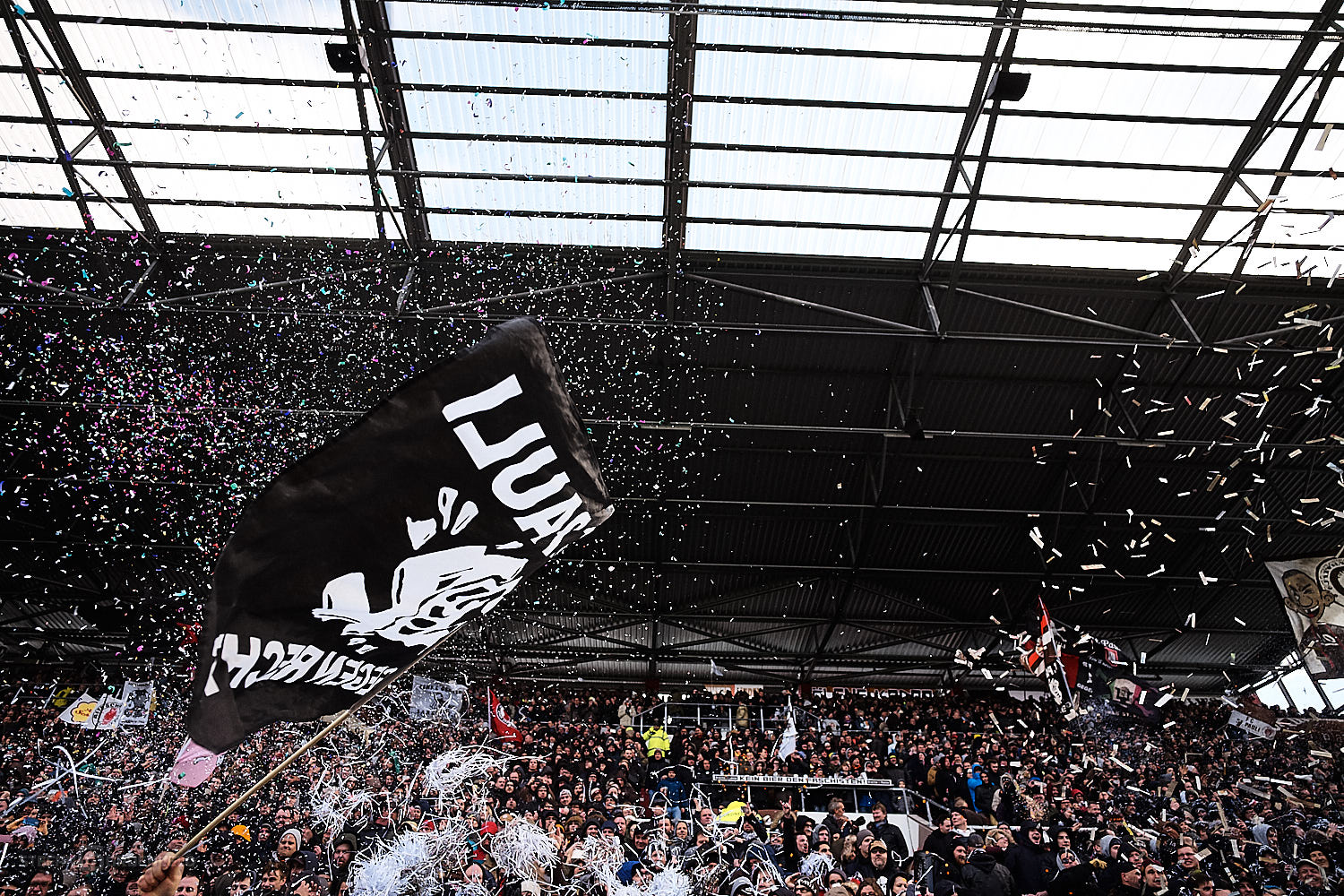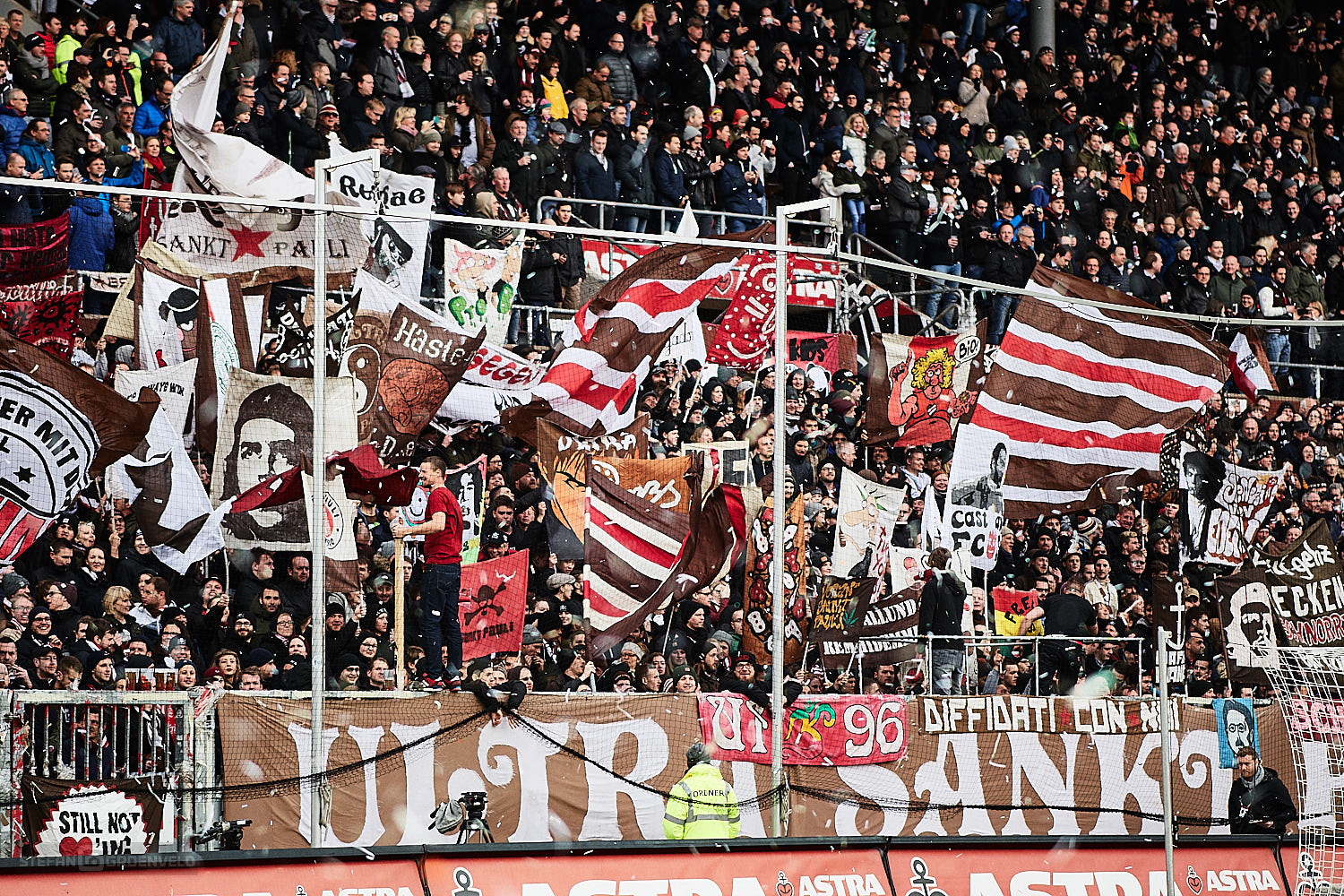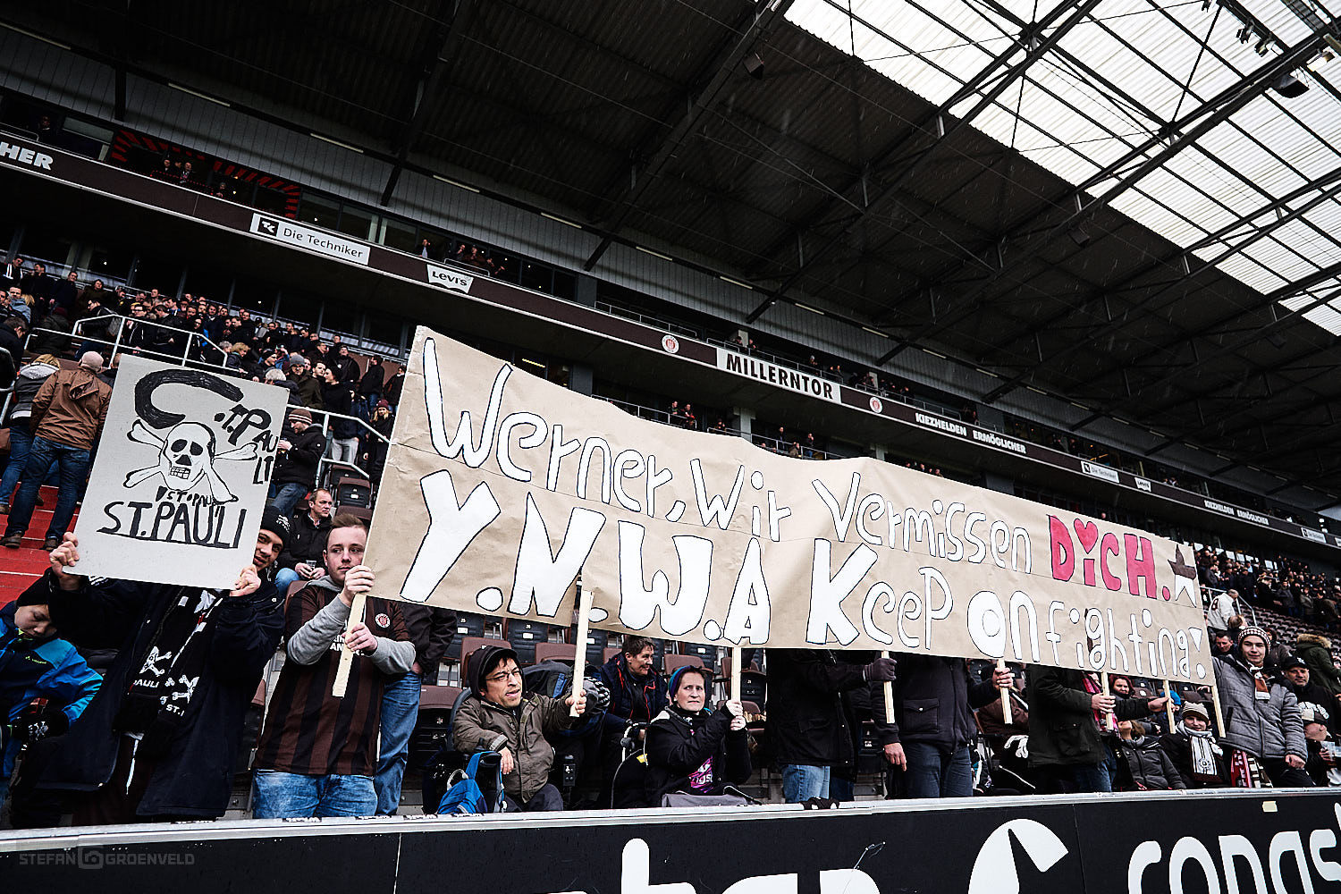 Ganz stark dagegen die Aktion der St. Pauli Fans auf den sogenannten Behindertenplätzen, die für den im Krankenhaus liegenden „Rolli-Werner“ eine fette Choreo bauten. Gute Besserung auch von dieser Stelle.