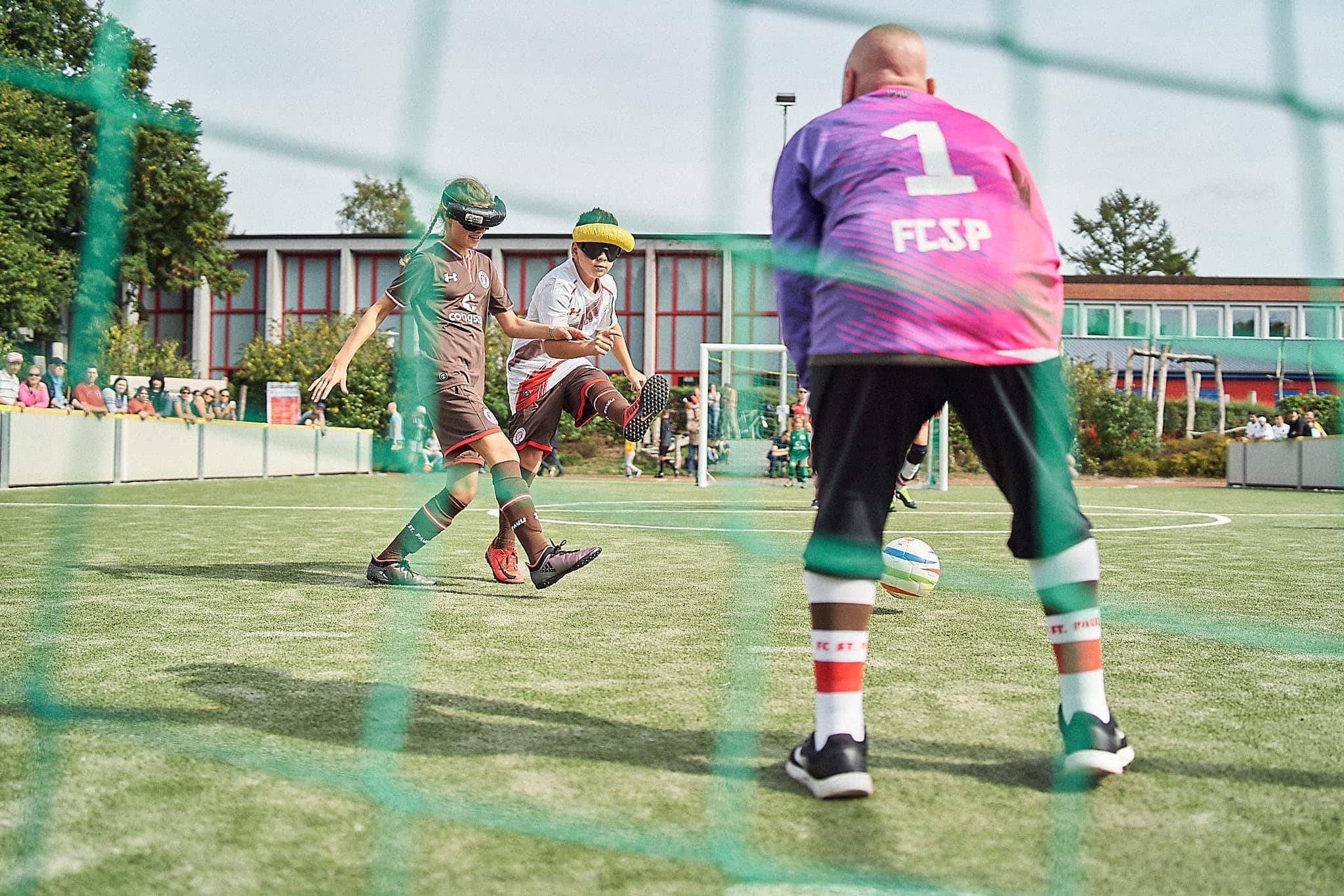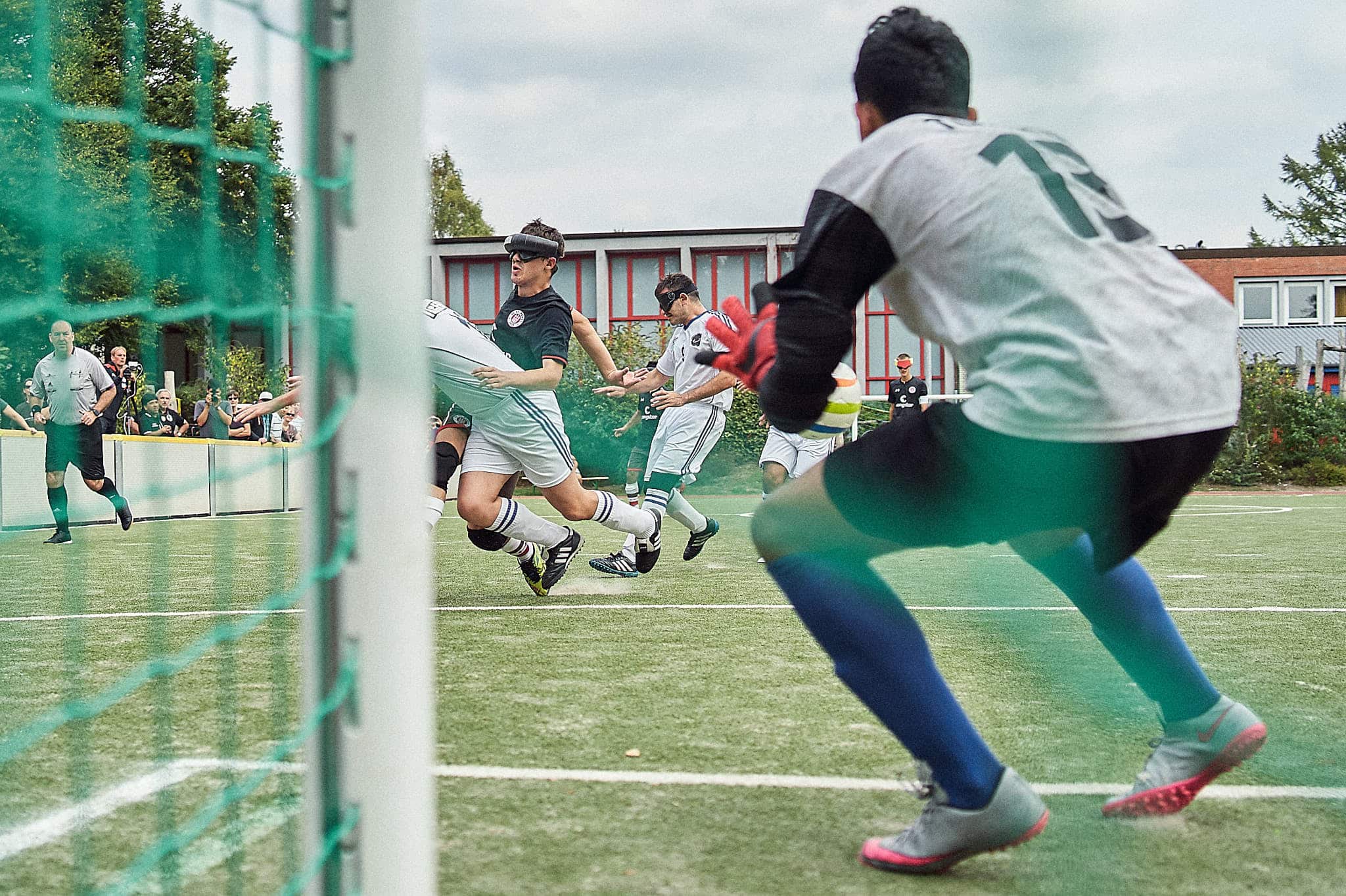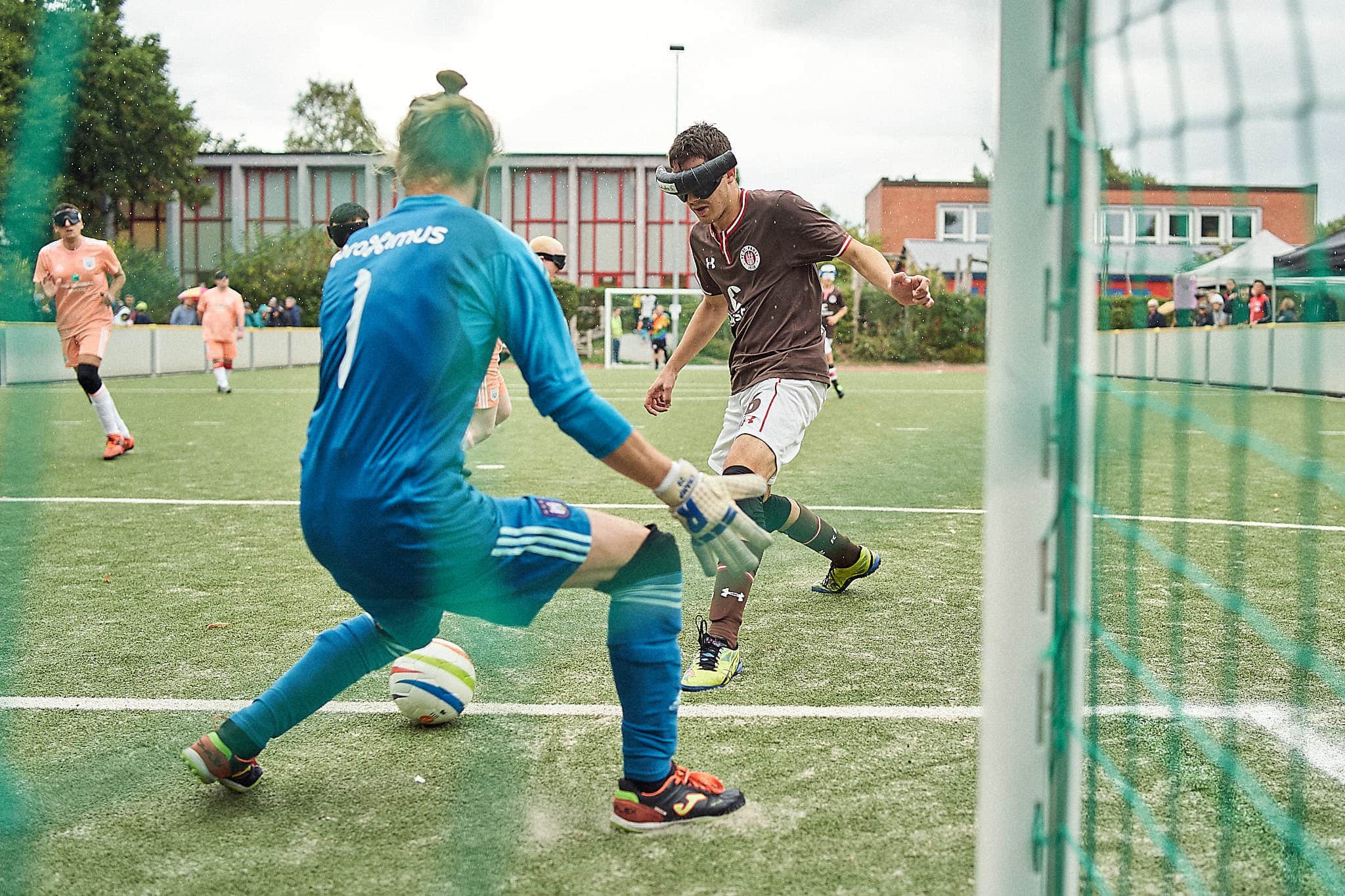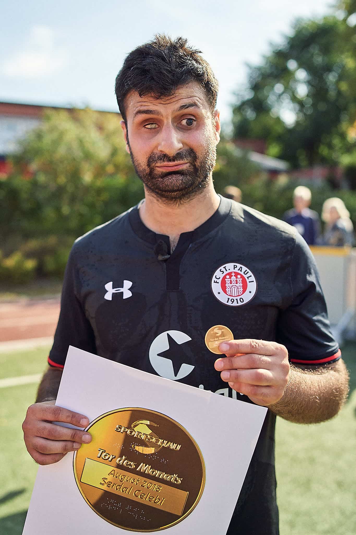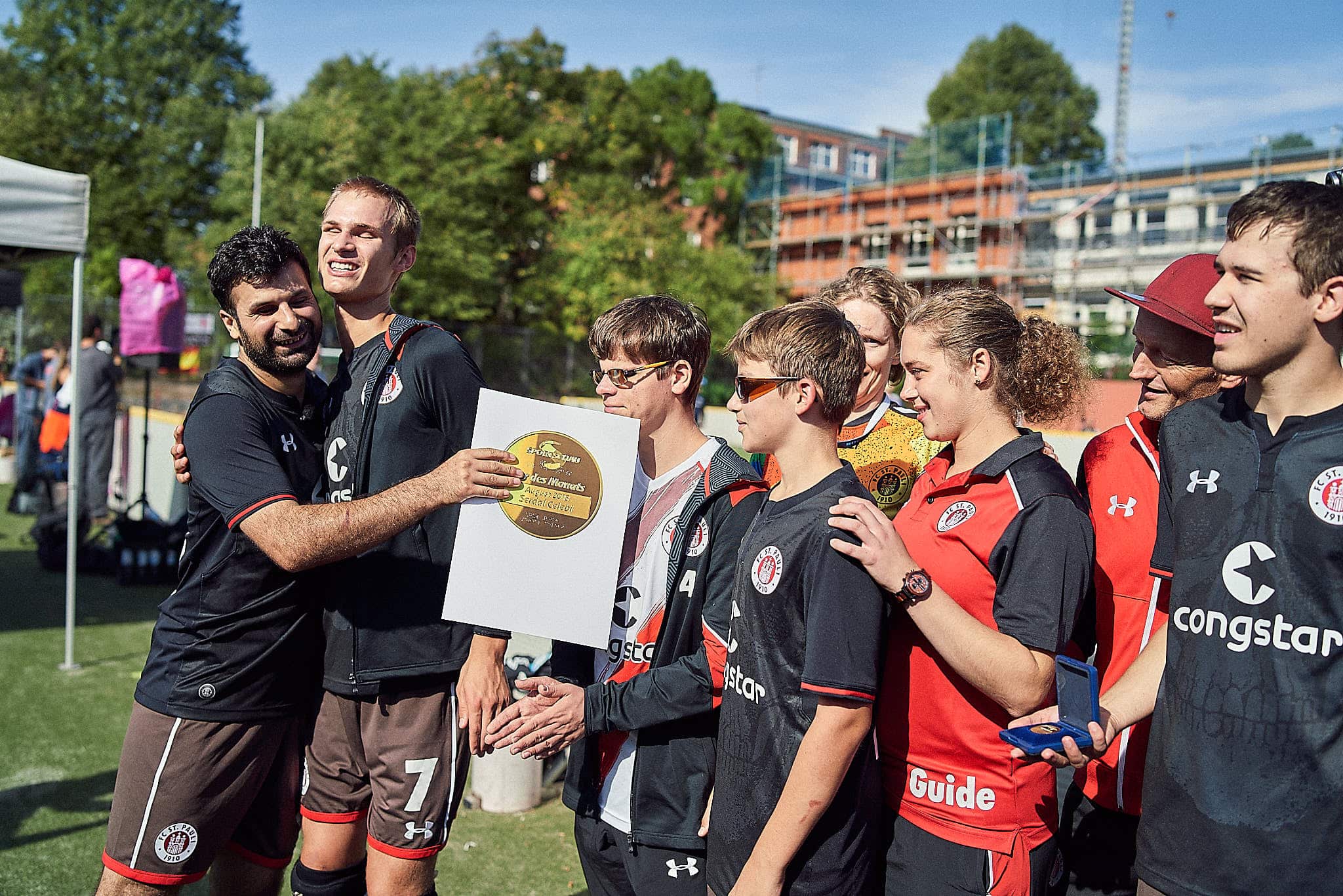 Erstmals waren (zumindest am Sonntag) auch richtig viele Zuschauer beim Blindenfussball Masters. Selbst HFV Präsident Dirk Fischer schaute vorbei. Das rege Interesse hatte sicherlich auch mit der Nominierung von FC St. Pauli Spieler Serdal Celebi beim “Tor des Monats” zu tun, zumindest sorgte das für eine gute filmische Begleitung des Turniers. Selbst ein dpa Fotograf gab sich Samstag die Ehre, um entsprechendes Bildmaterial zur Verfügung zu stellen. Dafür war ich dann am Sonntag der einzige, der die Ehrung fotografieren konnte – denn Serdal hat tatsächlich mit überragenden 36% das Voting gewonnen. Sensationell und ganz fetten Glückwunsch, mein Lieber! Die Sportschau hatte am Sonntag einen wunderbaren Beitrag ins Programm genommen.