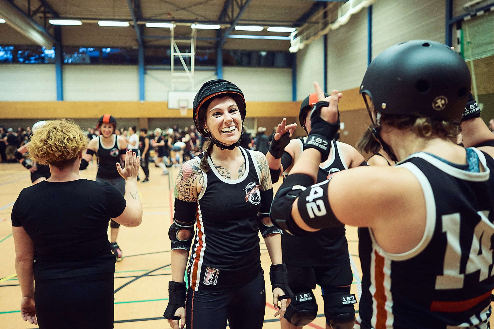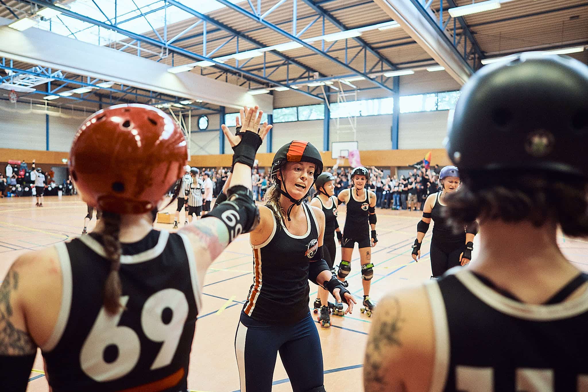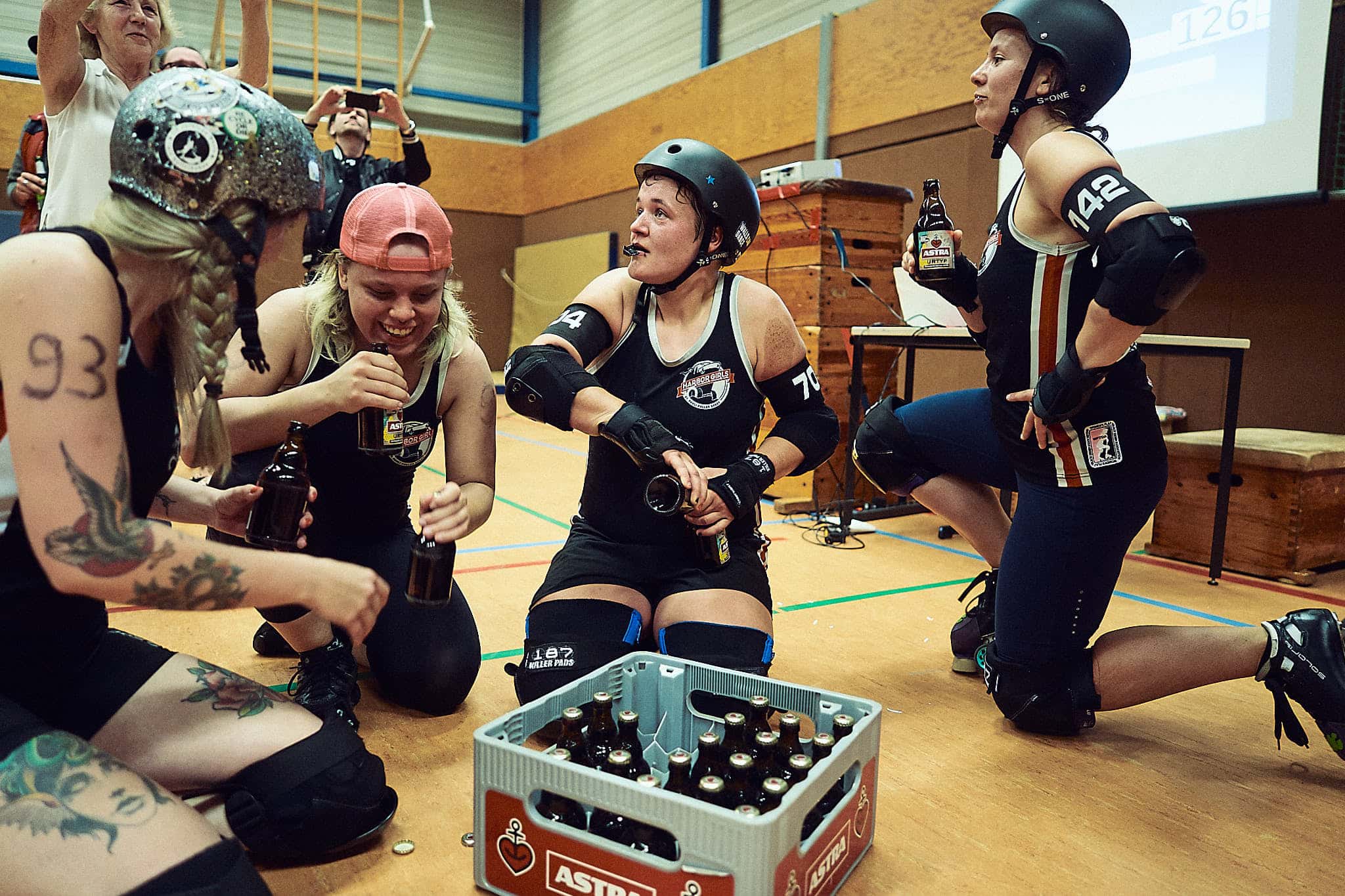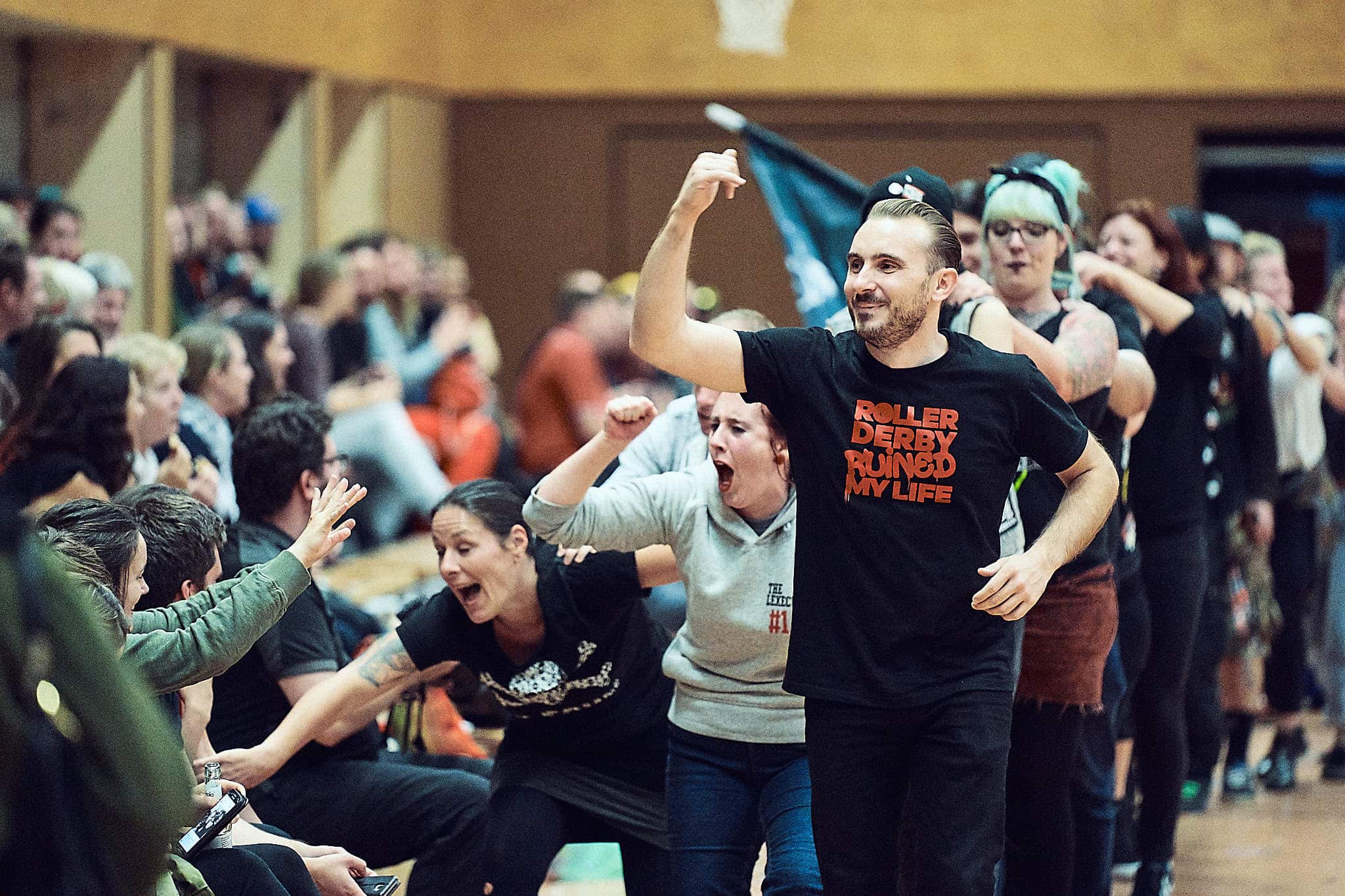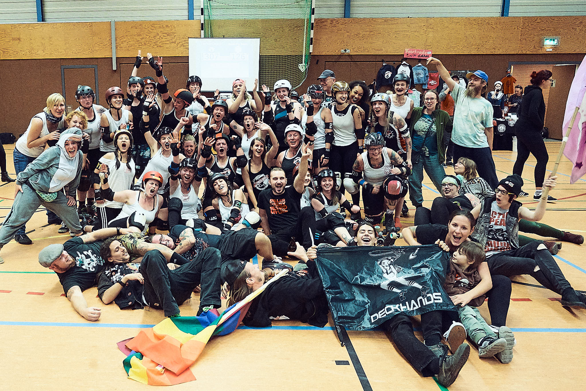 Selbstverständlich ist es beim Rollerderby so, dass Fans friedlich nebeneinander sitzen können und ihre Teams anfeuern. Genauso selbstverständlich ist es, dass die Team hinterher gemeinsam feiern.
