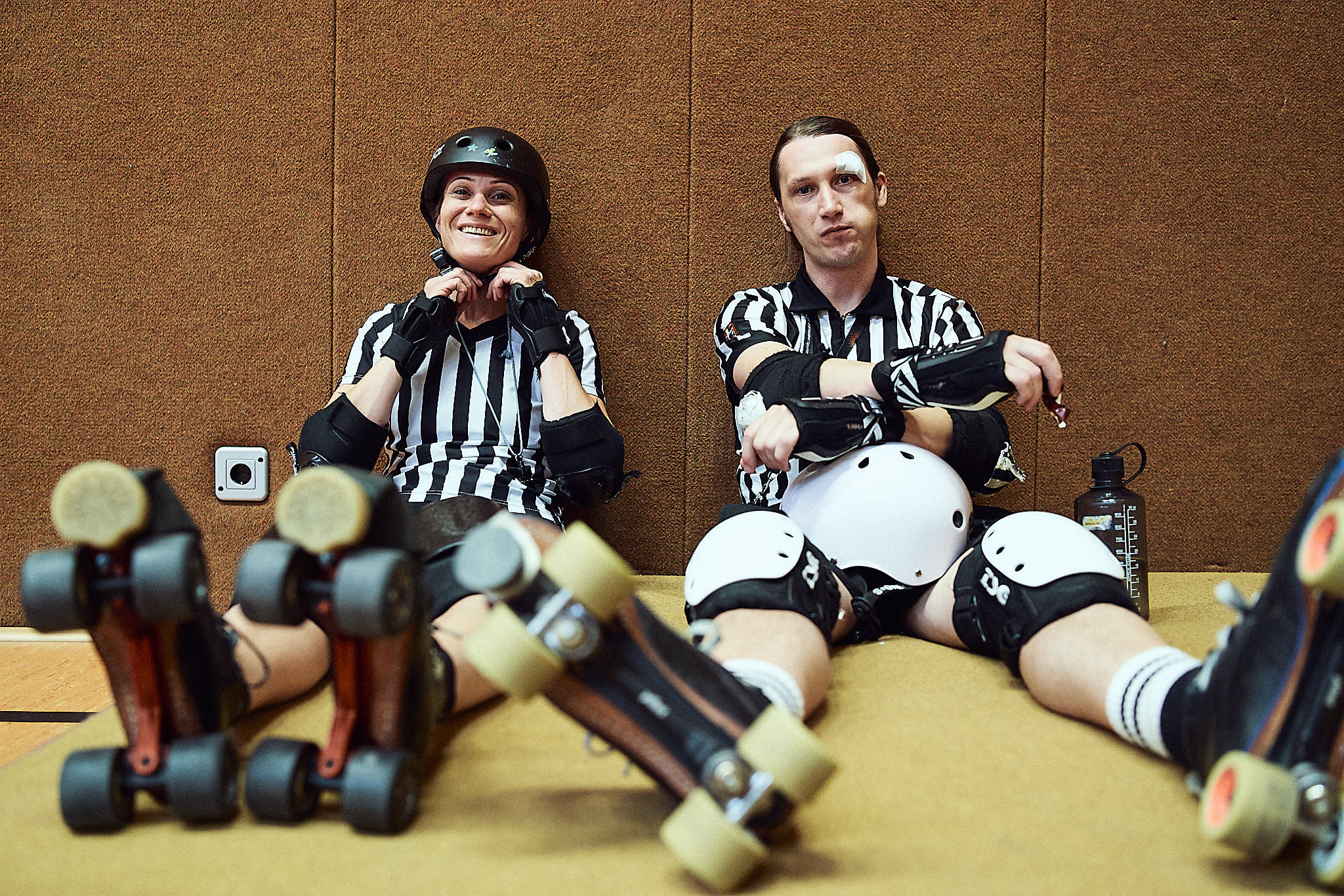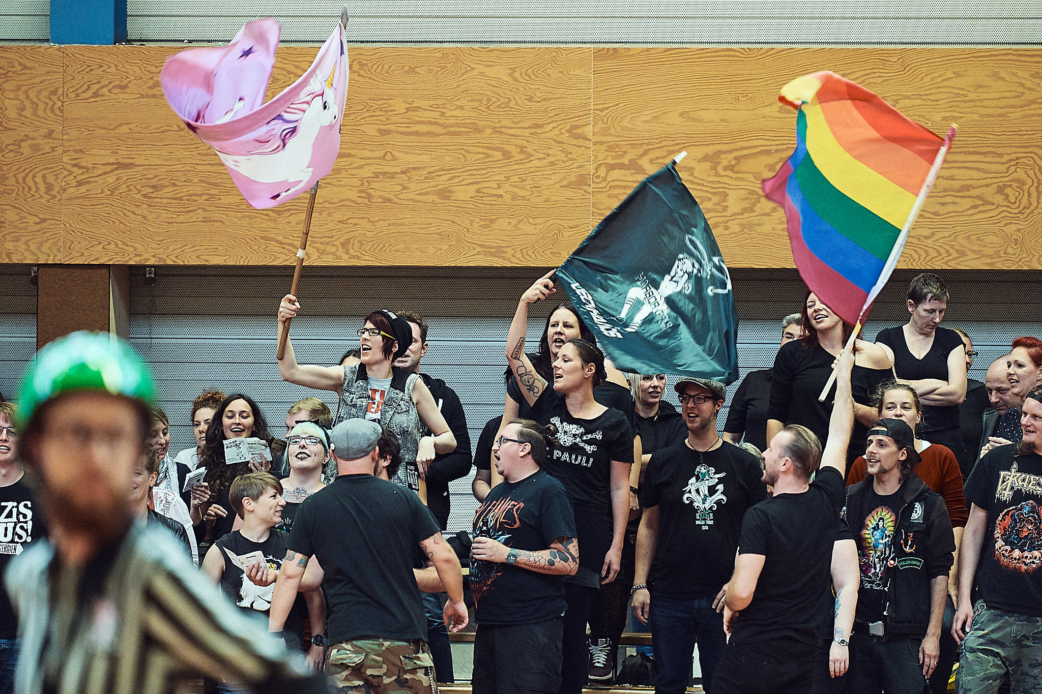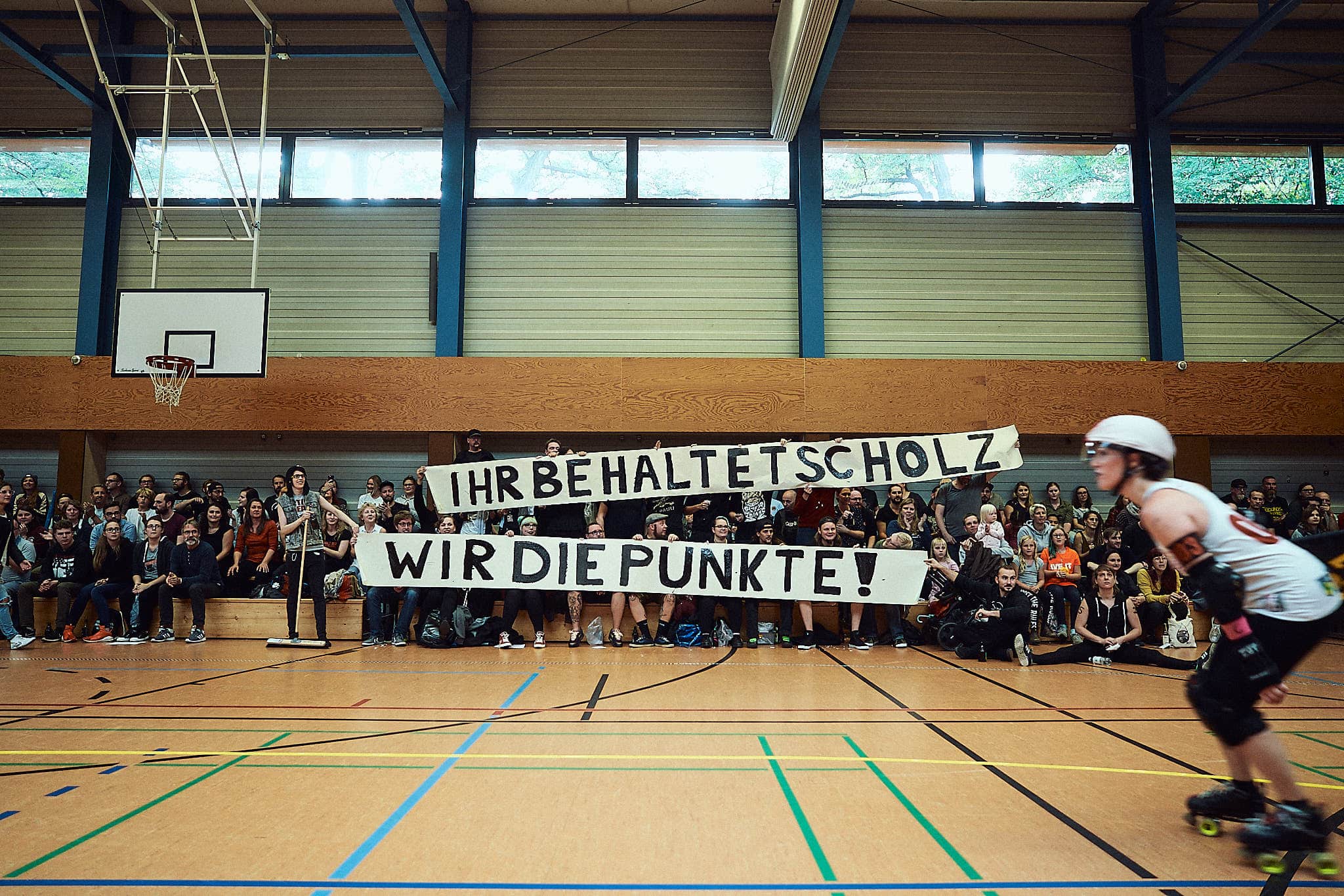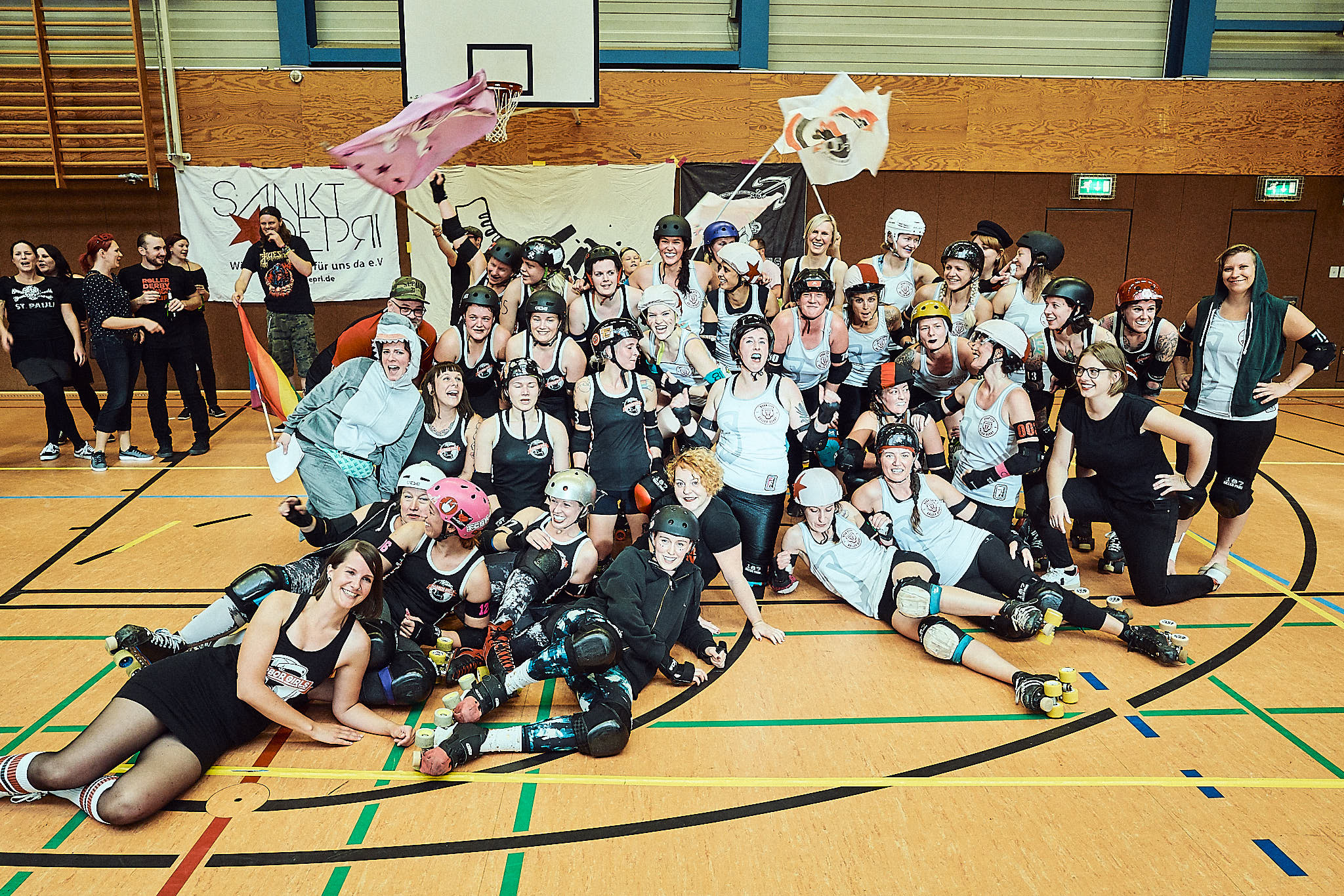 Selbstverständlich ist es beim Rollerderby so, dass Fans friedlich nebeneinander sitzen können und ihre Teams anfeuern. Genauso selbstverständlich ist es, dass die Team hinterher gemeinsam feiern.