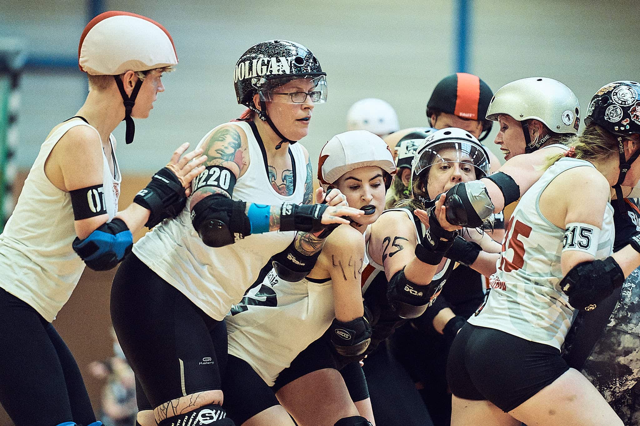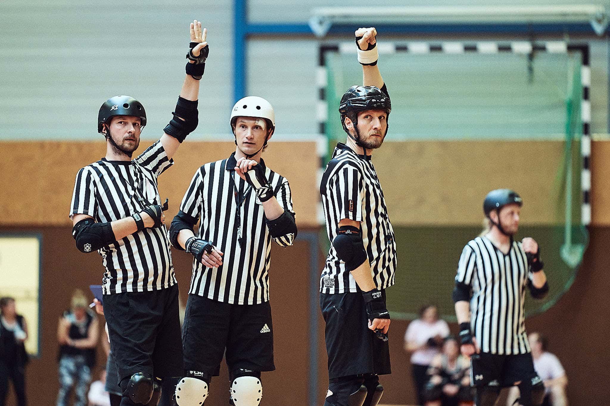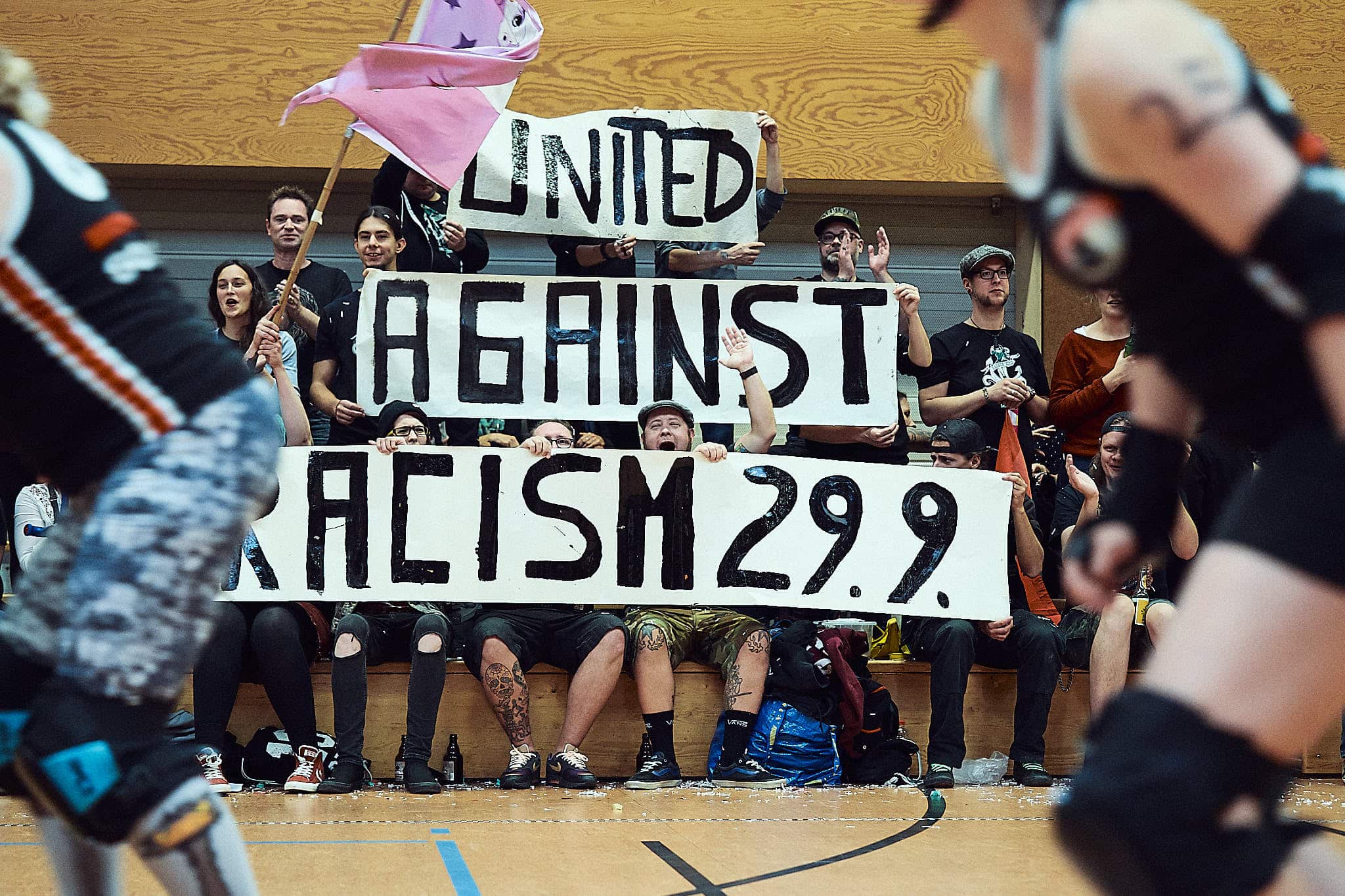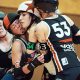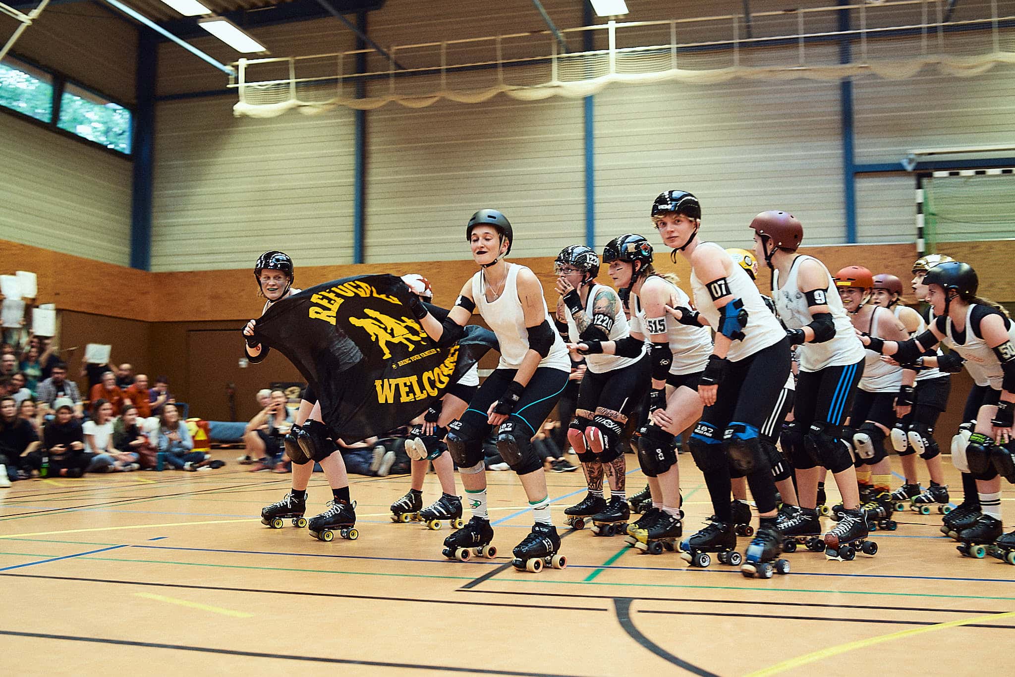Selbstverständlich ist es beim Rollerderby so, dass Fans friedlich nebeneinander sitzen können und ihre Teams anfeuern. Genauso selbstverständlich ist es, dass die Team hinterher gemeinsam feiern.
