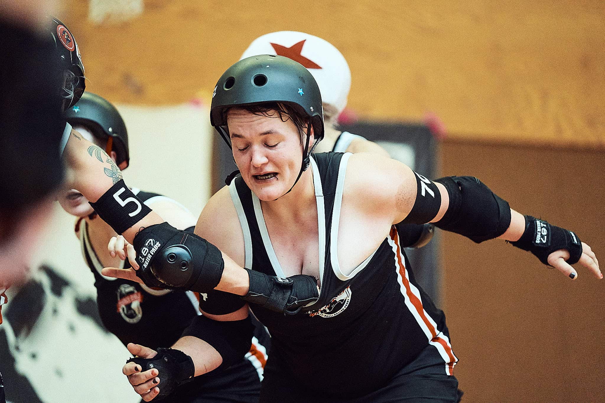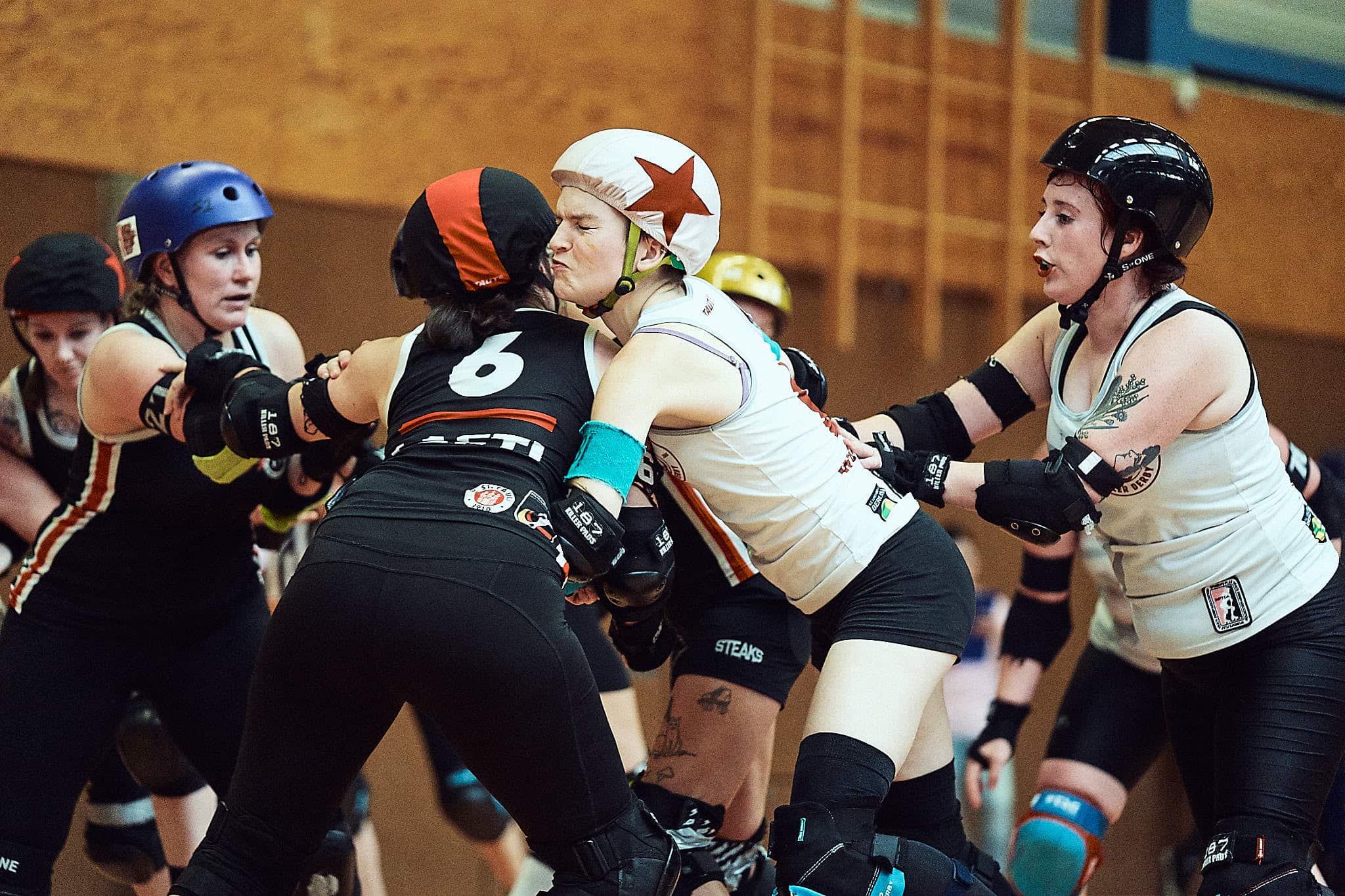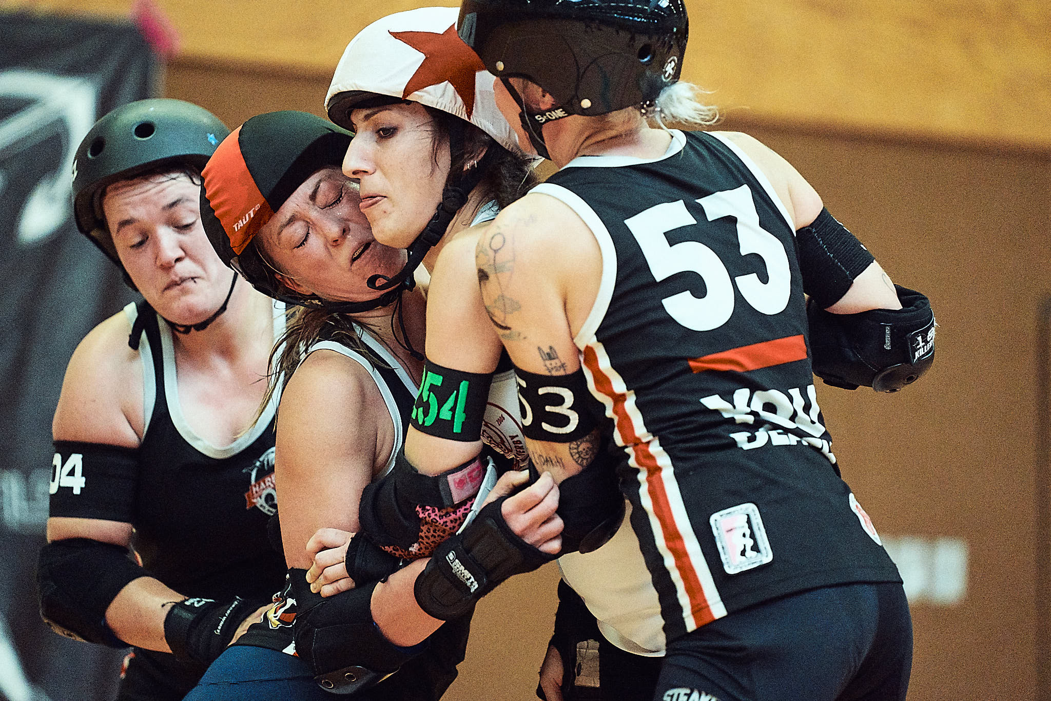 Zum Feiern für’s Punktekonto waren dann die Ergebnisse für die Hamburgerinnen, die beide Bouts für sich gewinnen konnten. Zunächst 191 zu 119 bei A gegen B und dann 307 zu 126 bei B gegen C. Double Header par excellence. Zumindest im ersten Bout war aber das Ergebnis deutlicher als der Spielverlauf. Die Berlinerinnen waren eigentlich immer in Schlagdistanz. Die Erfolge gehen aber trotzdem völlig in Ordnung. Das C Team der Berlinerinnen war wohl auch mit vielen Neulingen gespickt, denn am Anfang musste den Fahrerinnen noch das System an der Bench erklärt werden, damit die Gruppierungen zusammen bleiben können.