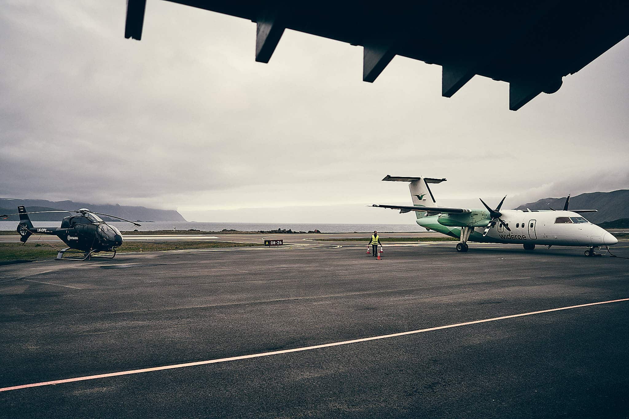 Die Anreise erfolgte von Tromsø bis Honnigsvåg per Flugzeug (mit Zwischenstop und freier Sitzplatzwahl) in der unten abgebildeten Propellermaschine. Und wir hatten Glück: am Tag vorher war der Nebel so dicht, dass der Flugverkehr nicht möglich war. Meine Auftraggeberin hatte dankenswerterweise einen Fahrer organisiert, der uns mit vielen Geschichten versorgte und wohlbehalten zum Nordkap und zurück brachte. Der Ex-Lehrer wir mit seinem 75 Jahren gerne als Fahrer gebucht, weil er keinen Alkohol trinkt. Bei zweieinhalb Monaten ohne Sonne eine wohl eher selten anzutreffende Angewohnheit…