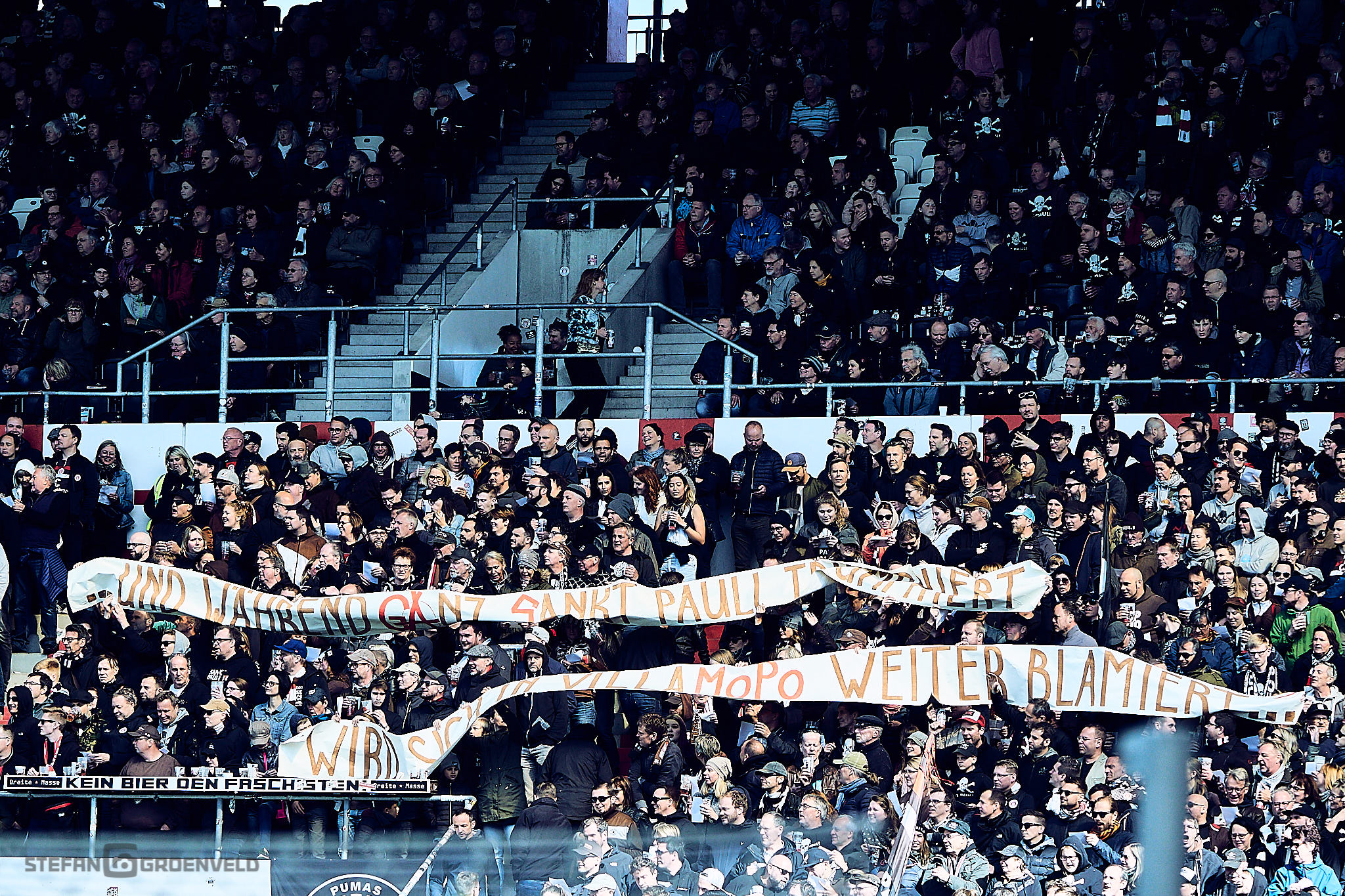 Falls du den Hintergrund zum Transpi mit dem Hinweis zur Mopo noch nicht kennst, hier die Erklärung. Du kennst noch den Mopo Artikel nach dem Derby, als ein Vater seinen Sohn für Traumatisiert wegen der vielen Pyrotechnik erklärte? Ist nicht schlimm: jener Vater, der damals mit Sohn in St. Pauli Klamotten abgebildet wurde, erschien nun wieder mit Foto in der Mopo. Diesmal allerdings als Anhänger des Vorstadtvereins mit selbstgemalten Schilder gegen den dortigen Trainer. Mir tut da nur der Junge leid. Man kann sich seine Eltern leider nicht aussuchen…