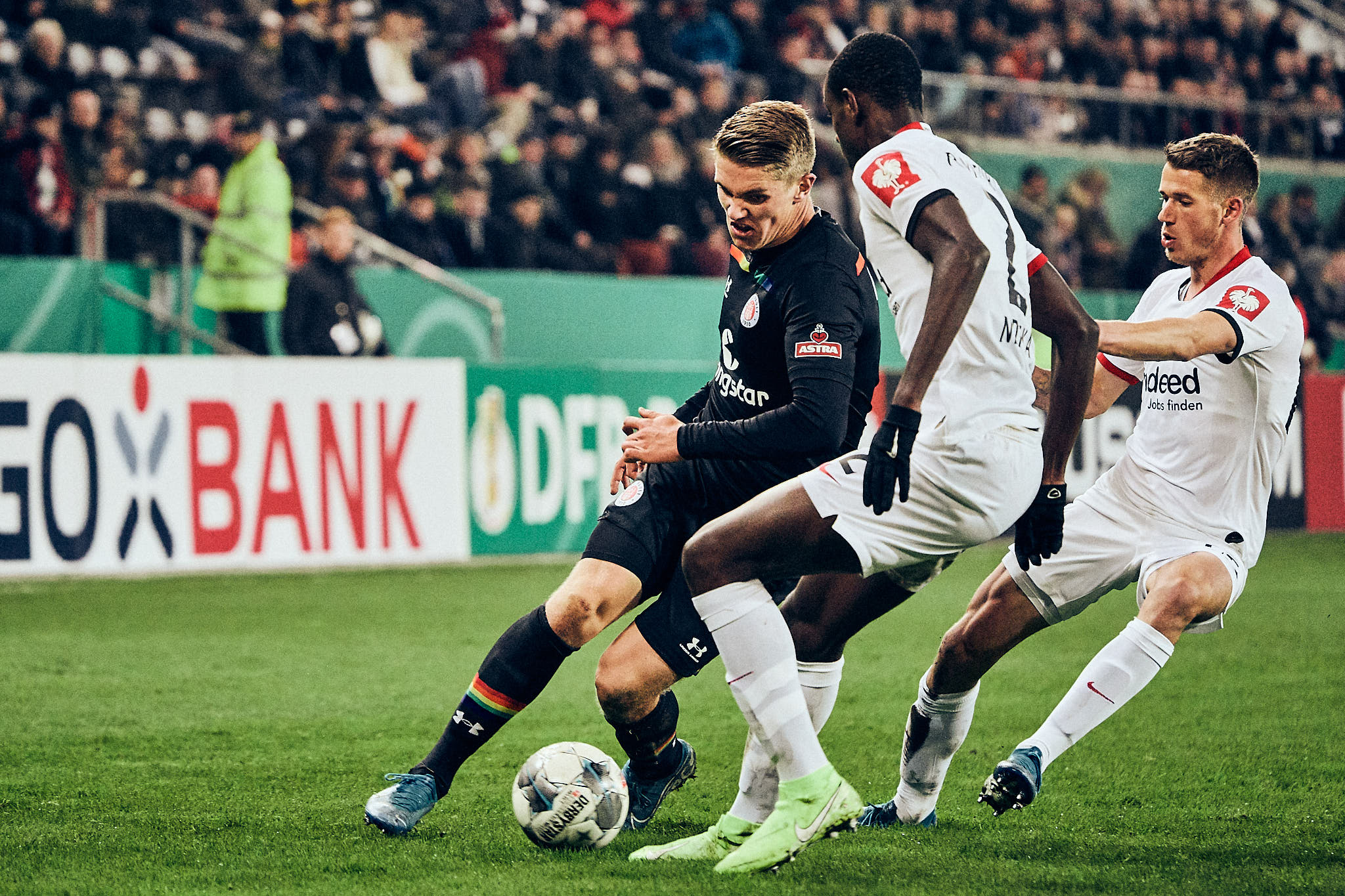 Auf dem Spielfeld war sehr schnell klar, dass die Eintracht nicht nur immer einen Kopf größer war, sondern eben auch mehr Cleverness auf den Platz brachte. Sehr häufig wurde der braun-weiße Spieler kurz vor der Ballannahme regelkonform irritiert oder aus dem Gleichgewicht gebracht. Selbst Fouls ließen den Schiedsrichter mit dem Eindruck zurück, dass sie vom Gegenspieler begangen wurden. Bevor der FC St. Pauli im Spiel war, stand es nach zwei Ballberührungen von Bas Dost schon 2:0 für Eintracht Frankfurt.