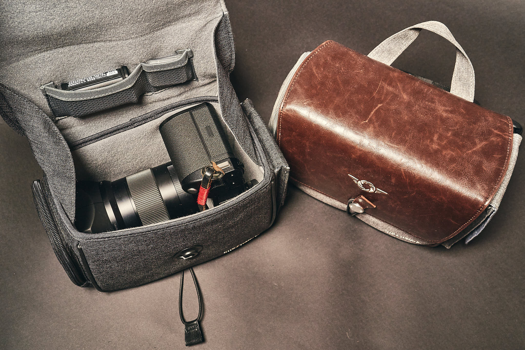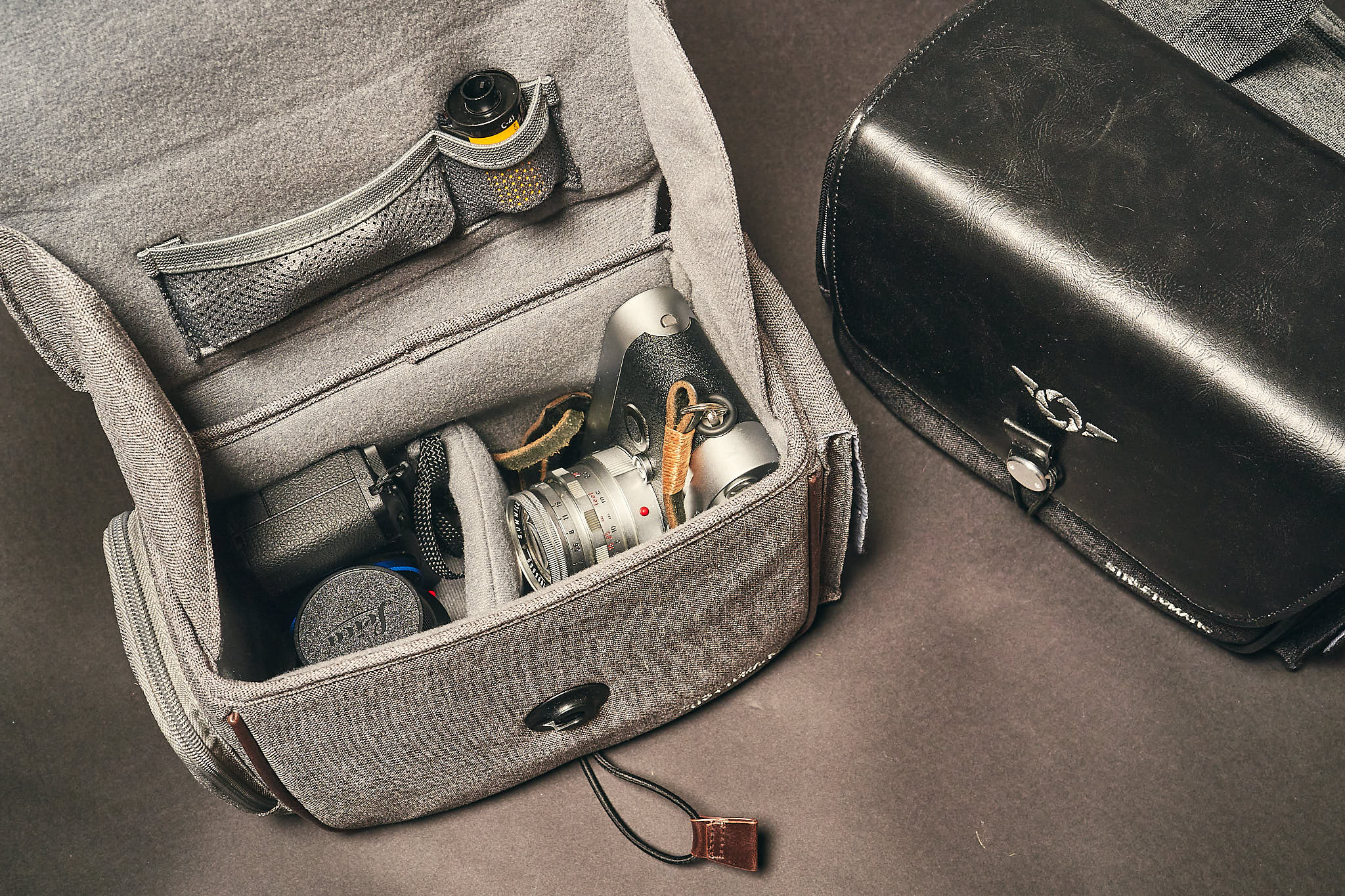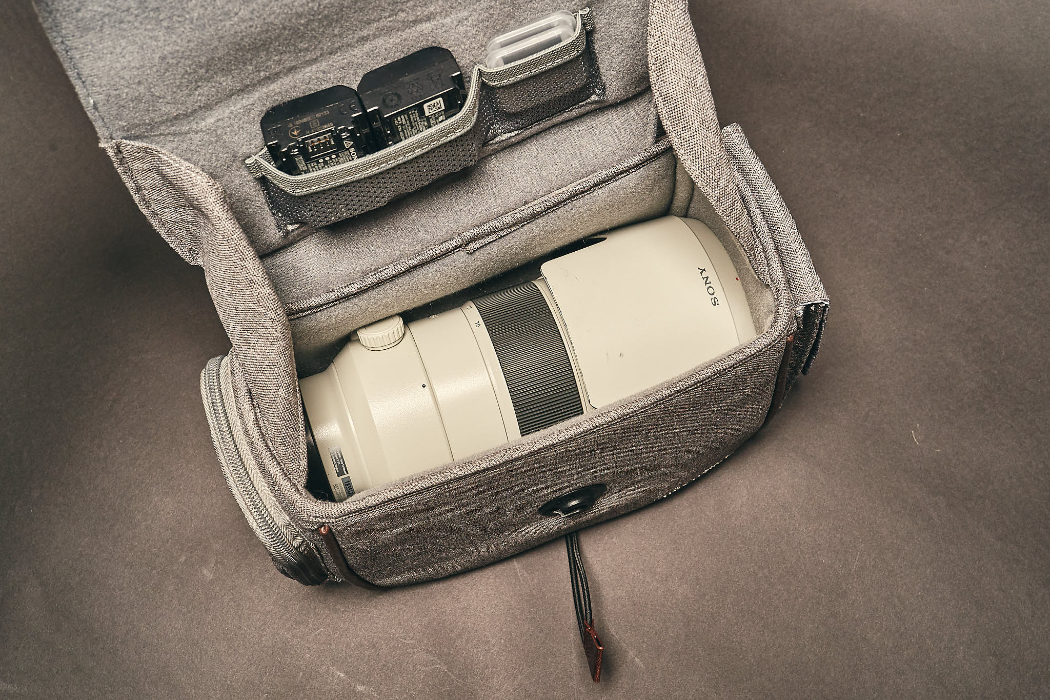 Innen hat die Streetomatic+ Platz für eine Systemkamera mit Objektiv. Je nach verwendetem System passt oft auch noch ein Wechselobjektiv mit rein. Flexibel einsetzbare Trenner werden mitgeliefert. Dazu passt in das Netz des Deckels noch ein zweiter Akku oder eine Filmdose rein. Weiterhin gibt es noch zwei Taschen aussen: eine zum Beispiel fürs Smartphone und eine für’s Portemonnaie.