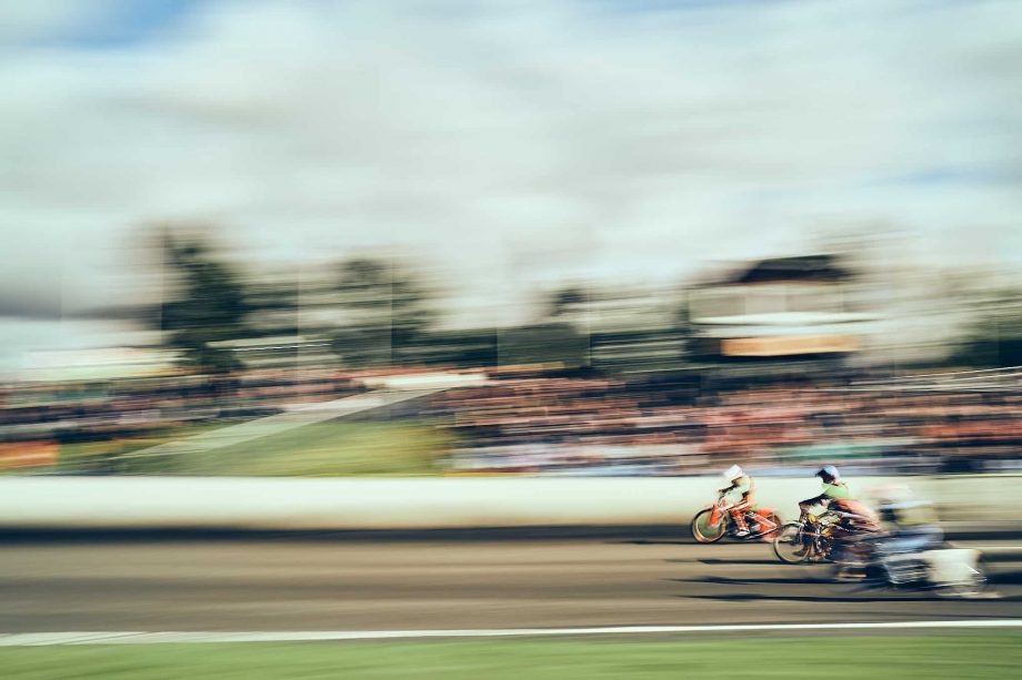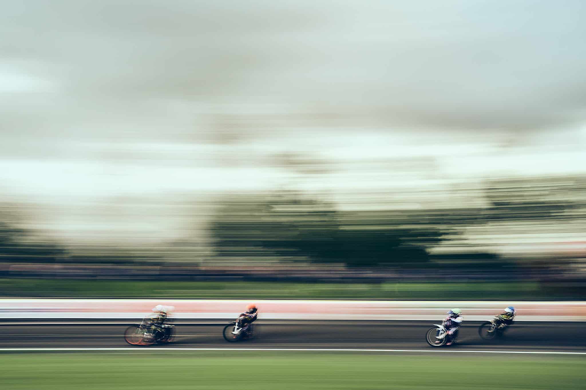 Im Gegensatz zum letzten Mal wusste ich ja vorher, was mich erwarten würde. Ich hatte mir daher zwei Motive im Kopf zurechtgelegt, die ich versuchen wollte umzusetzen. Mir war die Dynamik des Sports wichtiger als bestimmte Personen abzubilden. Für letzteres waren genug andere Fotografen da. Also schnappte ich mir einen 1,8fach Graufilter und fotografierte bei guten Licht schnellen Sport mit Belichtungszeiten rund um die 1/3 Sekunde. Für das andere Motiv wollte ich mit einem Weitwinkel nah ran an die Bahn. Um weder mich noch die Fahrer zur gefährden, habe ich meine Kamera auf ein kleines Stativ gestellt und mit meinem Smartphone fernausgelöst. Tatsächlich war letzteres schwieriger als ersteres. Andererseits bin ich froh, dass beides funktioniert hat und ich sogar noch ein drittes schönes Motiv auf den Chip bannen konnte.