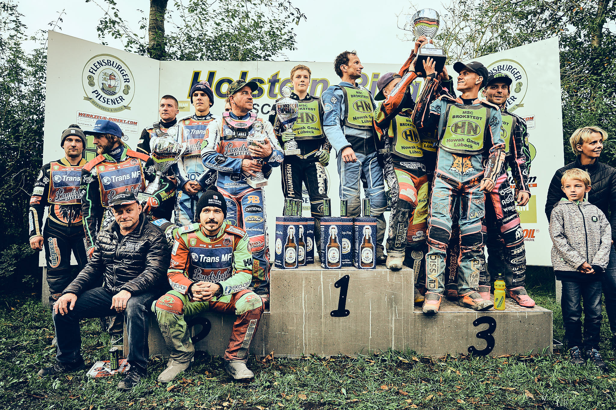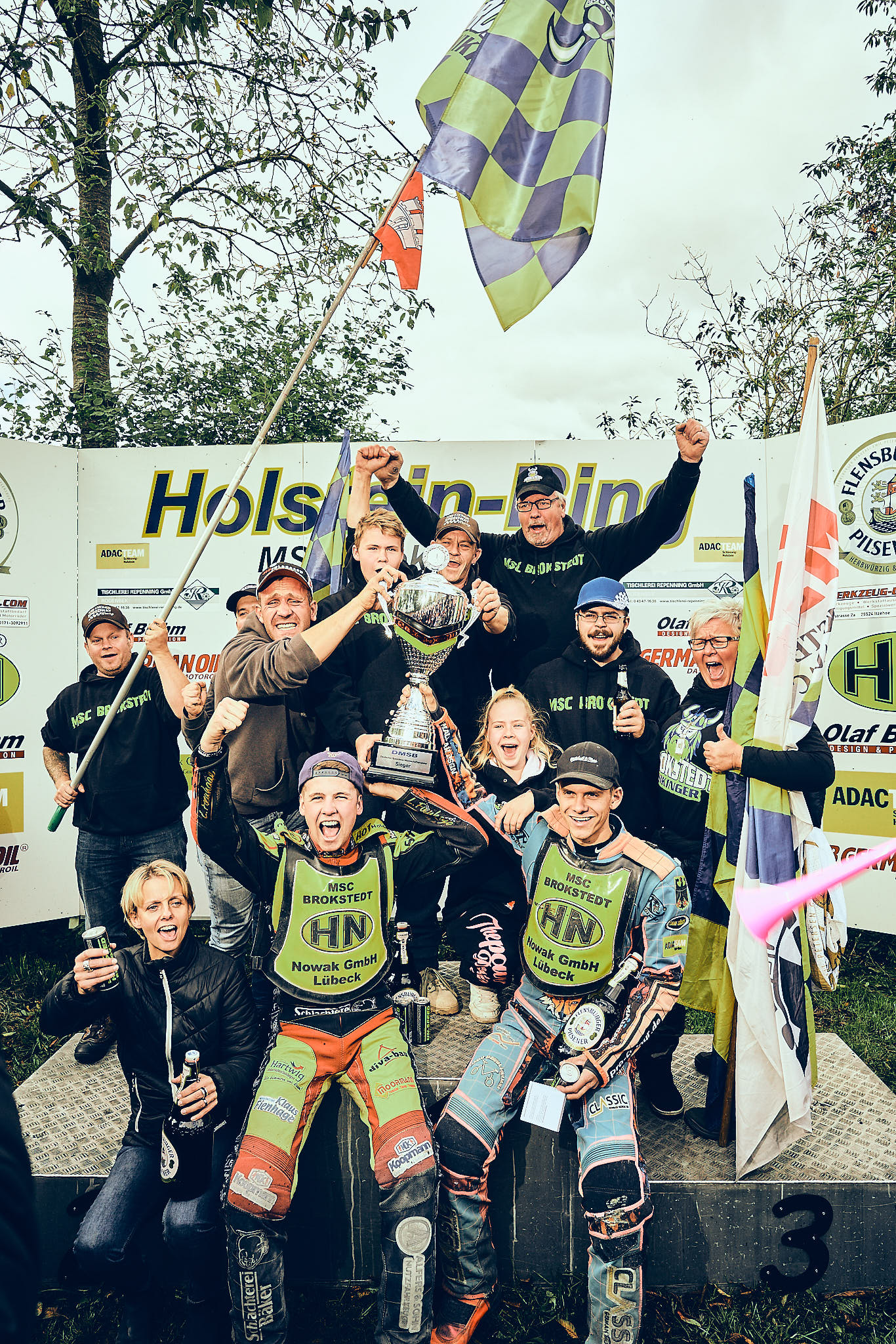 Zurück zum Grund meiner Anwesenheit auf dem Holsteinring, der deutschen Meisterschaft. Vom Start weg fuhr der Kontrahent aus dem Süden einen Vier-Punkte-Vorsprung heraus. Erst beim 9. der 14 Heats gelang der Ausgleich. Danach hatte der MSC Brokstedt die Reifen vorne. Schon vor dem letzten Heat stand der Gewinn der Meisterschaft fest. Die rund 1500 Zuschauer im Rund feierten die Wikinger gebührend. Mit 45:39 wird der MSC Brokstedt nach 2014 wieder deutscher Meister.