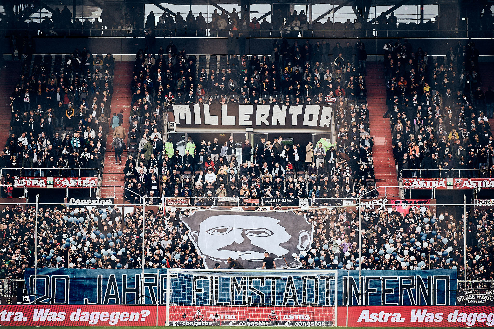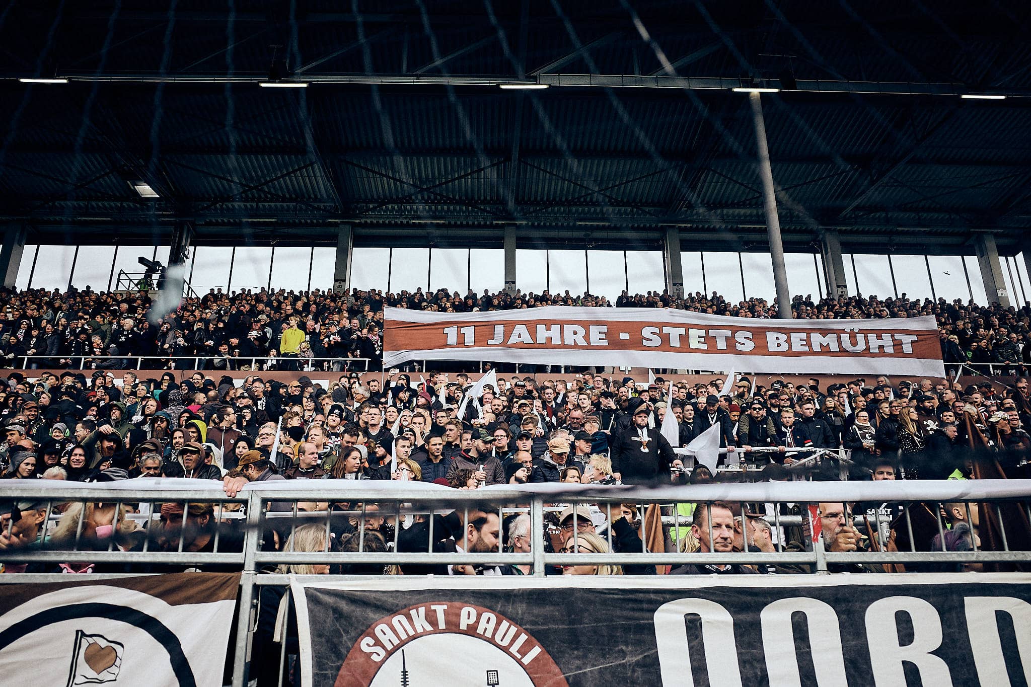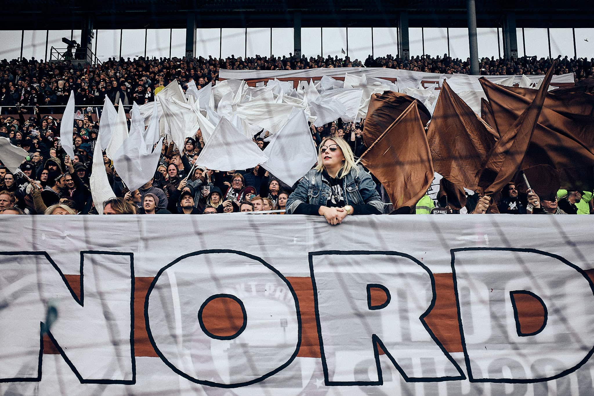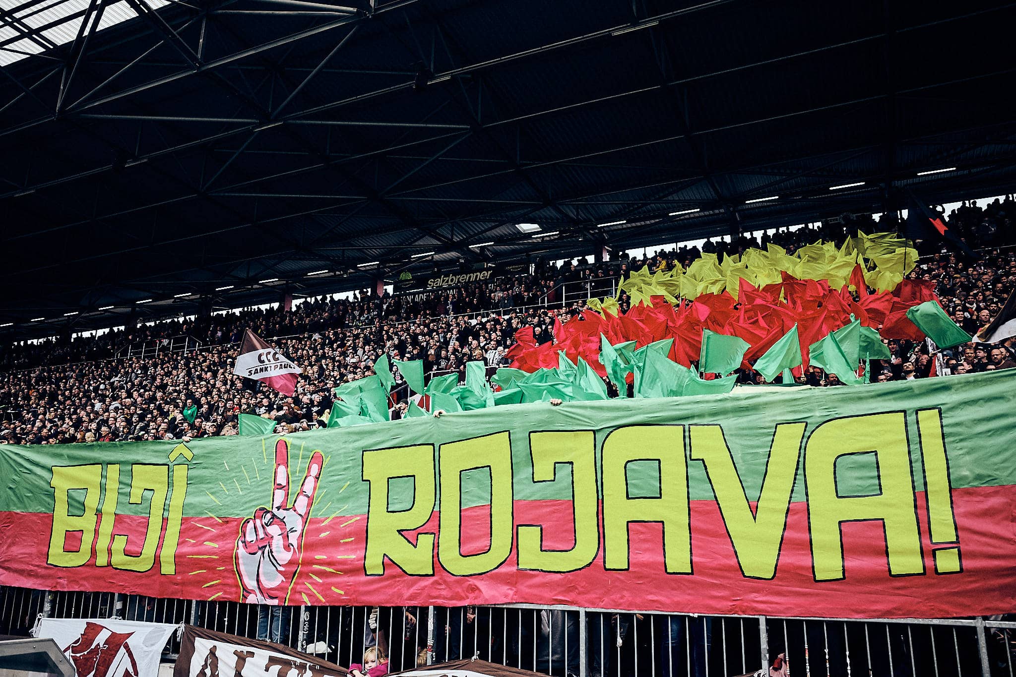 Ansonsten: schöne Choreo auf der Nord zum 11-jährigen Bestehen des Nordsupports, 20 Jahre Babelsberg lässt blau-weiß-schwarze Farben auf der Süd erscheinen, Niveaulosigkeit auf der Haupt, Schiedsrichter mit Schnürproblemen und Sankt Pauli Spieler mit Trikotproblemen. Aber toller Unterstützung für die zum Spielball der Kriegstreiber der Welt gewordenen Kurden – ich hätte bei den Choreos im Stadion gerne Cenk Sahins Gesicht fotografiert. Und das alles nun in Bildern.