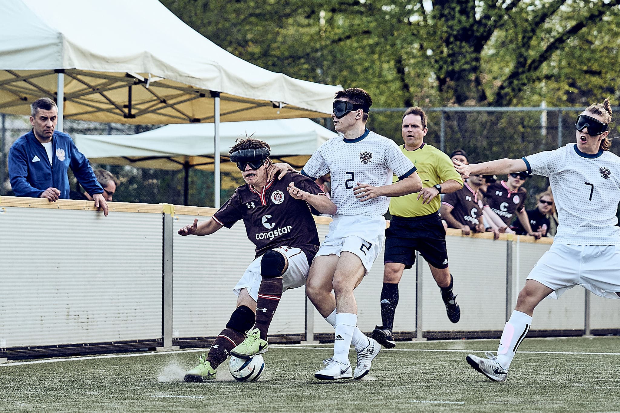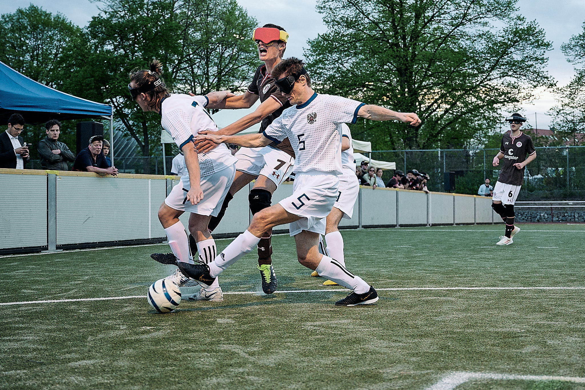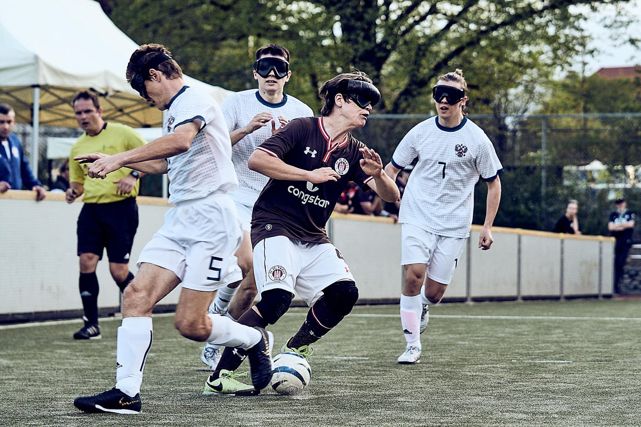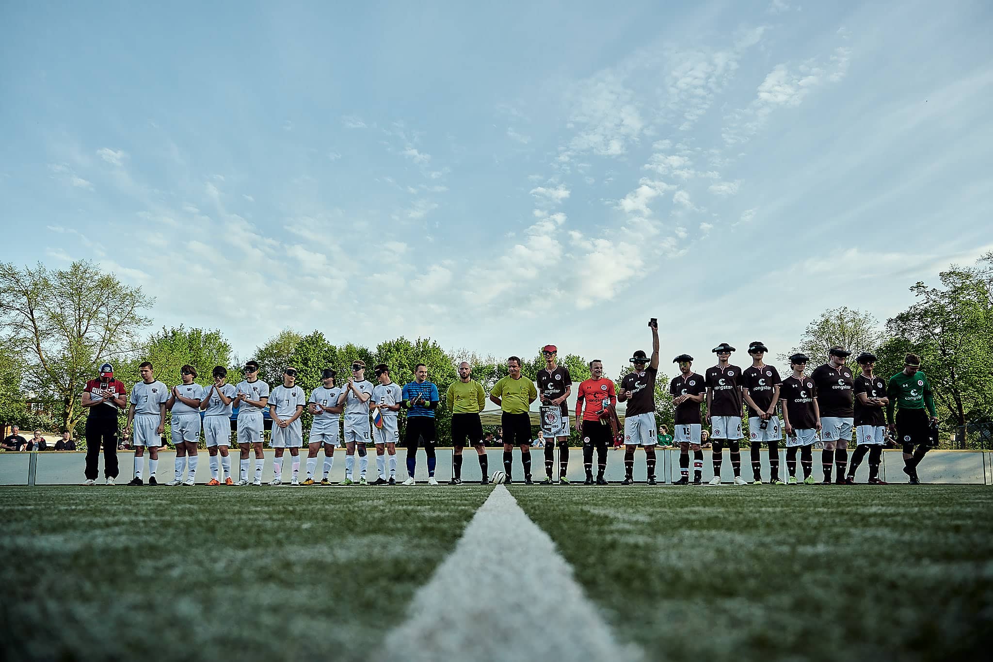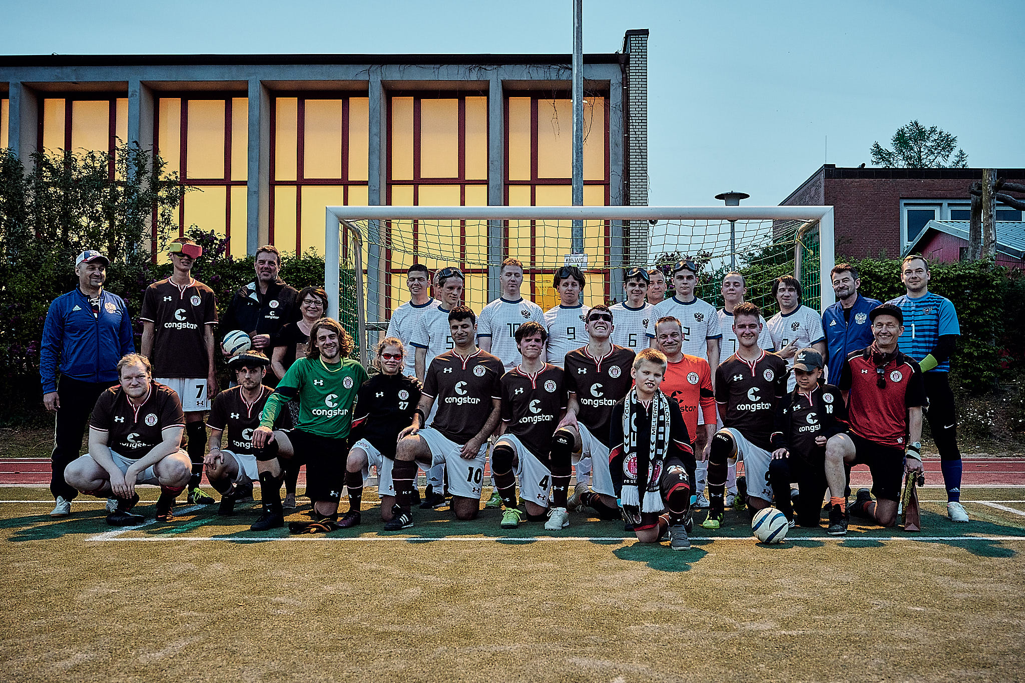 Gestern Abend um 19:10 Uhr traf der amtierende deutsche Vizemeister gegen den aktuellen Europameister zum Freundschafts- und Vorbereitungsspiel zur neuen Bundesliga-Saison bzw. zur Europameisterschaft. FC St. Pauli spielt also gegen die russische Nationalmannschaft. Glücklicherweise fanden das auch viele Zuschauerinnen interessant und kamen vorbei. Was sie zu sehen bekamen, war ein packendes Freundschaftsspiel und eine echte Werbung für den Blindenfussball. Zurecht gab es oft Szenenapplaus, was beweist, dass viele das erste Mal da waren.