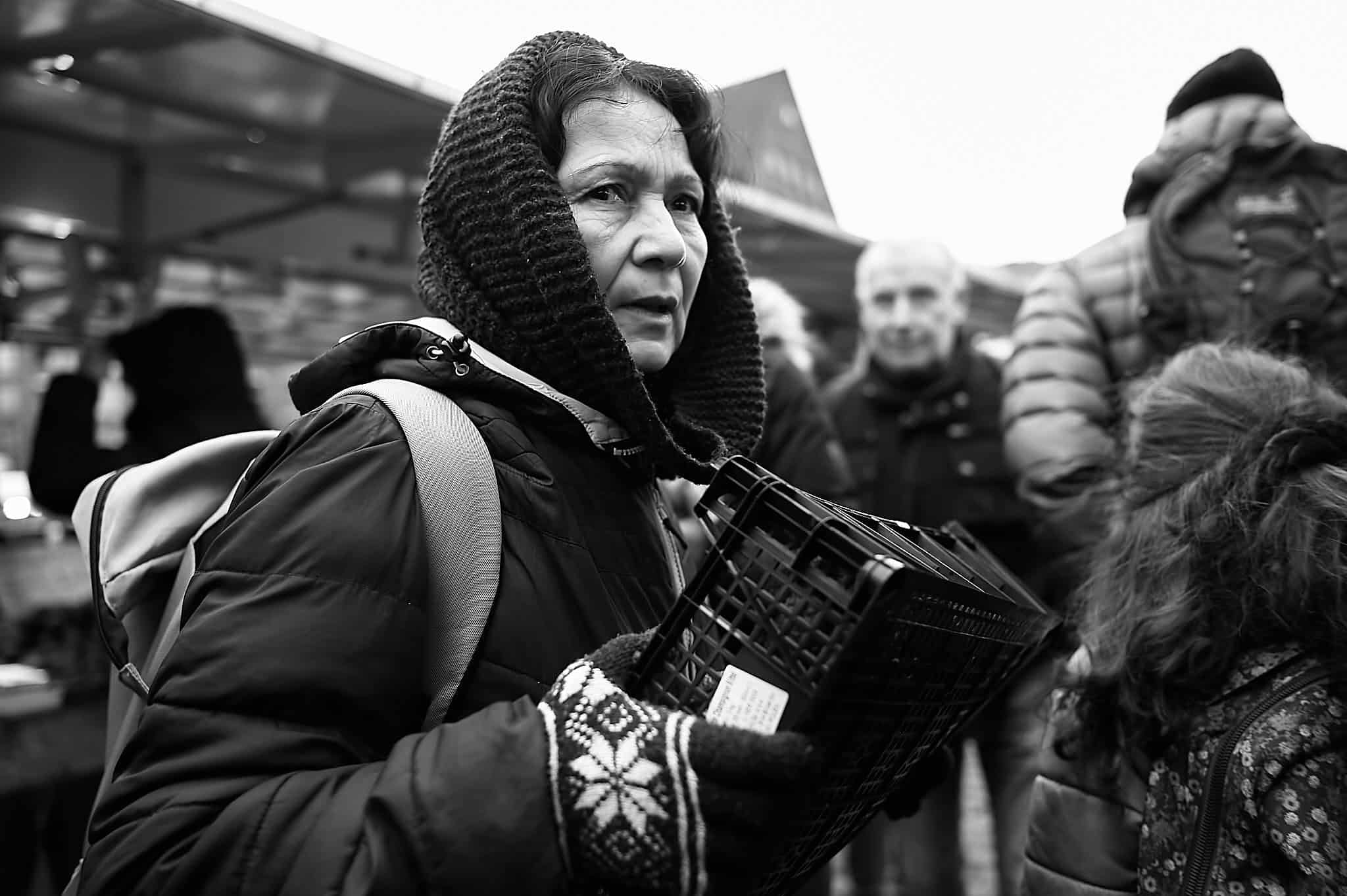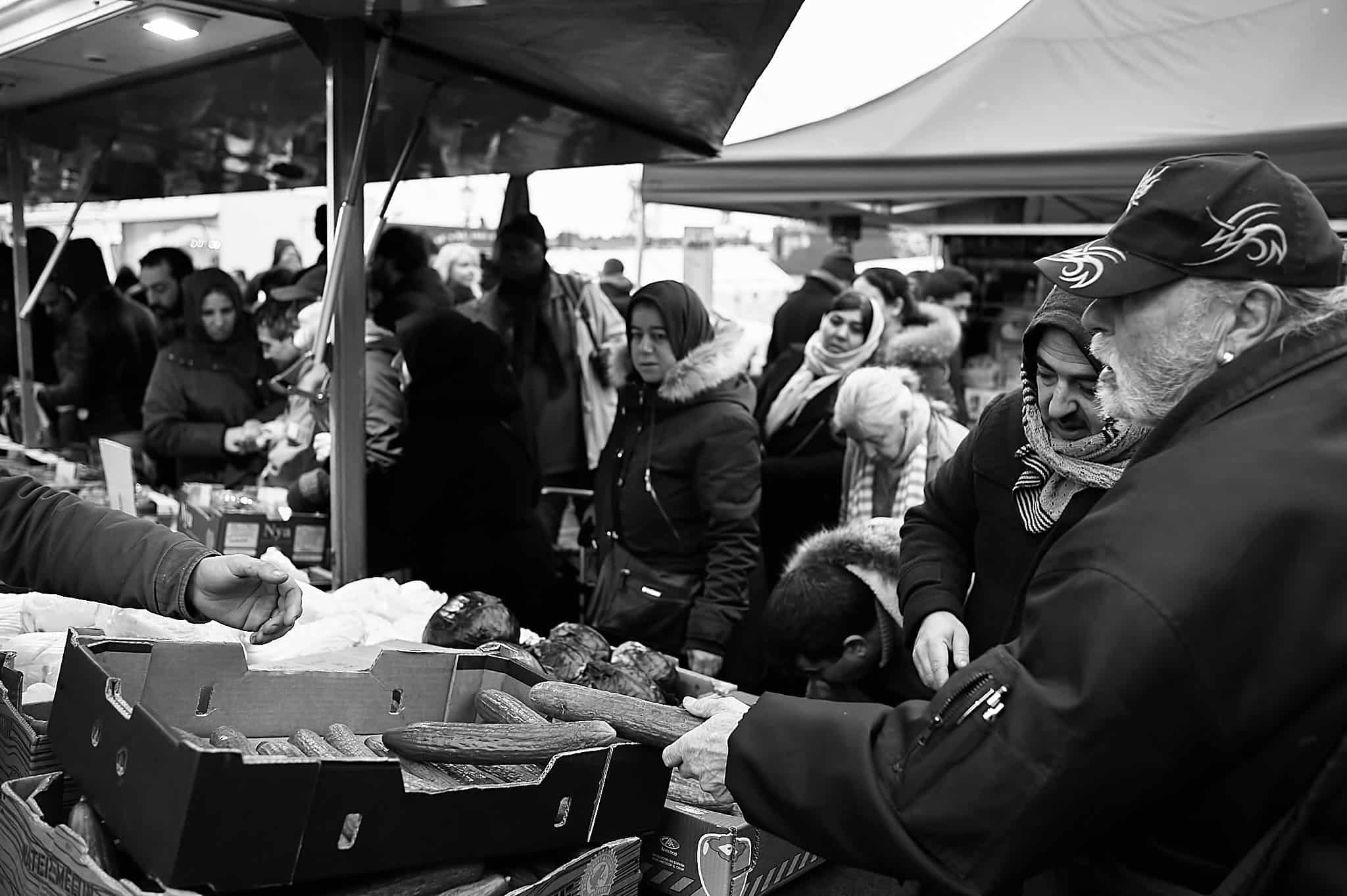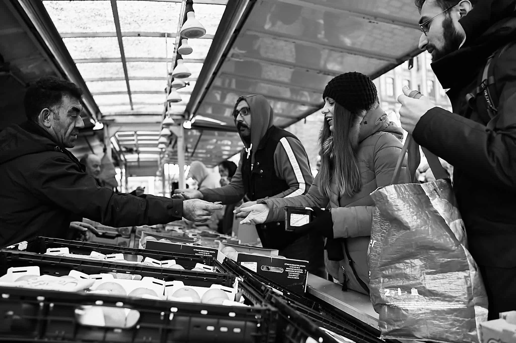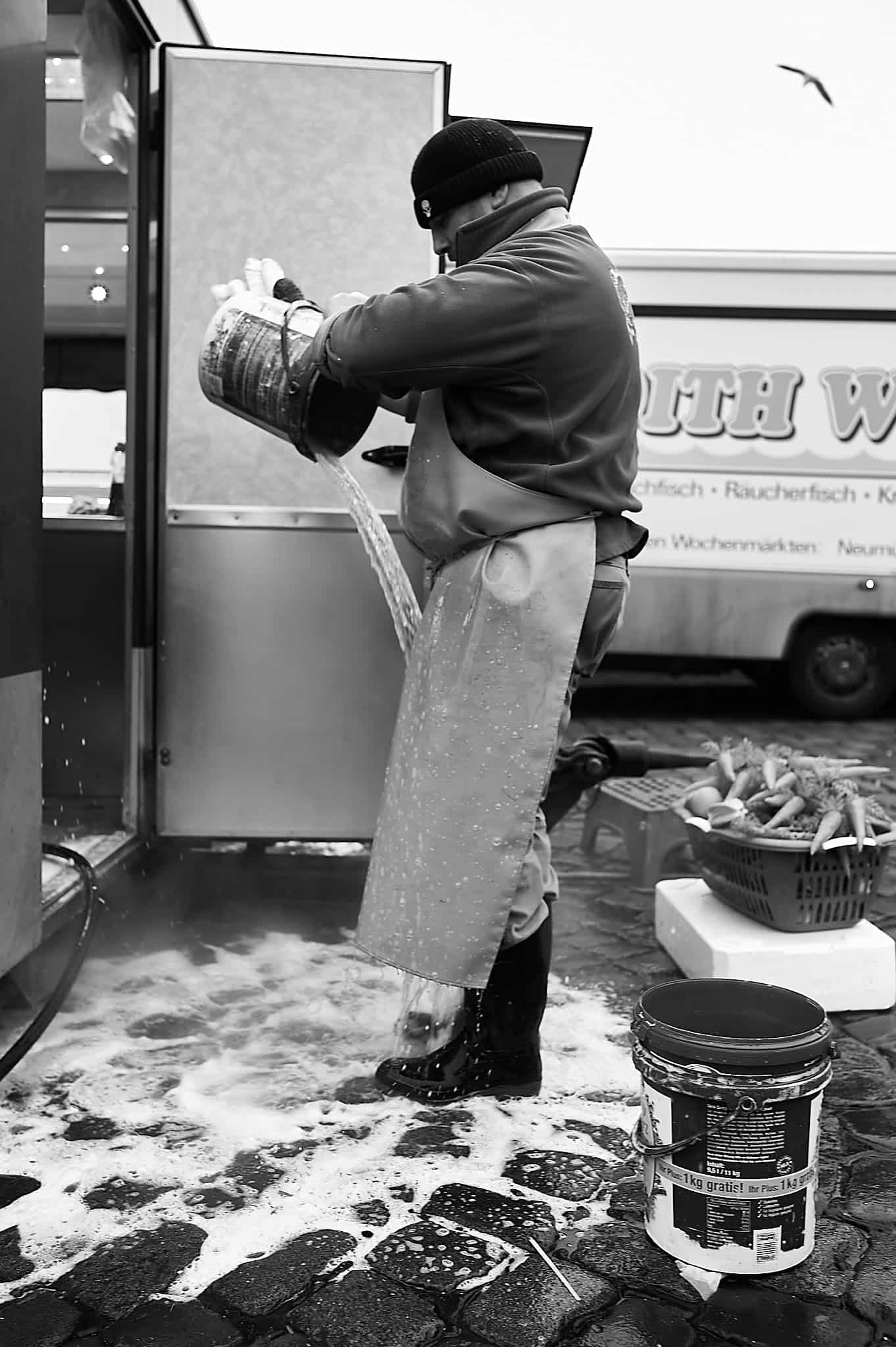 Meine neue alte Leica Monochrom habe ich schnell ins Herz geschlossen. Bei meiner Stunde auf dem Fischmarkt fühlte ich mich dann bei ihr auch angekommen. Zusammen mit dem 28er stürzte ich mich in das enge Gewühl. Und allmählich habe ich auch einen Weg gefunden, die 10000 Grautöne der Kamera zu zähmen. In solchen Situationen ist eine manuelle Messsucherkamera für mich die beste Möglichkeit, konzentriert die Fotos nach Hause zu bringen. Blende, Belichtungszeit, Entfernung einstellen und los legen.