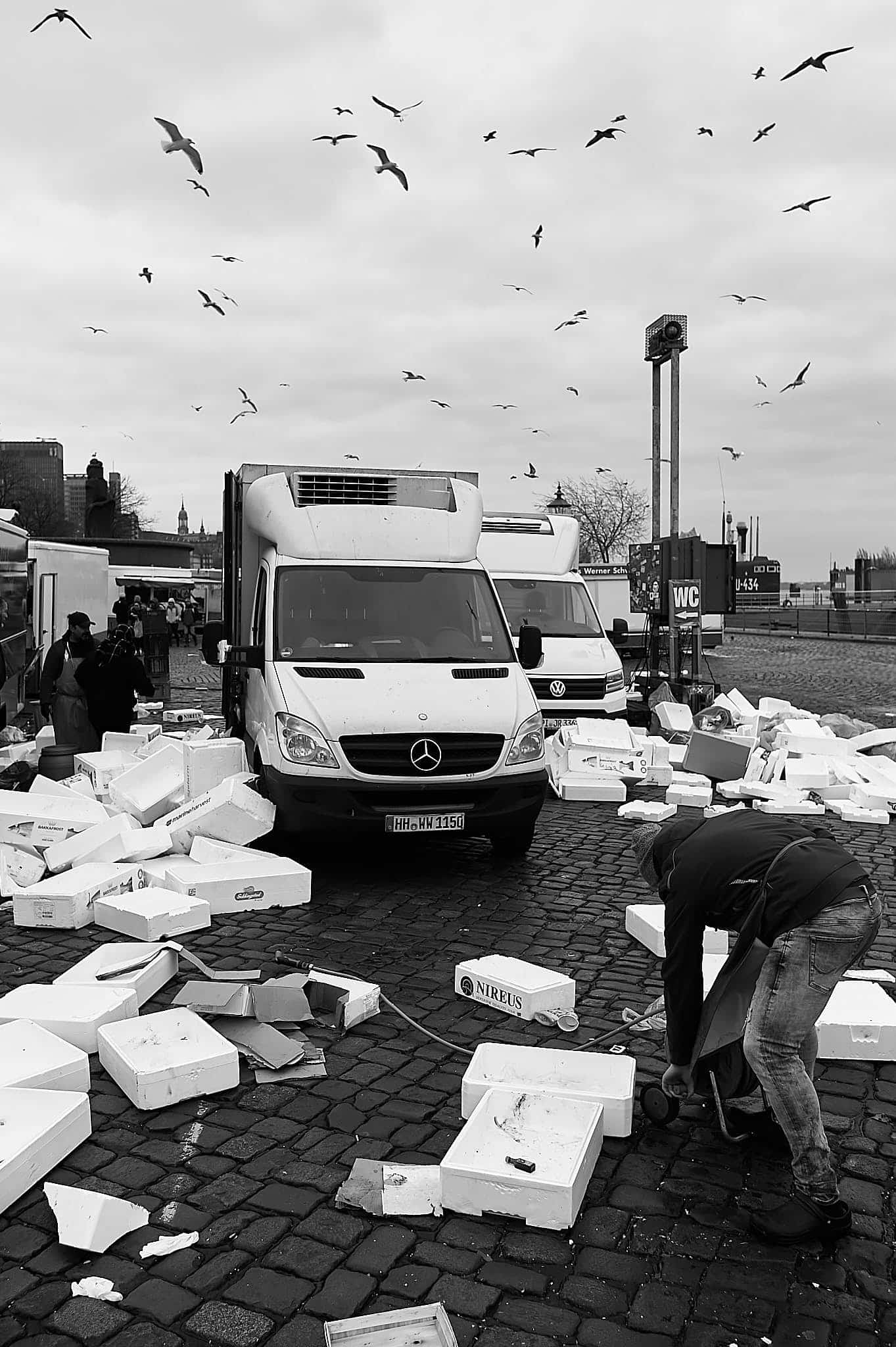 Fischmarkt und Regen – ein typischer Sonntag in Hamburg. Zumindest stellen sich Touristen Hamburg so vor. Und tatsächlich war es heute auch so. Die Wettervorhersage hatte den Beginn des Regens zwischen 11 und 12 vorhergesagt. Genug Zeit die Reste des Fischmarkts zu erleben. Also traf ich mich kurz vor 10 mit Bjørn beim Marktleiter und pünktlich mit dem einsetzenden Regen kehrten wir dem Treiben vor den Fischauktionshallen den Rücken.