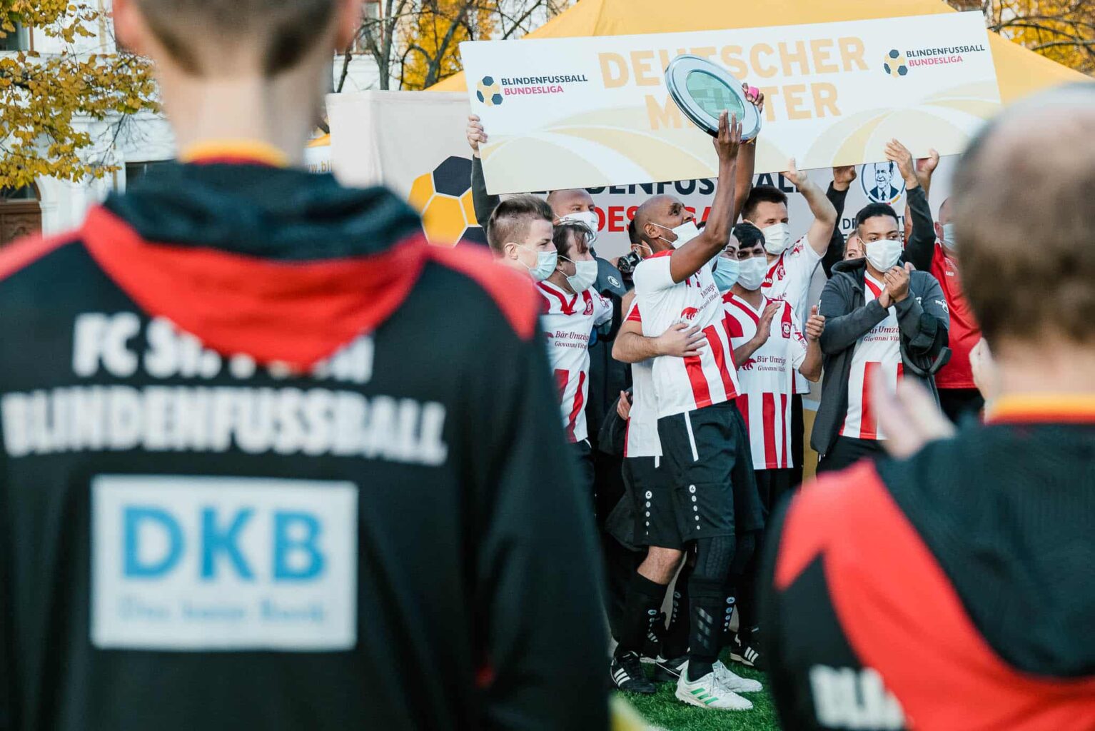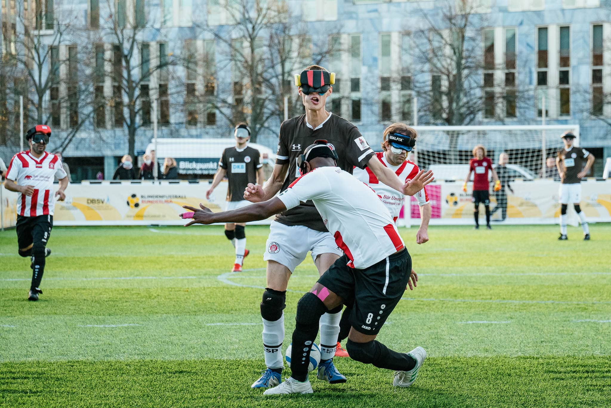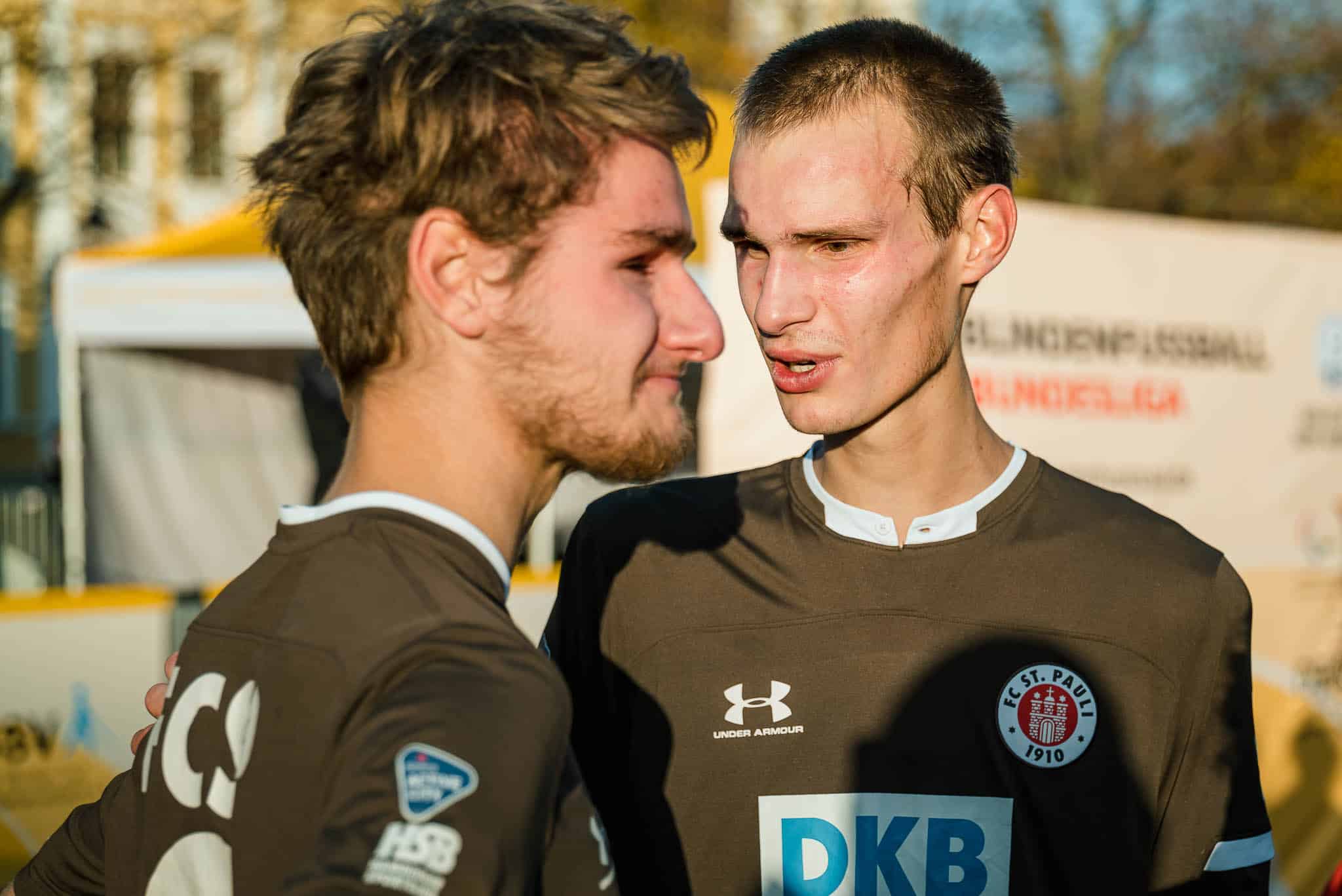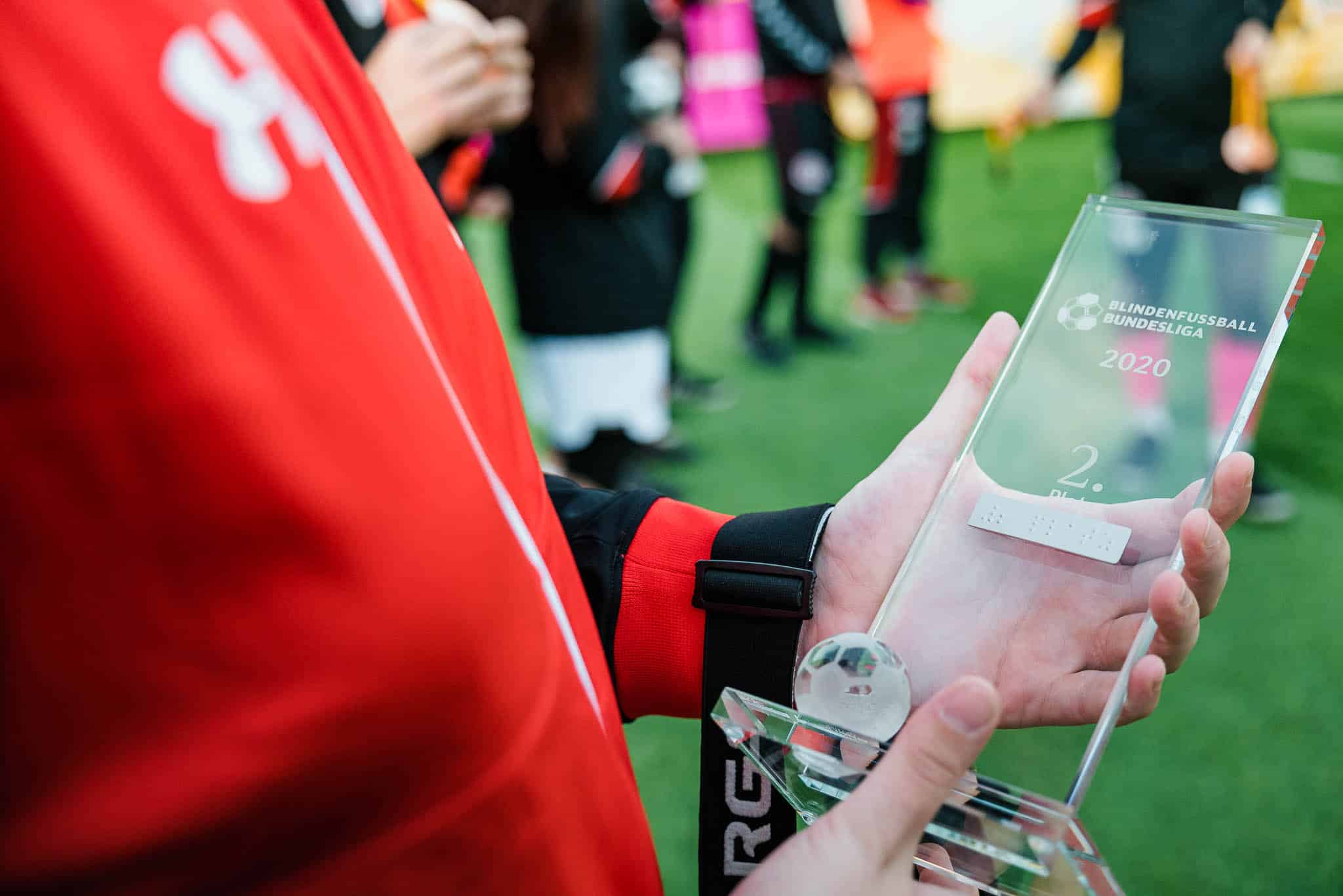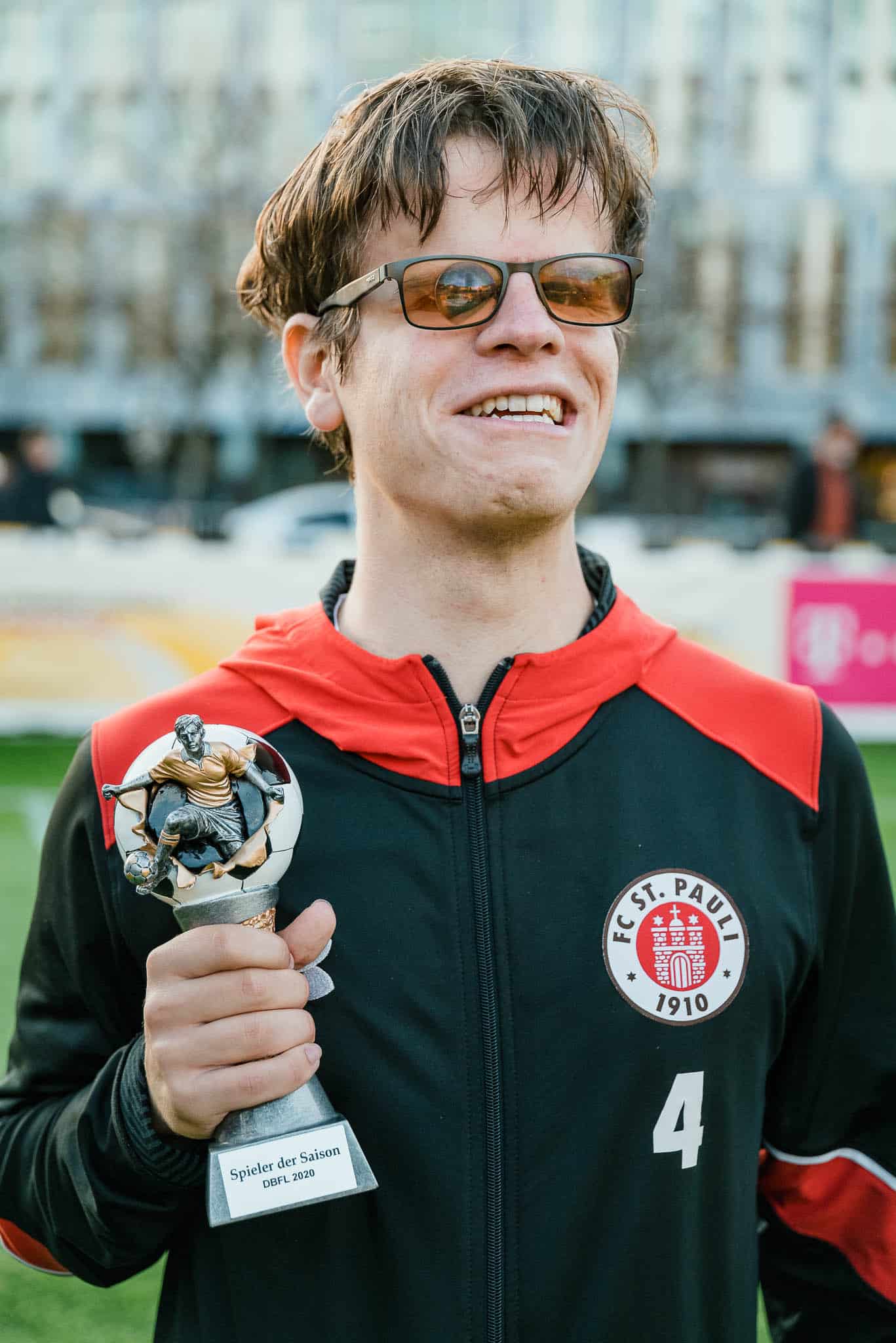 Die informierte Leserin wird sich wundern, dass der Name Jonathan Tönsing noch nicht gefallen ist. Der etatmäßige Stürmer vom Blindenfussball FC St. Pauli wurde nach dem Spiel als bester Spieler der Bundesliga in der Saison 2020 ausgezeichnet. Am Finale konnte er krankheitsbedingt nicht teilnehmen.