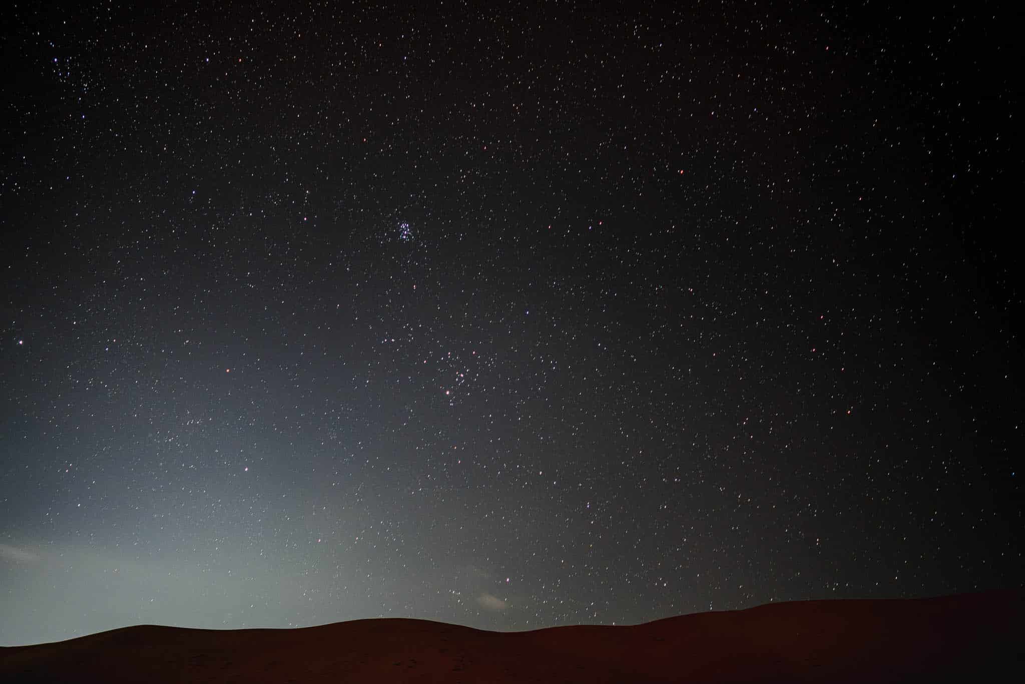 Der Abend wird abgerundet durch leckeres und vielseitiges Essen an großen Tafeln. So lernen wir nette Omani aus London kennen, die auch das erste Mal in Wahiba Sands sind. Später genießen wir den traumhaften Sternenhimmel. Als es einheimische Folklore gibt und Nordeuropäer unrhythmisch zu traditionellen Klängen von traditionell gekleideten Menschen – also so wie zum Beispiel Ärzte, Anwälte oder Architekten – klatschen, gehen wir früh ins Bett. Schnell hatten wir nach dem enttäuschenden Abend den Entschluss gefasst, früh am Morgen einen erneuten Versuch für ein tolles Dünenerlebnis zu starten. Da der Sonnenaufgang für 6 Uhr im Kalender steht, hoffen wir auf wenig Menschen.
