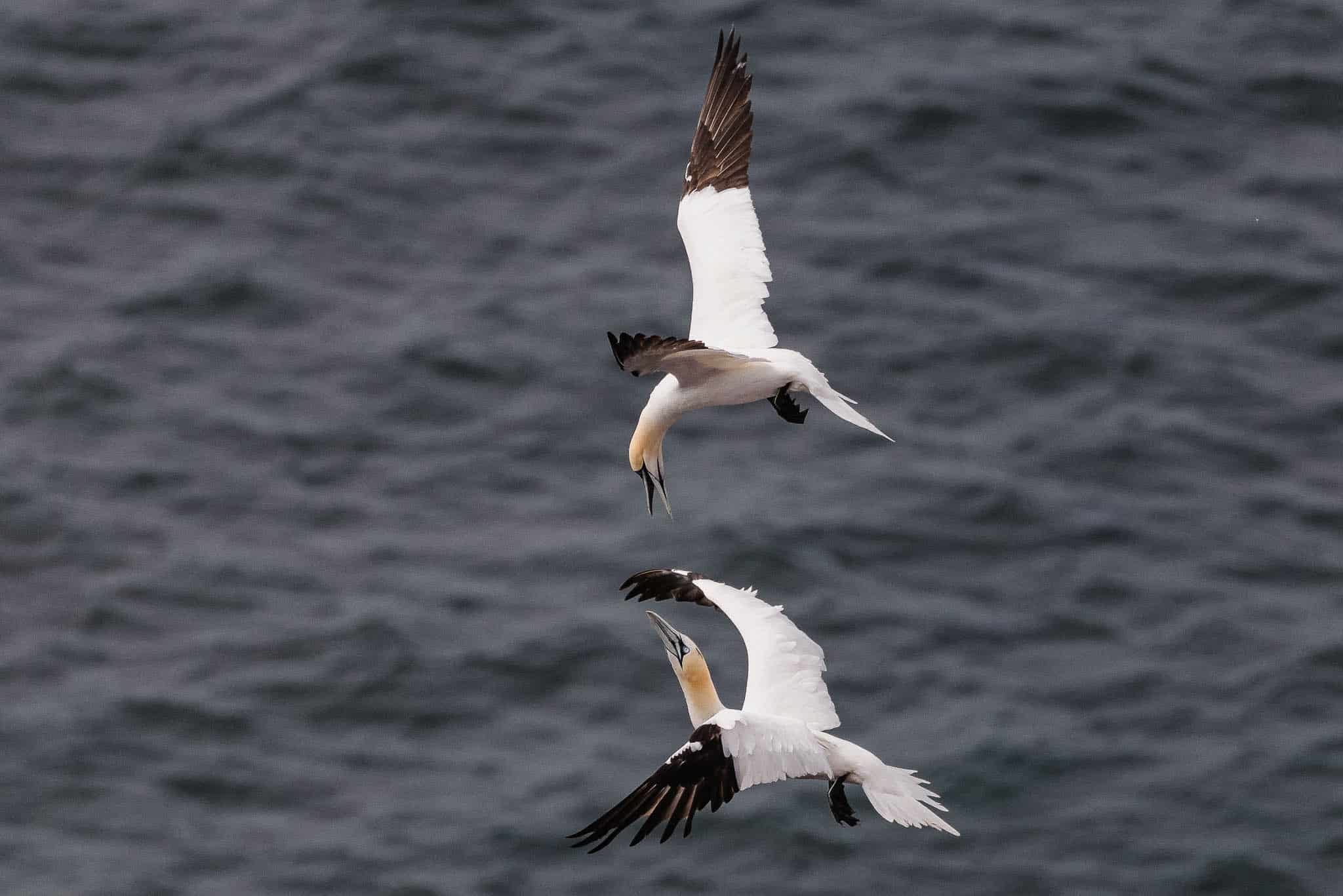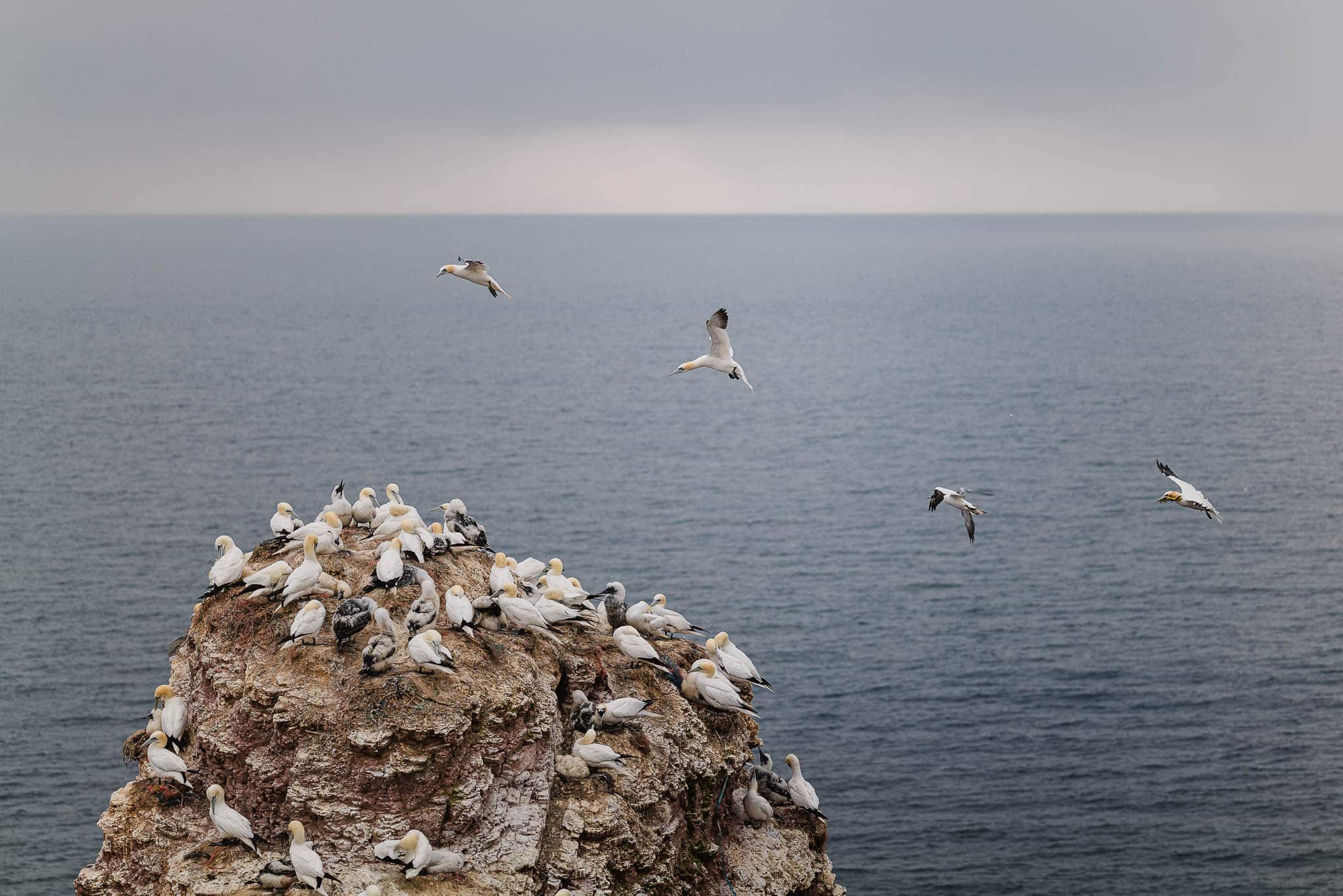 Vor allem beim zweiten Besuch im Juli war das auffällig. Das Wetter war besser als auf dem Festland, denn geregnet hat es fast nur nachts. Dafür kam im Laufe des Aufenthalts immer mehr Wind auf. Gerade am Lummenfelsen und der langen Anna ist ordentlich Wind ein Erlebnis. Während du selbst kaum festen Halt an den Klippen findest und die Möwen bei Böen gerne abgetrieben werden, stehen die Basstölpel ruhig in der Luft. Ein faszinierendes Spektakel, dass wir uns immer wieder gerne ansehen.