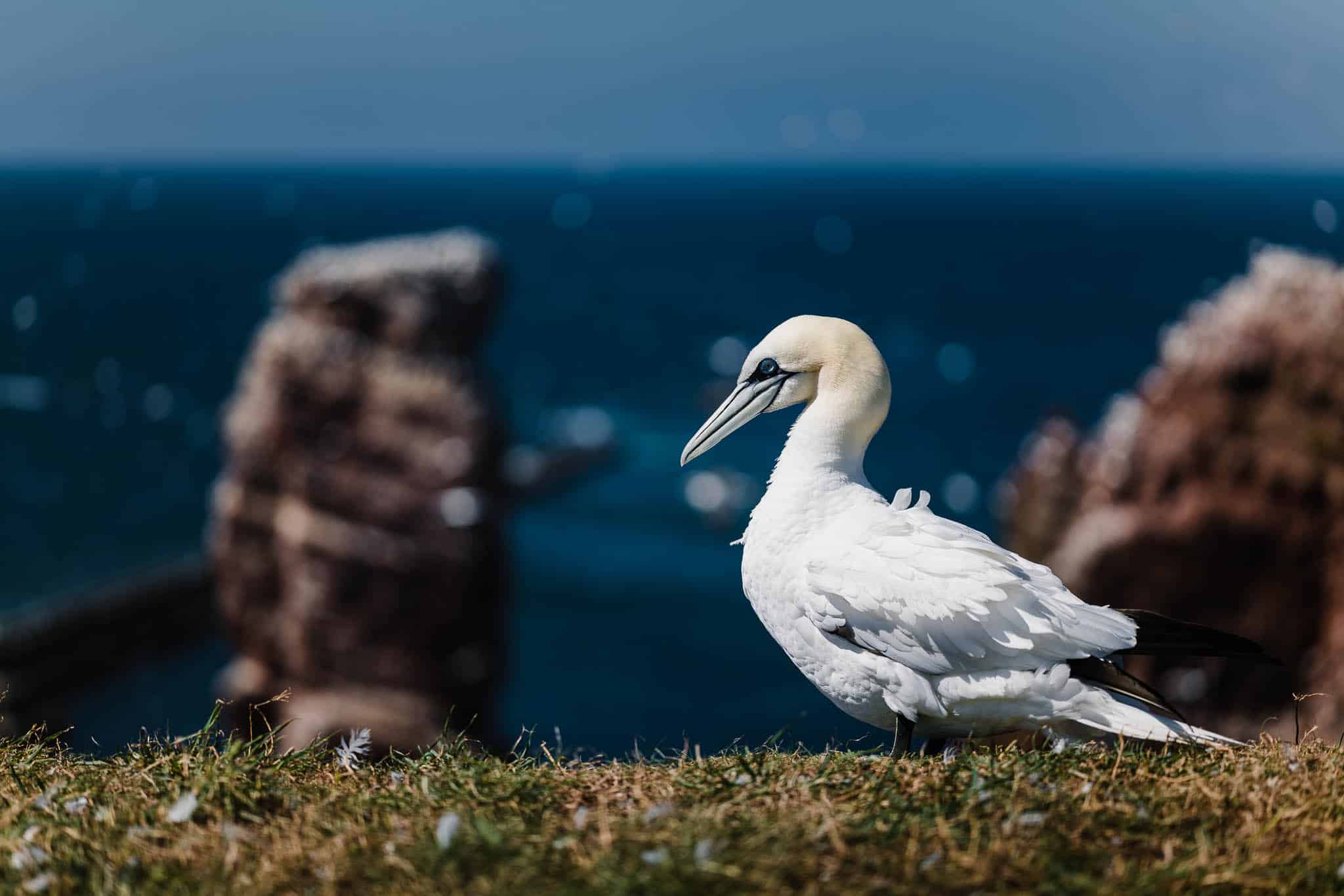 Denn dann kommen die Ornithologen und erfreuen sich am Bruterfolg der größten Basstölpel Kolonie Deutschlands. Oder an den Heerscharen von Lummen, die den Felsen den Namen gegeben haben. Und ja, Möwen gibt es da natürlich auch, aber die sind nicht mal halb so groß wie der Basstölpel Nachwuchs…