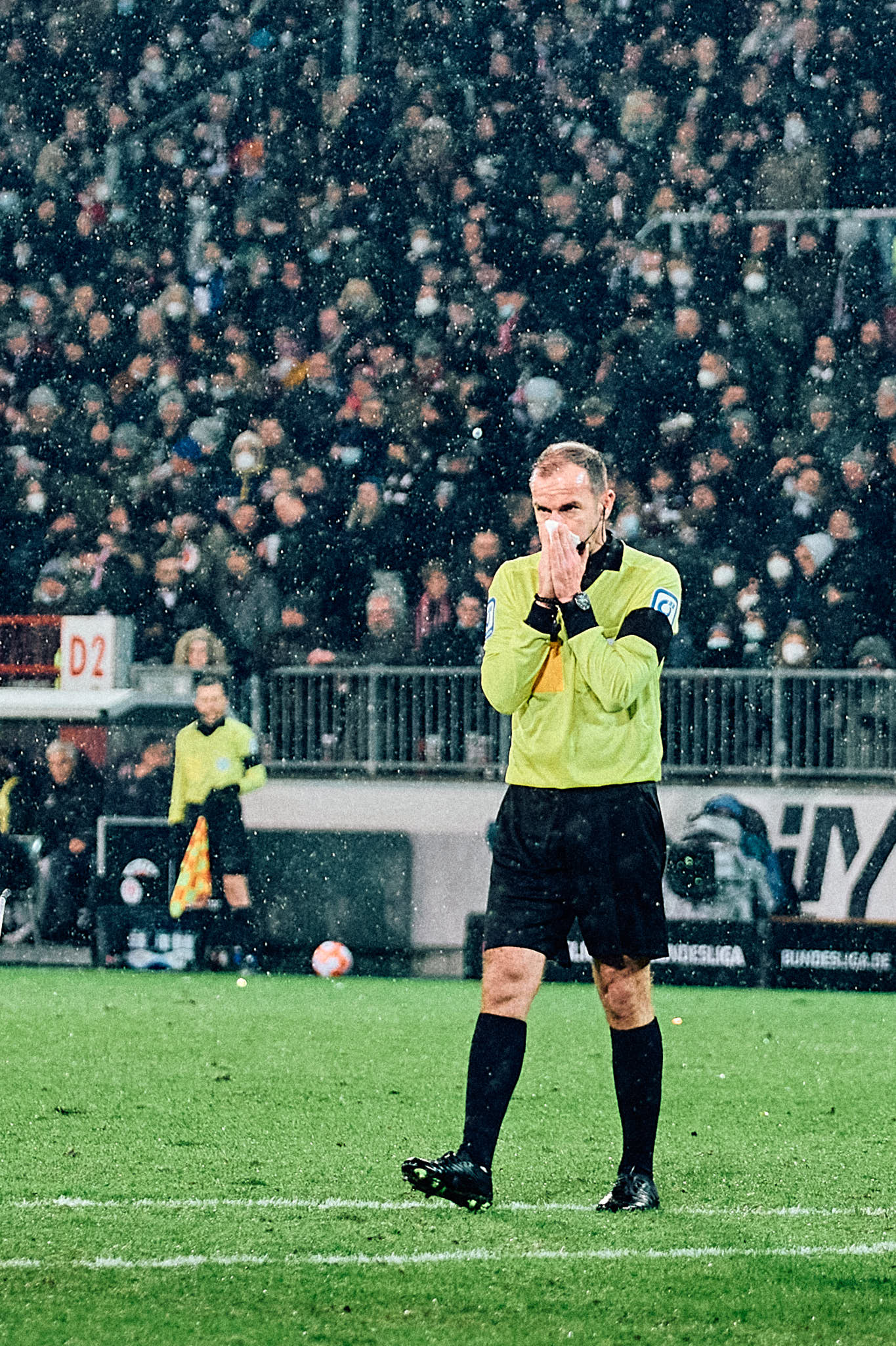 Die Arbeit am Spielfeldrand war gestern übrigens ziemlich hart für einen Brillenträger. Die beschlägt beim Masketragen ja eh gerne schnell, aber bei dem feuchten Wetter erst recht. Und dann gibt es da noch mein Lieblingsproblem beim Fotografieren von Sport im Regen: die Belichtungszeit. Die muss zum Einfrieren der Action recht kurz sein, aber Regen wird auf Fotos eigentlich erst bei einer etwas längeren Verschlußzeit für den Betrachter sichtbar. Beides in einem Bild geht nicht. Es sei denn, dir ist Atmosphäre wichtiger als Action.