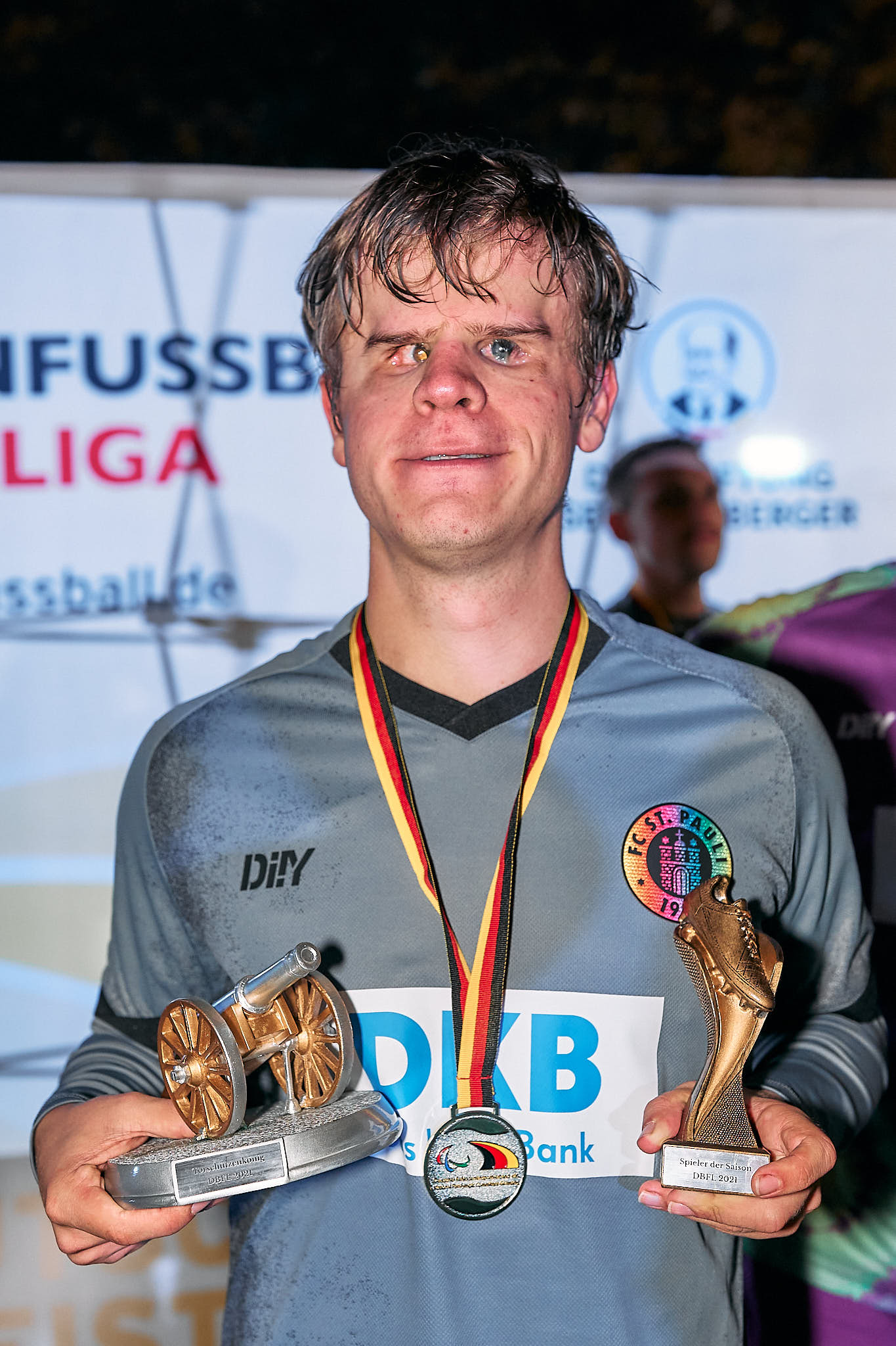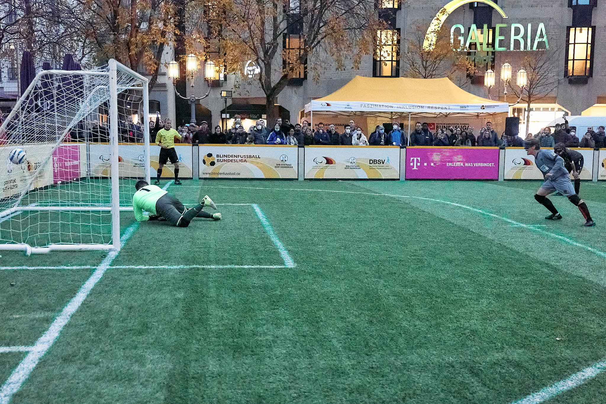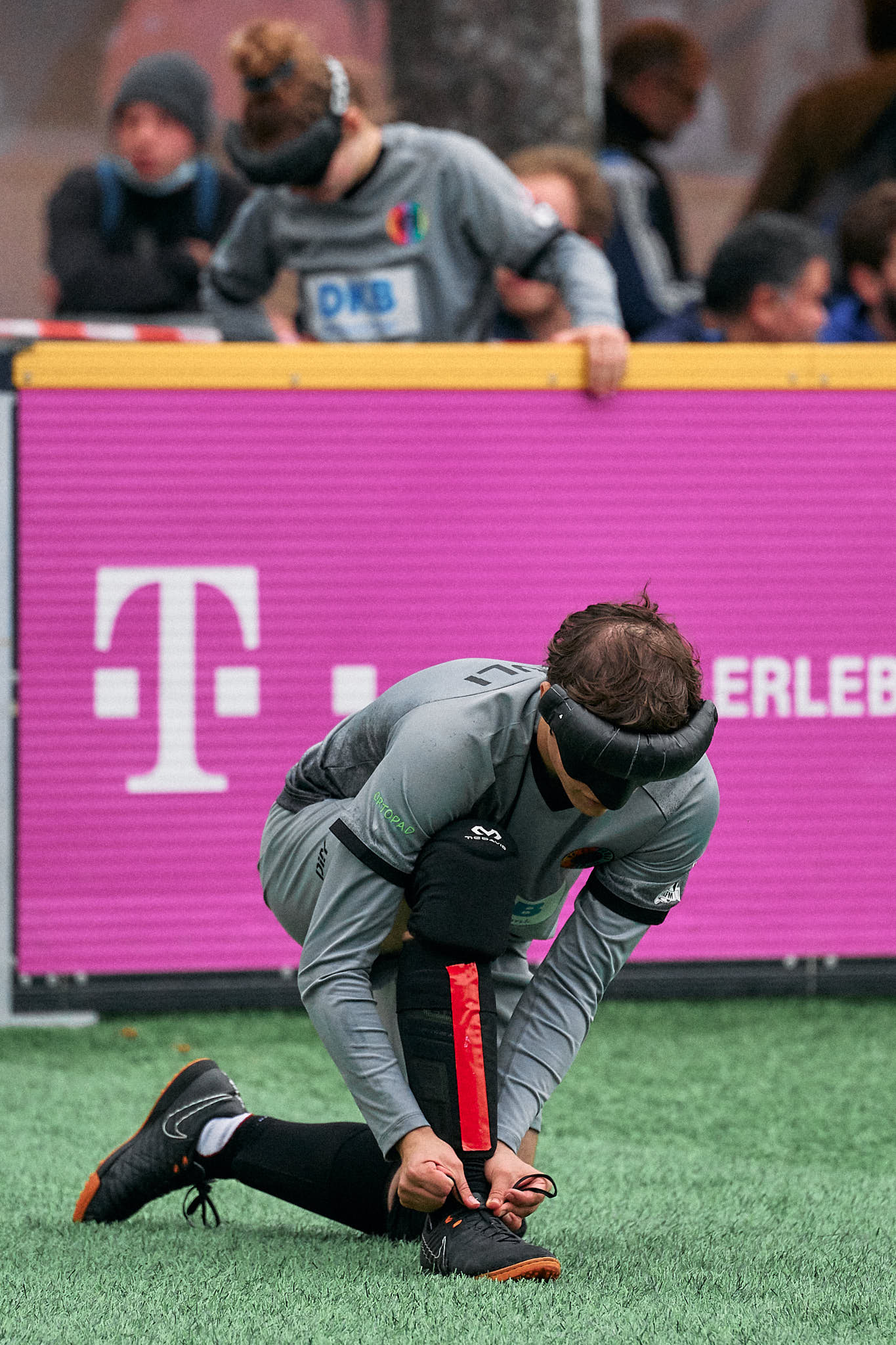 Bevor ich dir hier noch ein paar Bilder zeigt, hier noch ein paar Bemerkungen zum Drumherum. Völlig überraschend wird es zum Winter hin in Deutschland früher dunkel. Wenn ein Spiel dann erst um kurz vor 17 Uhr angepfiffen wird, sollte es also niemanden wundern, wenn Blindenfussball für die Sehenden schwierig zu verfolgen wird. Obige Spielaktion ist zum Beispiel Mitte der zweiten Halbzeit entstanden und ich bin froh, dass es mittlerweile Kameras auf dem Markt gibt, bei denen ISO 12500 trotzdem vorzeigbar sind. Das Strafstossbild in der Galerie von kurz vorm dem Spielende wurde mit ISO 50000 aufgenommen. (Kein Schreibfehler!) Gut, dass die Leica SL2-S eine der besten Kameras auf dem Markt für diesen hohen ISO Werte ist. Höhepunkt der Organisationstalente war es, für die Siegerehrung zwar zusätzliches Licht anzuschalten, dies aber als Gegenlicht zu nutzen. Gut, dass ich einen Blitz eingepackt hatte…