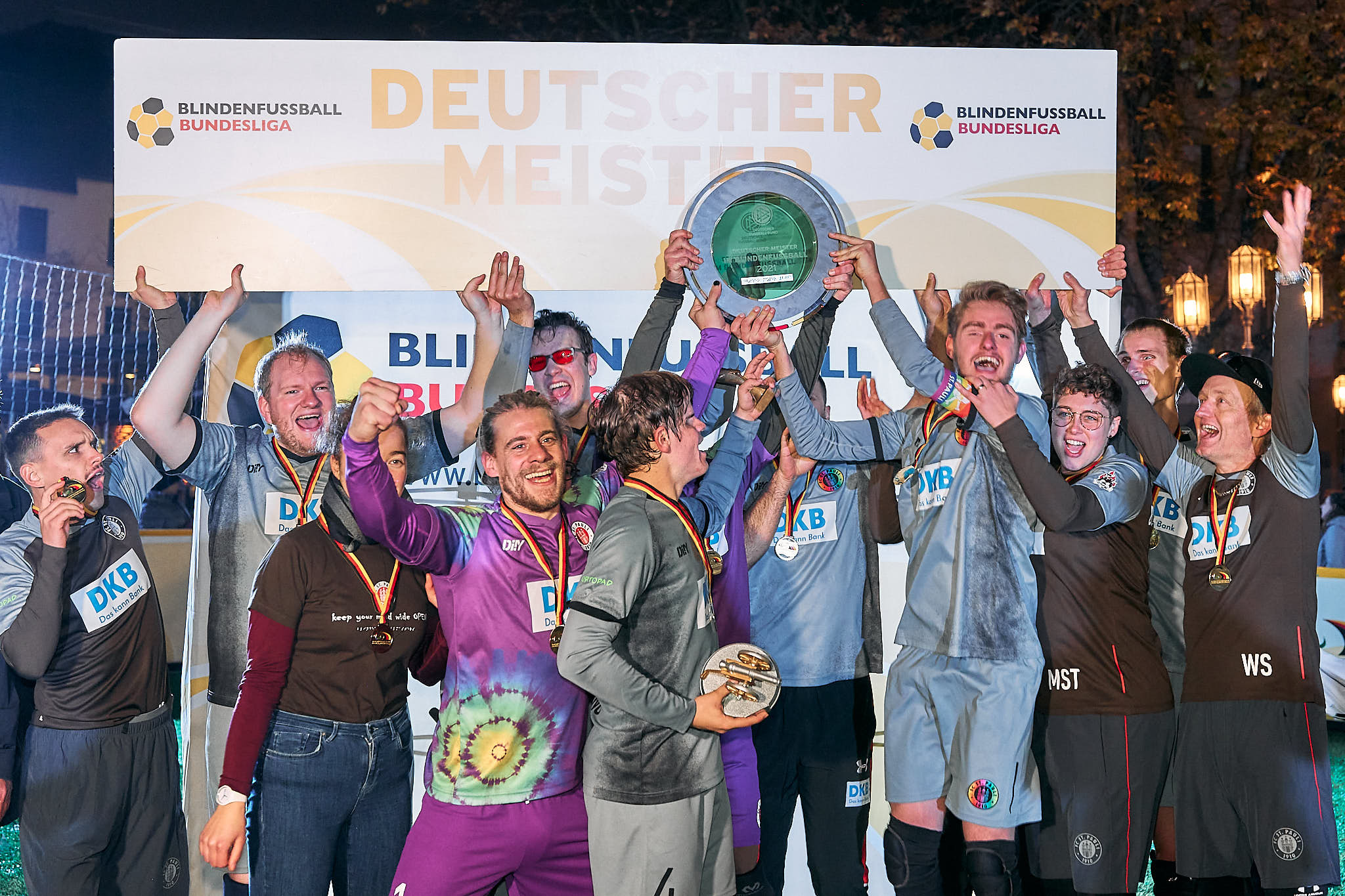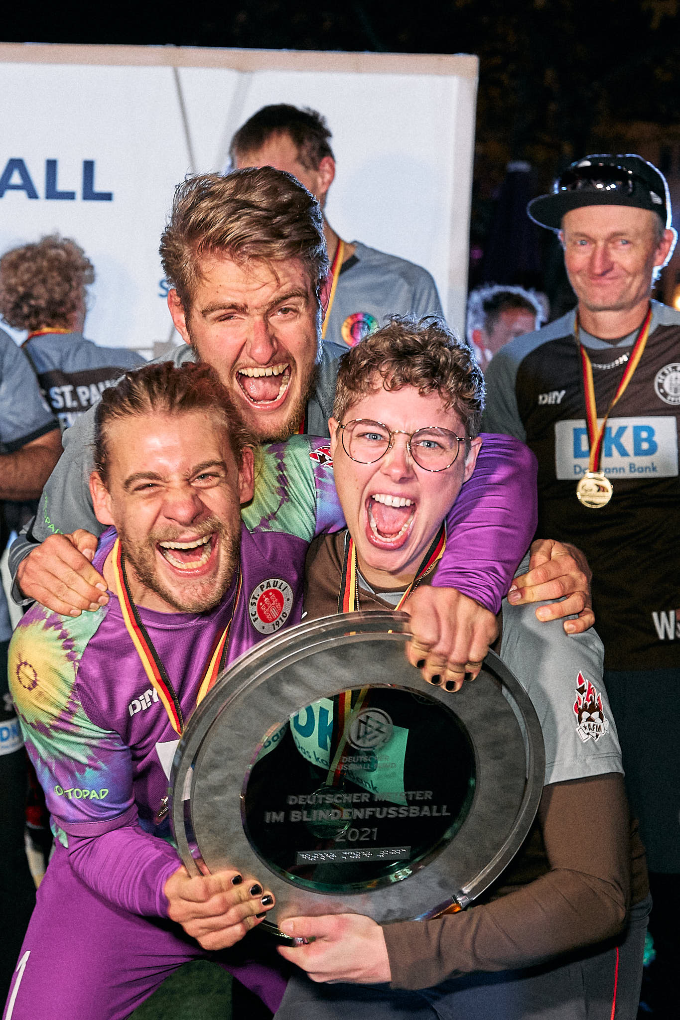 Oft im Stadion gesungen, selten gelungen – doch am letzen Samstag im Oktober ist der FC St. Pauli erneut deutscher Meister im Blindenfussball geworden. Glückwunsch zu dieser grandiosen Saison 2021 an das ganze Team! Nach vier Jahren in Folge auf Tabellenplatz 1, gelang nun die zweite Meisterschaft nach 2017. Die letzten drei Jahre gab es leider immer Niederlagen im Finale, dieses Jahr aber kein solches – oder eben doch. Im letzten Spiel der Saison trafen die beiden Vorjahresfinalisten wieder auf einander. Der FC St. Pauli hatte dabei einen leichten Vorteil, denn in der Tabelle hatten sie vor dem Spiel zwar genauso viele Punkte wie der MTV Stuttgart, aber deutlich mehr Tore bislang geschossen. Letztlich spielte das dann aber keine Rolle, denn der FC St. Pauli beschließt die Saison 2021 als einziges Team der Bundesliga ohne Niederlage. Verdienter kannst du nicht Meister werden!