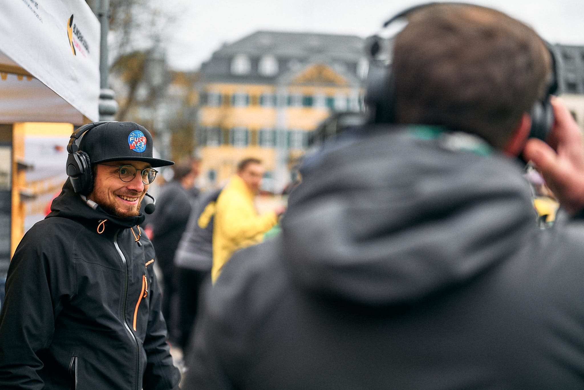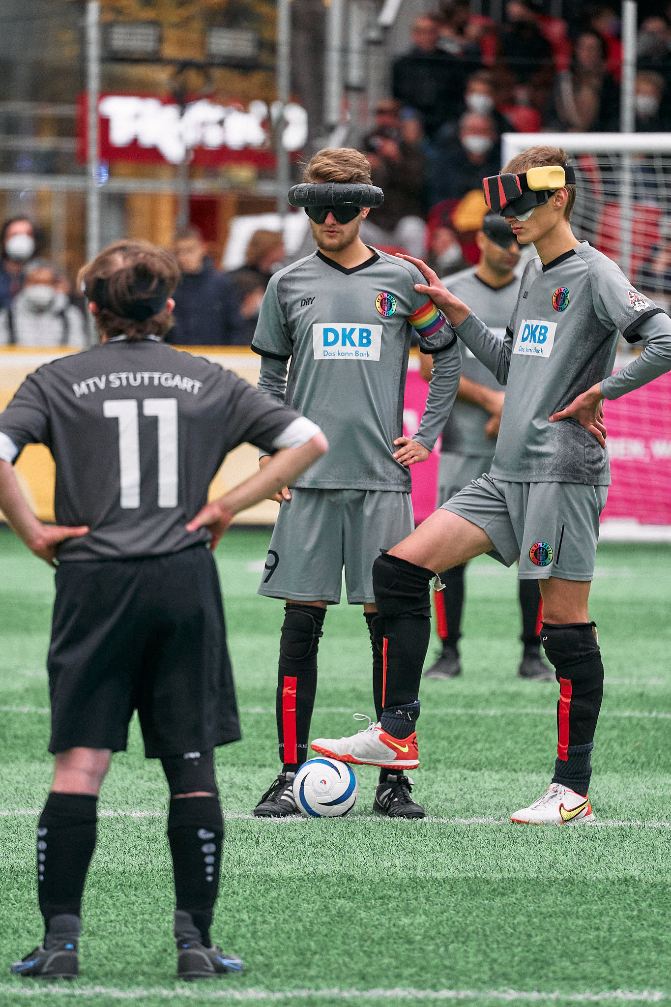Der erste und letzte Spieltag der Blindenfussball-Bundesliga finden immer als Städtespieltag in einem Stadtzentrum statt. Diesmal fand das Finale um die Meisterschaft mitten auf dem Münsterplatz in Bonn statt. Das wurde vom Publikum sehr gut angenommen. Die beiden Tribünen waren gut gefüllt und rings um das Spielfeld standen jede Menge Menschen, die das Geschehen auf dem Platz mit viel Interesse verfolgten. Auch wenn nicht alle sofort verstanden, was da eigentlich auf dem Kunstgrün passierte. So stand irgendwann mal ein Pärchen neben mir und ich schnappte in der Unterhaltung der Beiden auf, dass sie zunächst vermuteten, es handle sich im Virtual Reality Fussball. Schließlich tragen die Spieler ja diese typischen VR-Brillen. Erst als eine der beiden genauer schaute, weil sie die Marke der Brillen nicht erkannte, habe ich sie aufgeklärt. Allerdings war mein Eindruck, dass sie danach noch weniger verstanden.