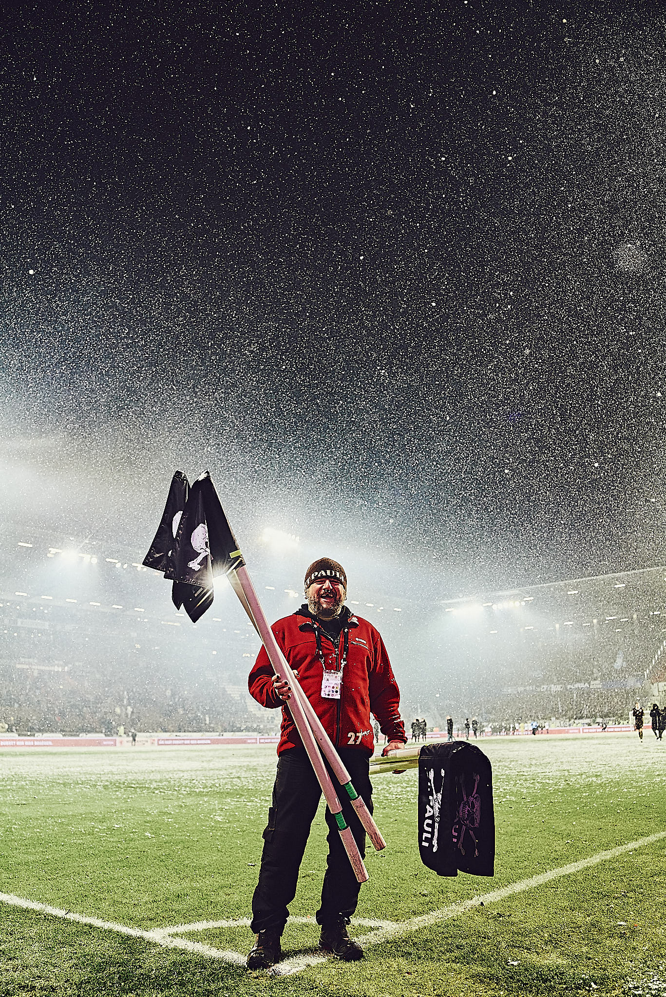 Das Fotografieren am heutigen Abend war durchaus herausfordernd, aber auch schön. Der Schneefall hat die Kameratechnik hin und wieder außer Tritt gebracht und lange Brennweiten haben Grauschleier auf die Bilder gezaubert. Andererseits gab der Schnee den Bildern schöne Strukturen. Naja, man muss bei Sportfotografie außerhalb von Hallen eben nehmen was kommt. Apropos draußen: meine Verkleidung als Michelin Männchen war gegen die Kälte eine gute Tarnung. So musste ich nicht frieren.