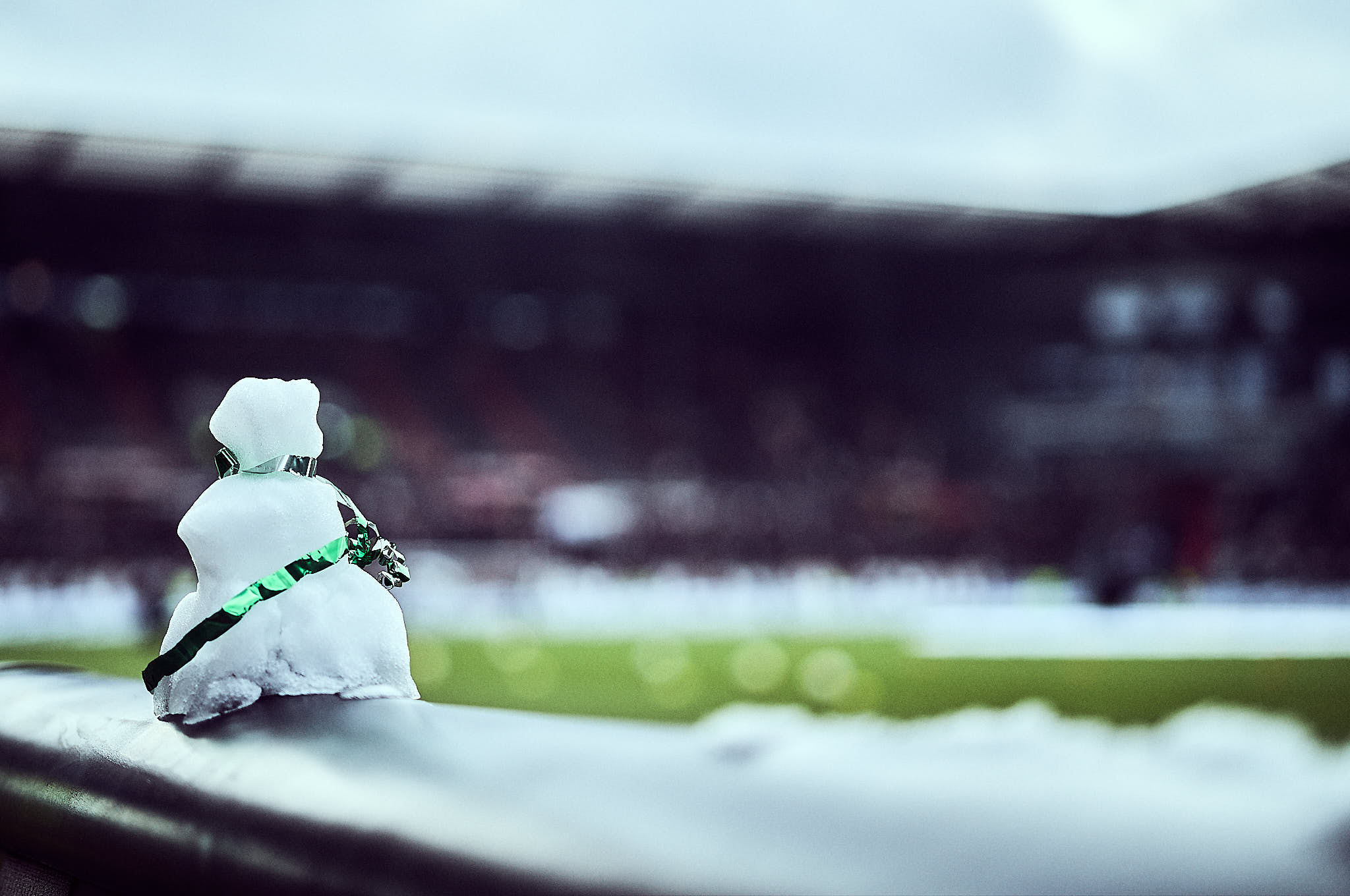 Trotzdem fand ich es überaus interessant, dass es vor dem Spiel vor der Haupt komplett schneefrei und auch muggelig warm war. Die Sonne wärmte im windgeschützten Bereich die Tribüne auf. Vor der Gegengerade lag auf dem Weg zwischen Rasen und Rängen noch Schnee. Trotz Sonnenschein pfiff ein kalter Wind und der Schnee auf den Werbebanden hielt sich auch bei Plustemperaturen bis zum Spielschluss. Also von mir aus darf der Frühling nun kommen.