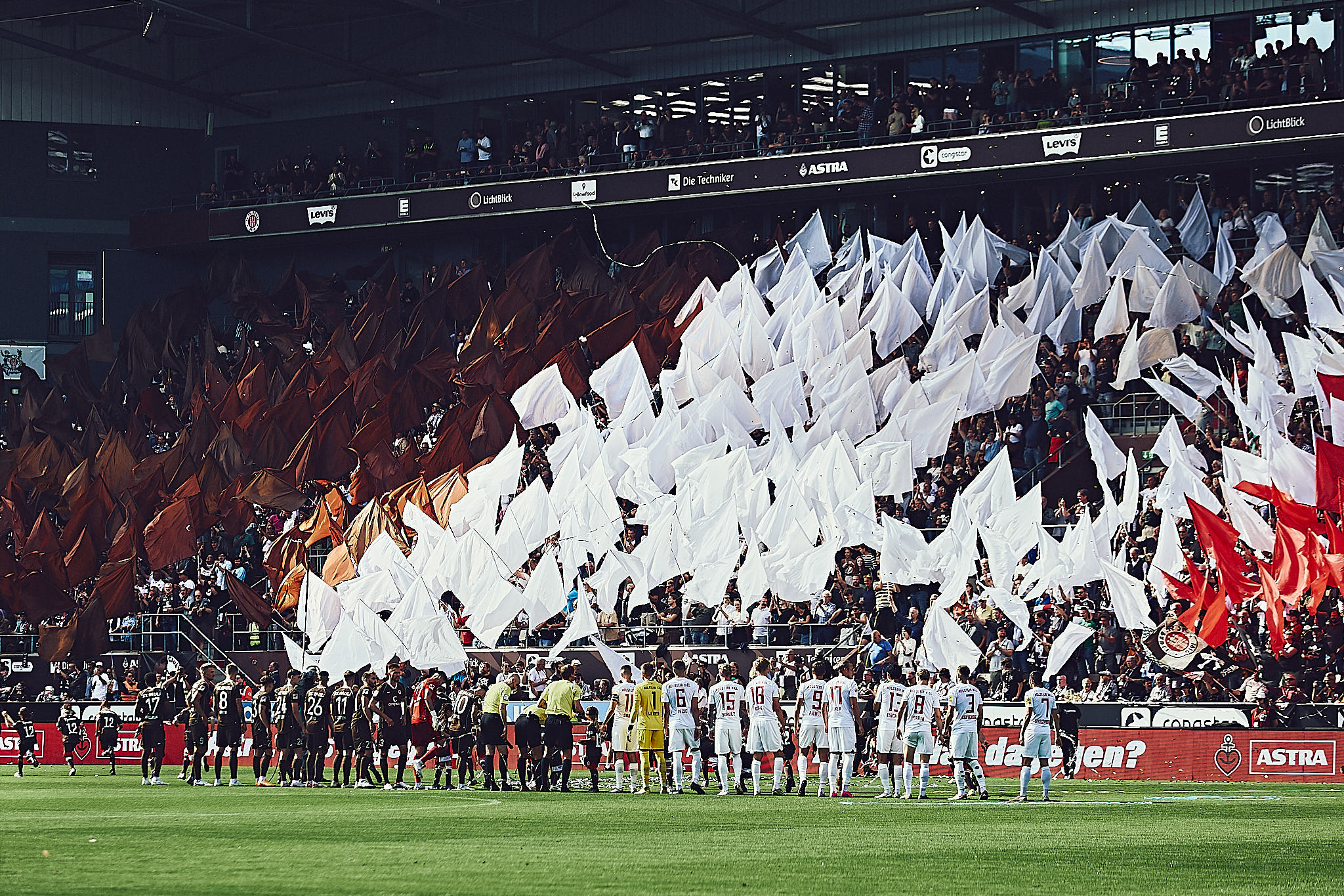 Eine große Bandbreite auf den Ränge, aber wenig auf dem Platz. Da war das Spiel nach gefühlten 8 Minuten entschieden. Da führte der FC St. Pauli schon 2:0 gegen Holstein Kiel. Nach mehreren Nullnummern am Millerntor war es das Spiel der Fernschüsse. Die Taktik lautete offensichtlich, statt wunderschön, aber erfolglos, in der Box zu kombinieren, wurde diesmal einfach von vor dem 16er abgezogen. Das klappte traumhaft. Kiel fand zu keinem Zeitpunkt ein adäquates Mittel, die braun-weißen dauerhaft unter Druck zu setzen. Das war einfach ein sensationell gutes Spiel vom FC St. Pauli.