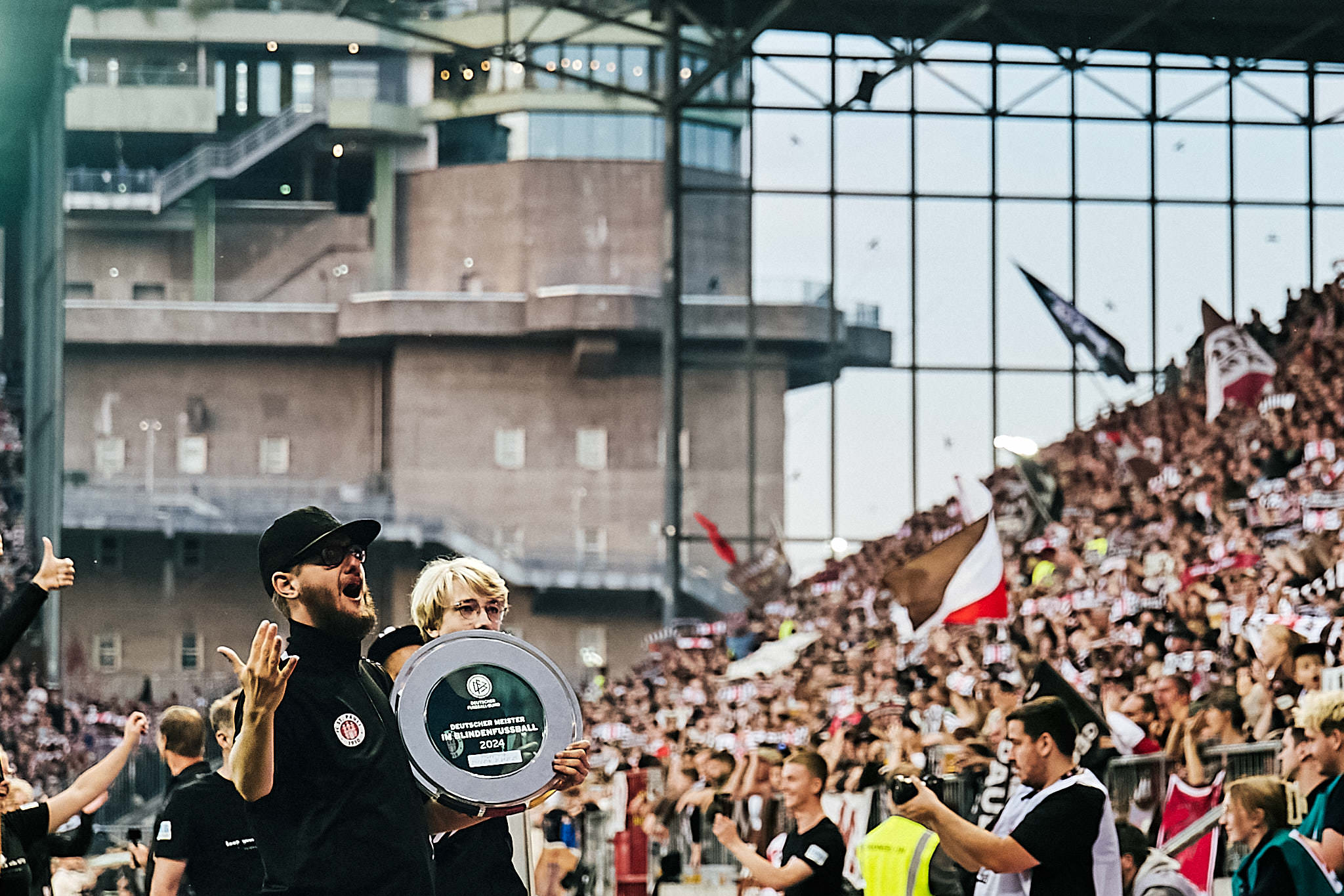 Für mich gab es beim Jubel rund um die Blindenfussballer einen kurzen Schreckmoment. Ein Querschläger vom Schusstraining traf mich beim Fotografieren der Meisterinnen vor der Süd so unglücklich am Kopf, dass die Brille in die eine Richtung und ein Brillenglas in die andere Richtung flog. Natürlich landete genau das Brillenglas von dem Auge mit dem ich fotografiere auf dem Stadionboden. Glücklicherweise trat dann niemand im Getümmel auf Brille und Glas, so dass ich beides wieder notdürftig zusammensetzen konnte. (Nachtrag: hier gibt es ein schönes Video der Feierrunde. Bei 1:23min tauche ich mal kurz fröhlich auf und bei 5:08min kannst du den Ball sehen, der mir die Brille vom Kopf schiesst.)