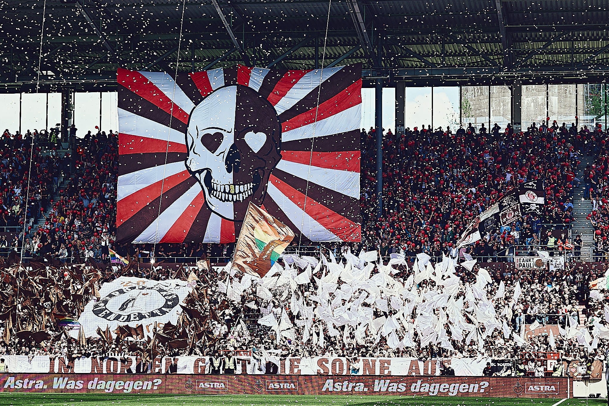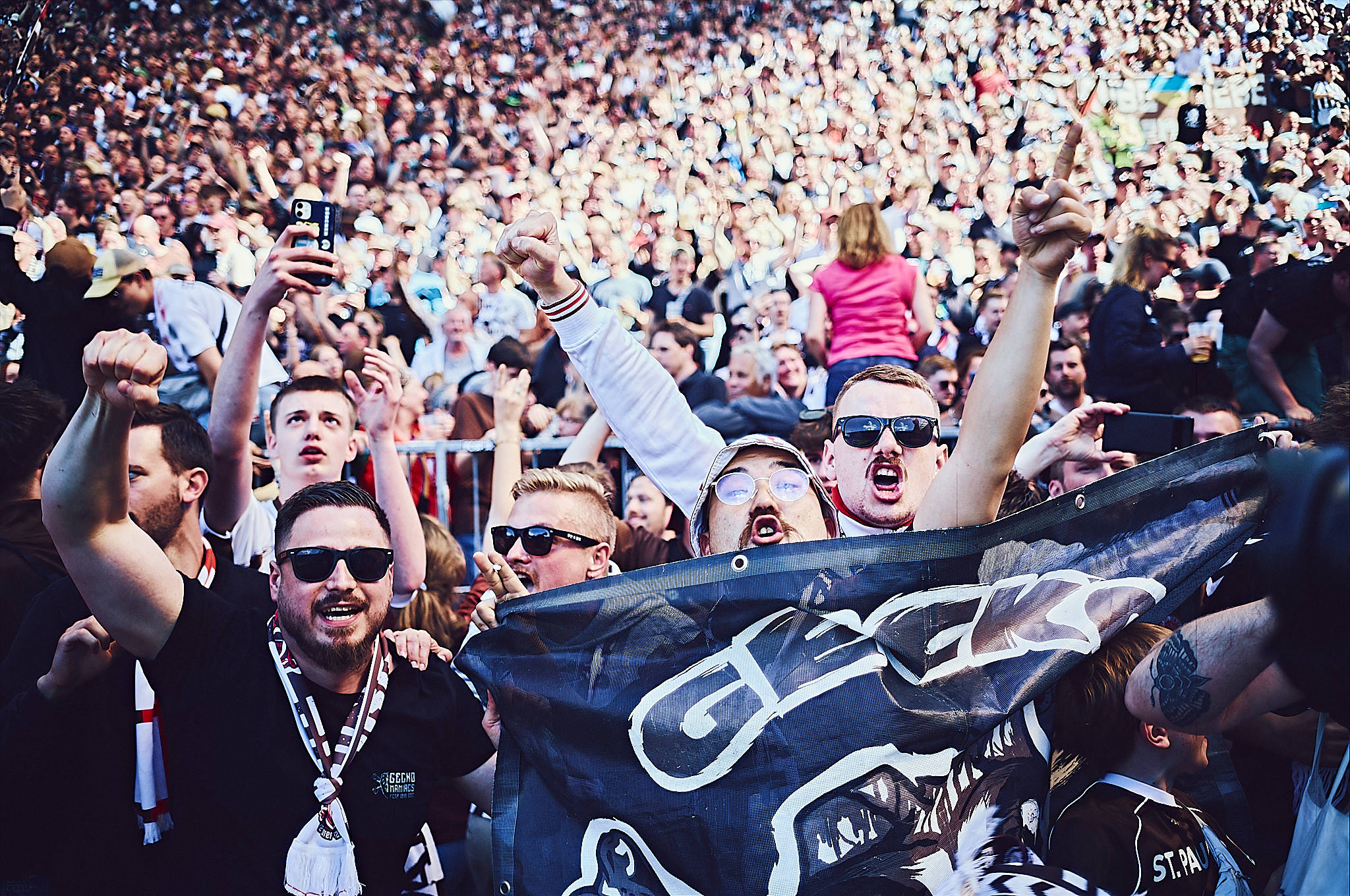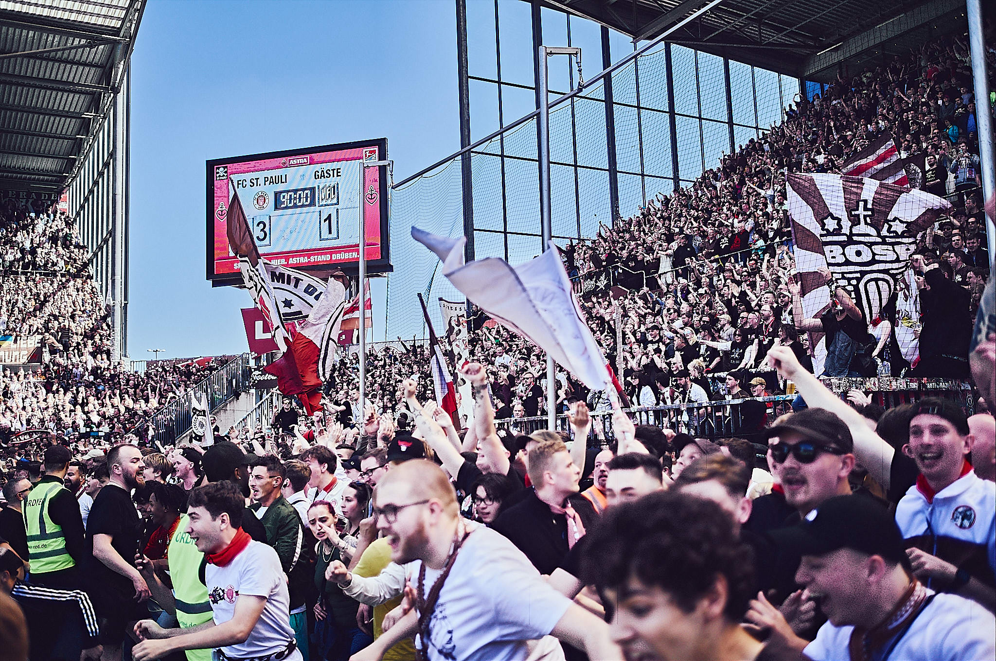Vor dem Aufstieg musste erst noch ein Spiel gegen Osnabrück über die Runden gebracht werden. Ohne despektierlich wirken zu wollen, habe ich niemanden getroffen, der oder die an den für den Aufstieg notwendigen Punkt gegen den Tabellenletzten gezweifelt hätte. Der Verein hatte sogar entsprechend vorgesorgt und die Werbebanden vor der Gegengerade nicht aufgebaut. Gerüchten zur Folge hat der Platzsturm in Leverkusen einige Millionen gekostet, weil die Banden zu Bruch gingen. Dieses Geld hat der Kiezclub natürlich nicht. Für mich hatte das den Vorteil, dass mehr Platz für schönere Perspektiven vorhanden war. Auch wenn diese Bilder heute vermutlich niemanden interessieren.