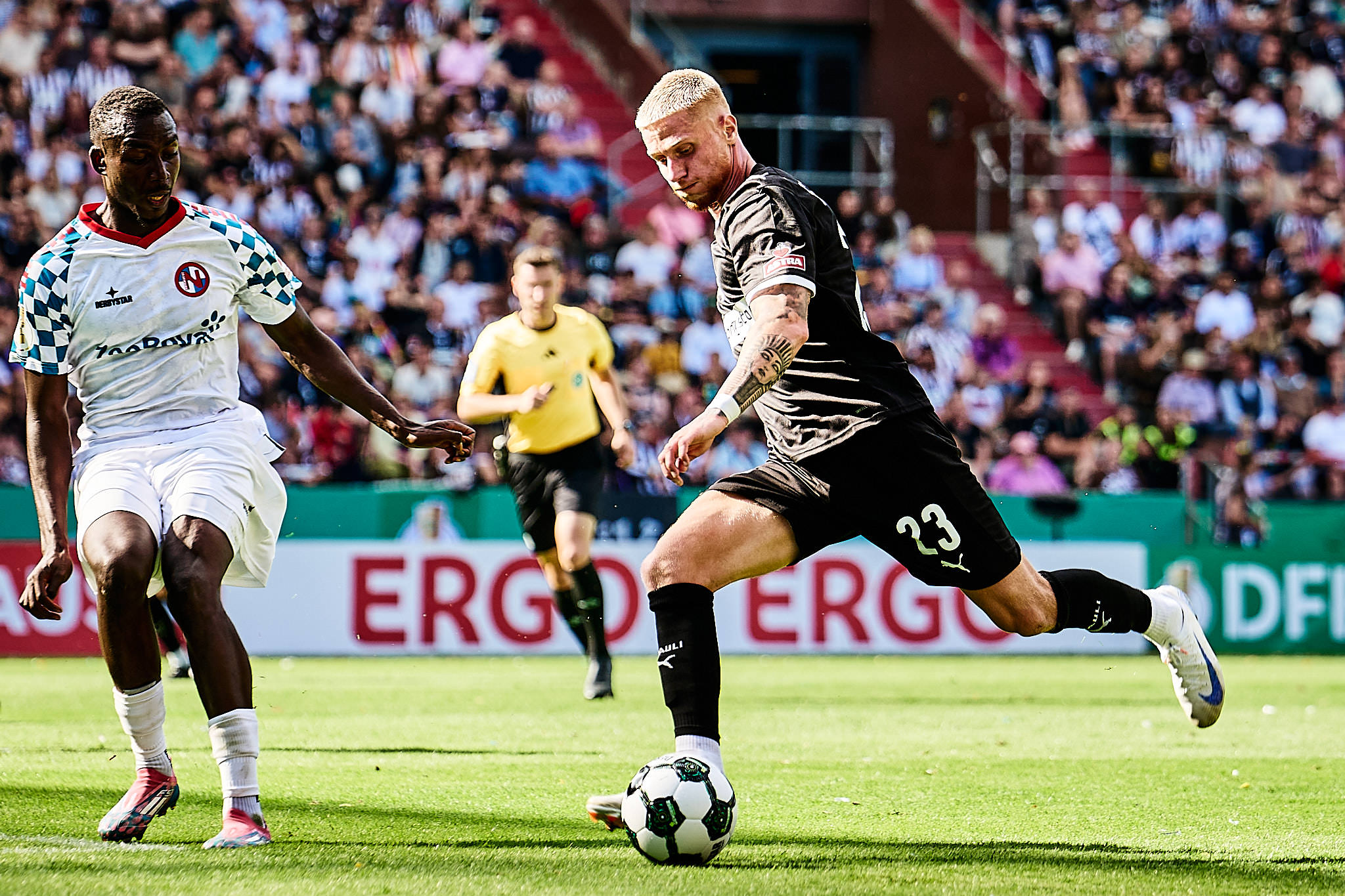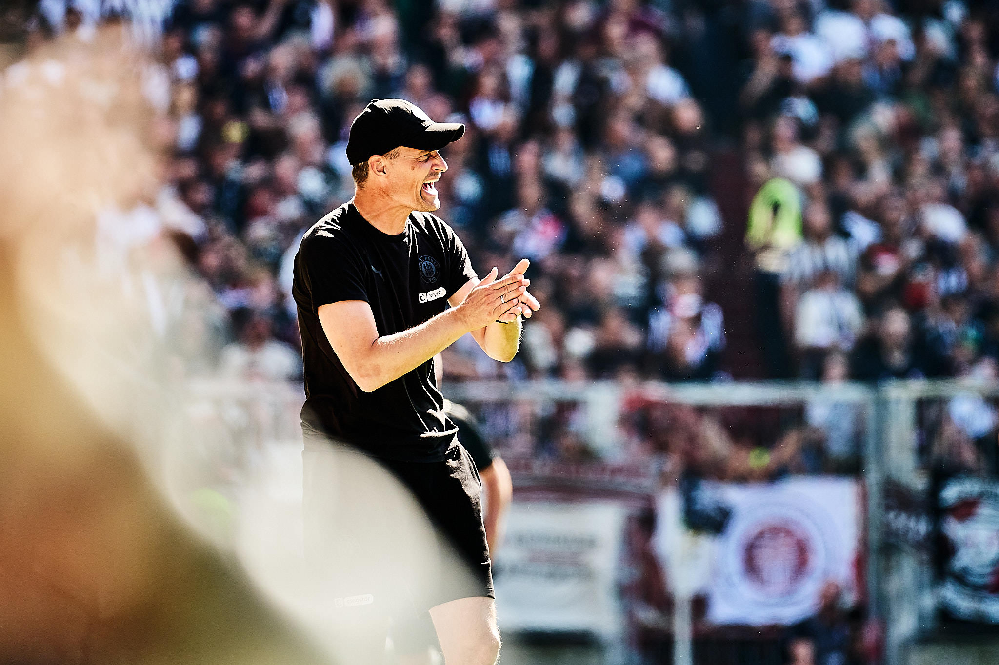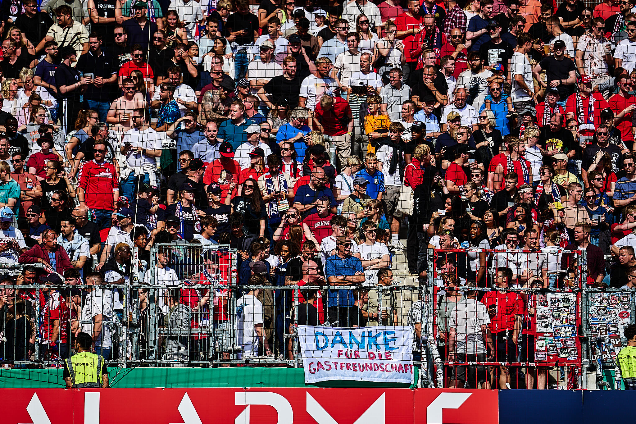 Im DFB-Pokal traf der Stadtnachbar aus Norderstedt in seinem Heimspiel auf den FC St. Pauli im Millerntor. Der Pokal hat eben seine eigenen Gesetze. Deswegen gab es auch andere Werbebanden, die leider noch höher waren, als sie es normalerweise schon sind. Das macht keine schönen Bilder – interessiert aber nur die Fotografinnen. Glücklicherweise gab es keine Banden vor der Gegengerade, weswegen die meisten dort saßen – ich auch.