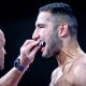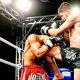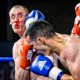 Gleich die ersten beiden der 10 Kämpfe des Abends endeten mit KO. Und ich konnte glücklich twittern, dass ich jeweils die entscheidenden Schläge fotografisch festgehalten hatte. Solche Kampfsportabende zu fotografieren ist immer sehr verschlussverschleissfreudig, denn jeder Schlag könnte der letzte des Kampfes sein. Gleichzeitig möchte man aber natürlich auch spektakuläre Bilder. Bedeutet, dass ich lieber zu oft als zu wenig auslöse, aber trotzdem nicht fortwährend, denn sonst habe ich bei der Bilderflut gar keine Chance mehr durchzusteigen. Letztlich habe ich am Samstag in den rund 4 Stunden der Veranstaltung etwas über 3000 Auslösungen gemacht. Anstrengend ist das Fotografieren übrigens auch, denn Du solltest unter dem untersten Ringseil durchfotografieren. Das bedeutet eine äußerst verdrehte Körperhaltung – und das stundenlang. Ich fühle mich am Tag nach einer Boxveranstaltung immer total gerädert. Letztlich werde ich mit einem besonders hautnahem Erlebnis belohnt.