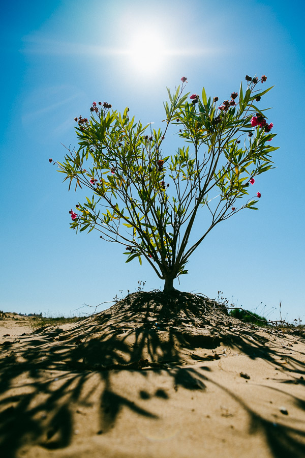Das Bäumchen auf der Düne vor dem Strand zeigt die geringe Anfälligkeit für CAs, aber auch das vorhandene Lensflare bei voller Sonneneinstrahlung. Ich bin aber ehrlich – da kann auch ein Sandkorn oder eine ähnliche Verunreinigung auf der Linse eine Rolle gespielt haben. Es war allerdings so heiß beim Fotografieren des Bäumchens in der glühenden Mittagshitze, dass ich mir zum Zeitpunkt der Bildentstehung dazu keine Gedanken gemacht habe. Und mal ehrlich: ich finde das Flare gut, weil es den Hitzeeindruck verstärkt.